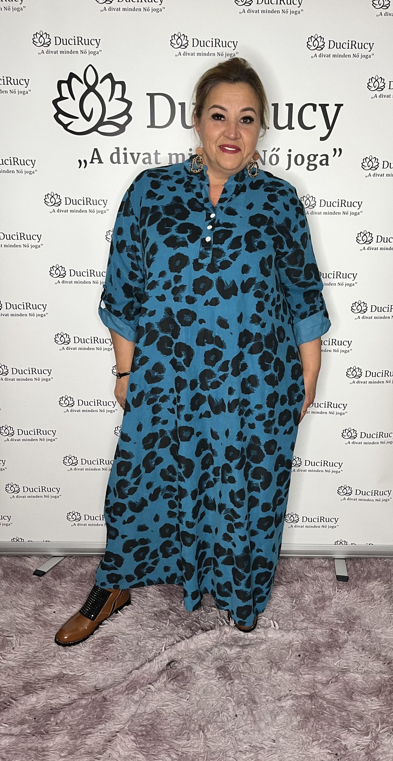 Kord anyagból készült, nyak résznél gombos, állatmintás, A vonalú, zsebes maxi ruha. A ruha anyaga nem rugalmas.