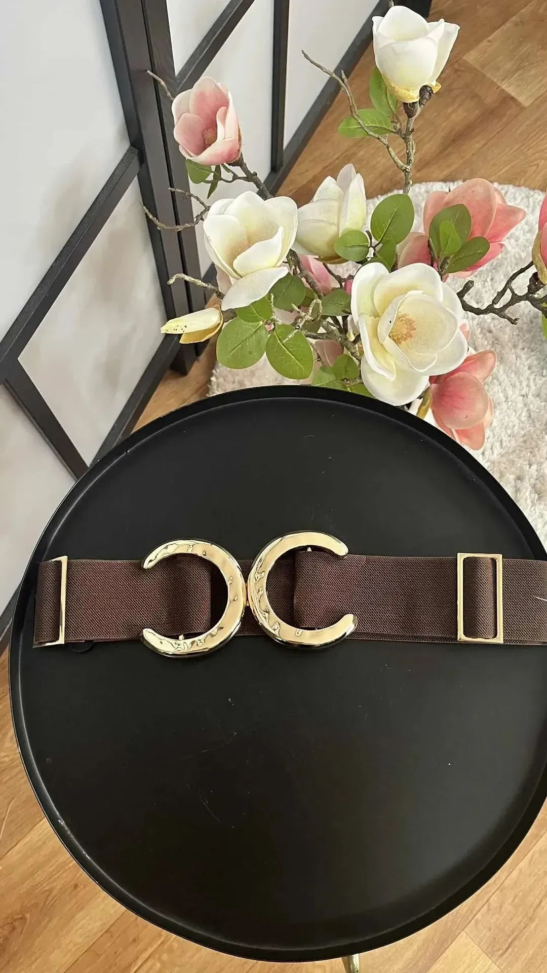 Állítható gumis öv, nagy arany csattal.