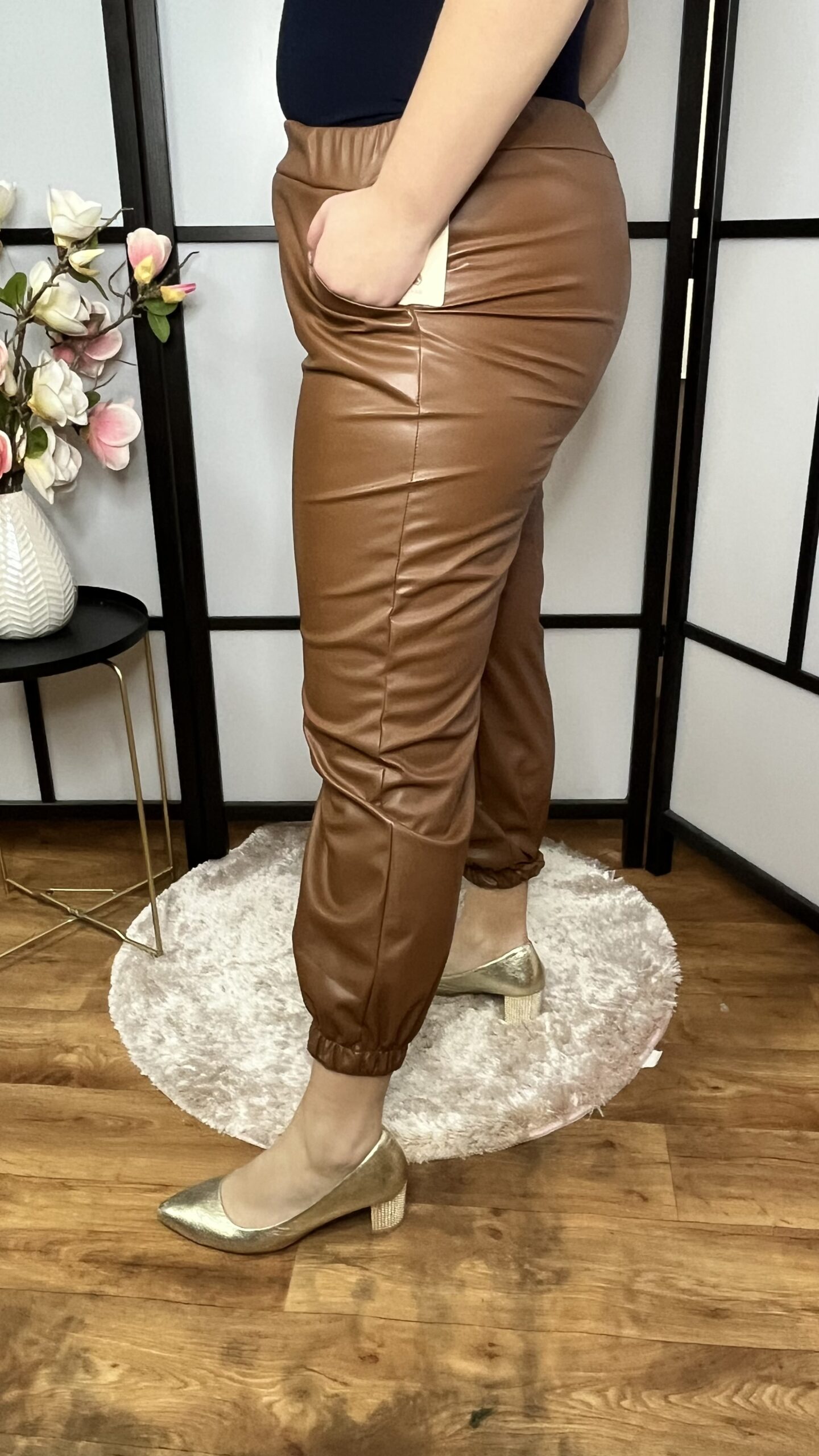 Alul gumírozott és gumis derékkal készült rugalmas műbőr nadrág tevebarna színben