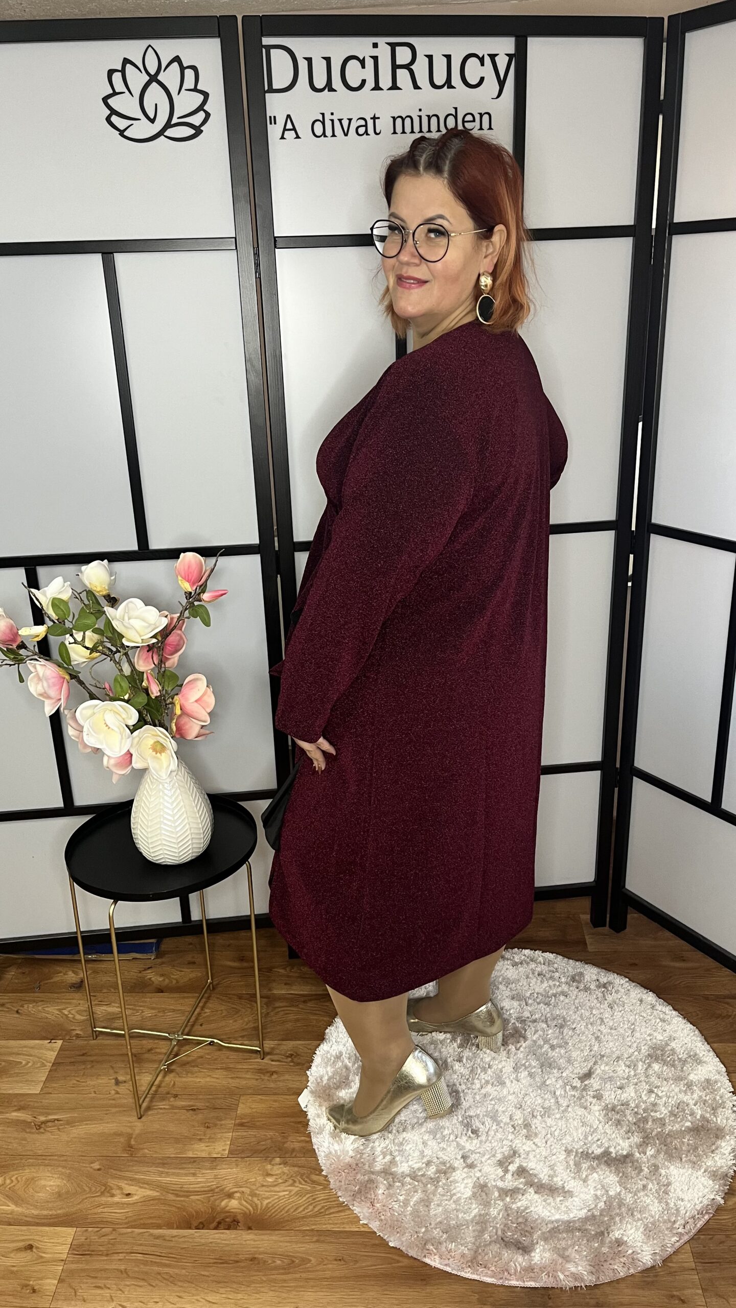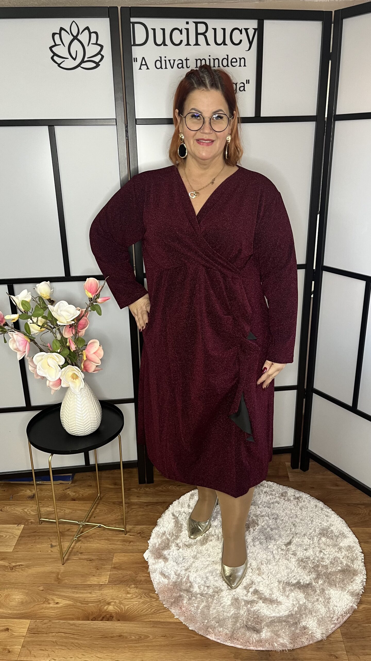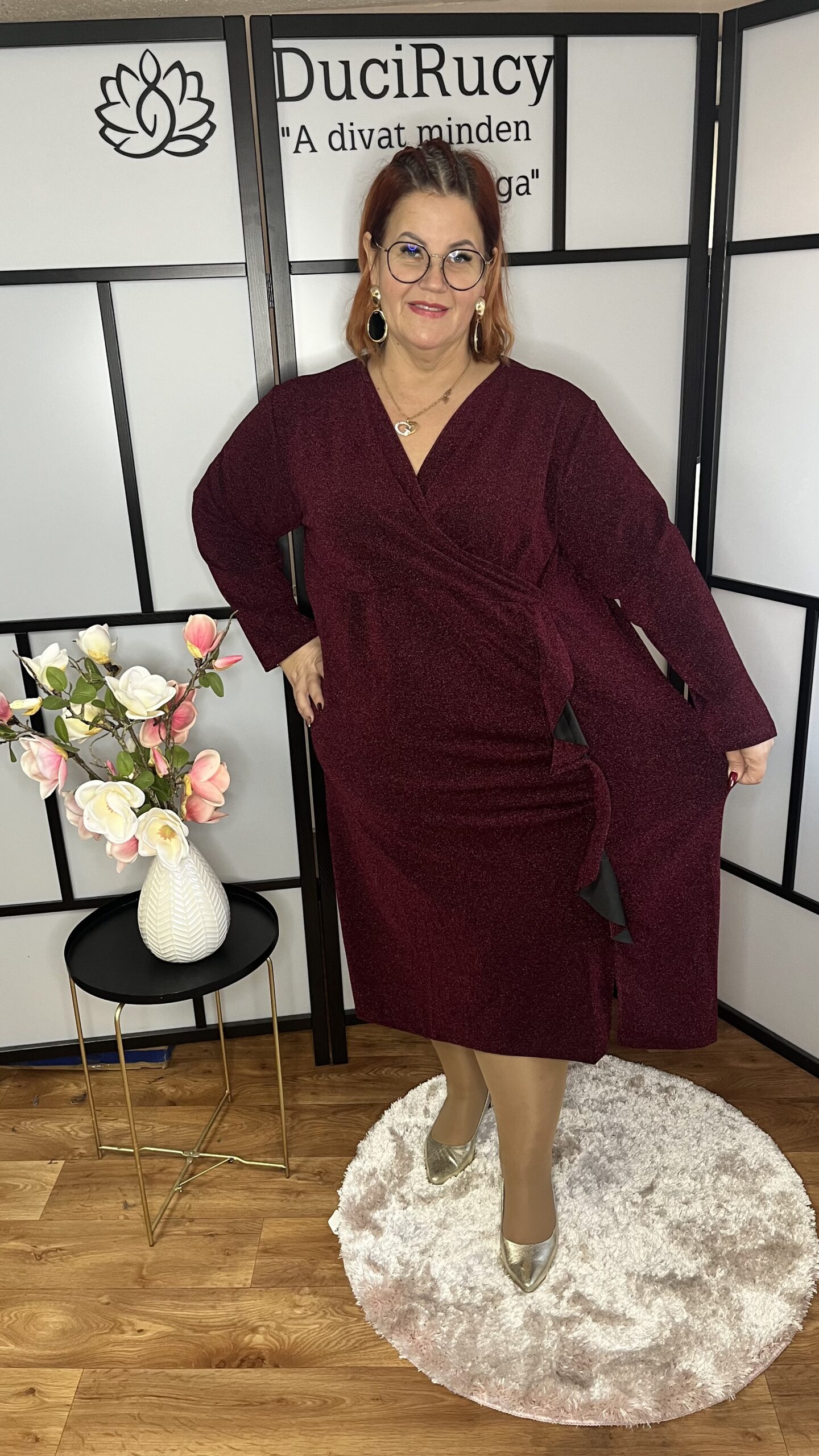 Átlapolt lurex, fodorral díszített alkalmi ruha bordó színben