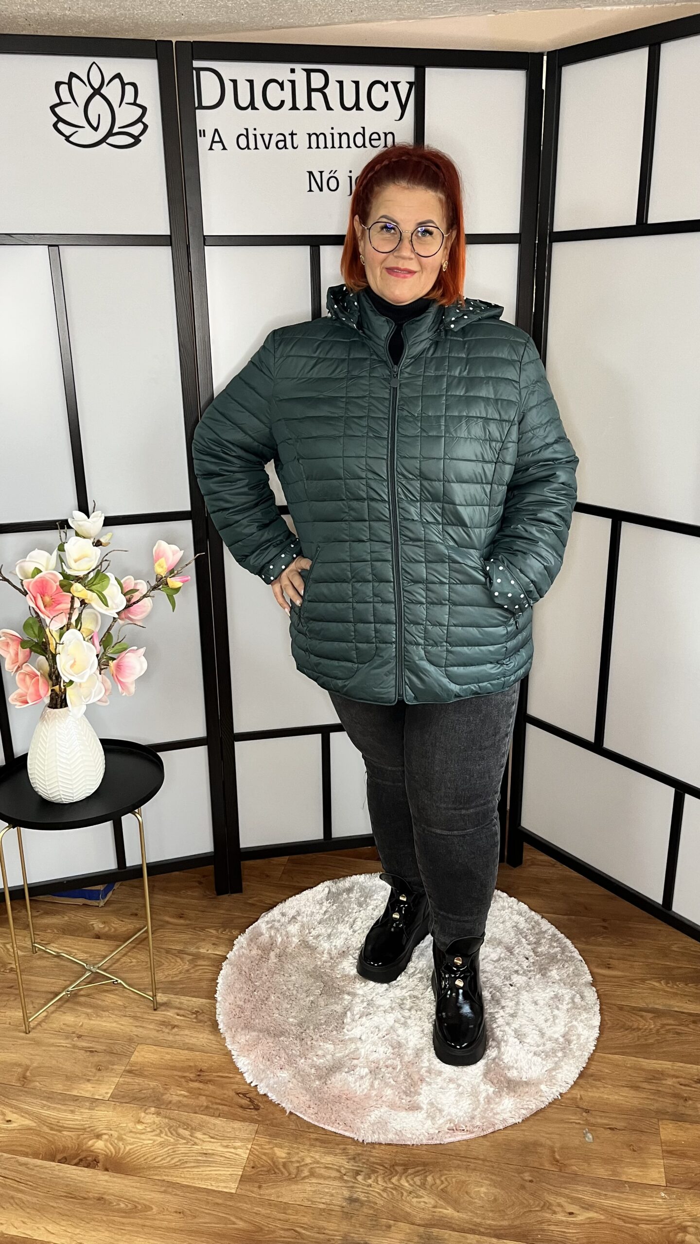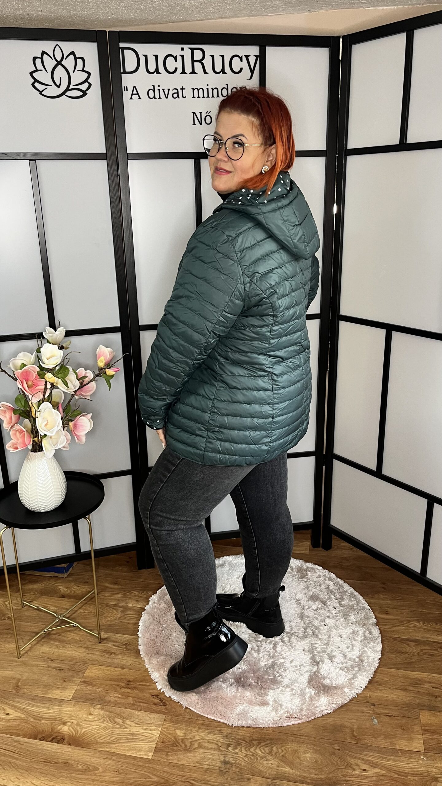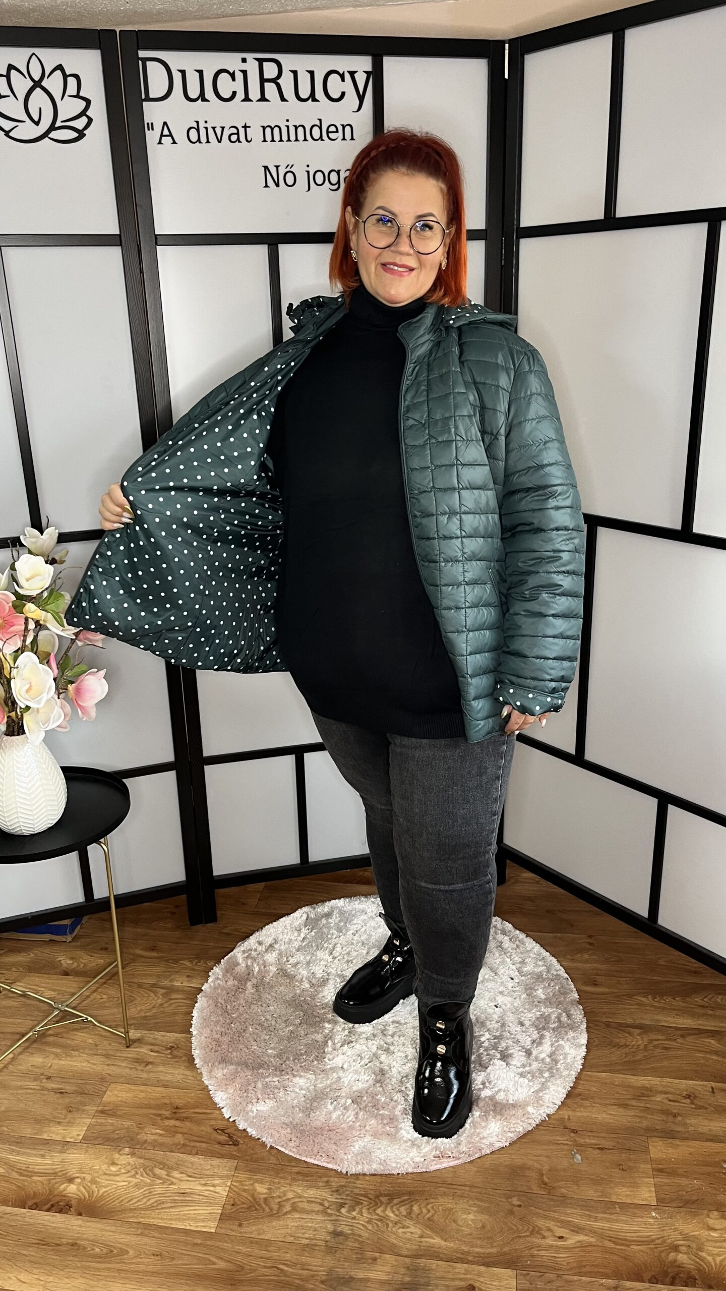 Belül pöttyös, kapucnis, steppelt átmeneti kabát. A kapucni levehető.