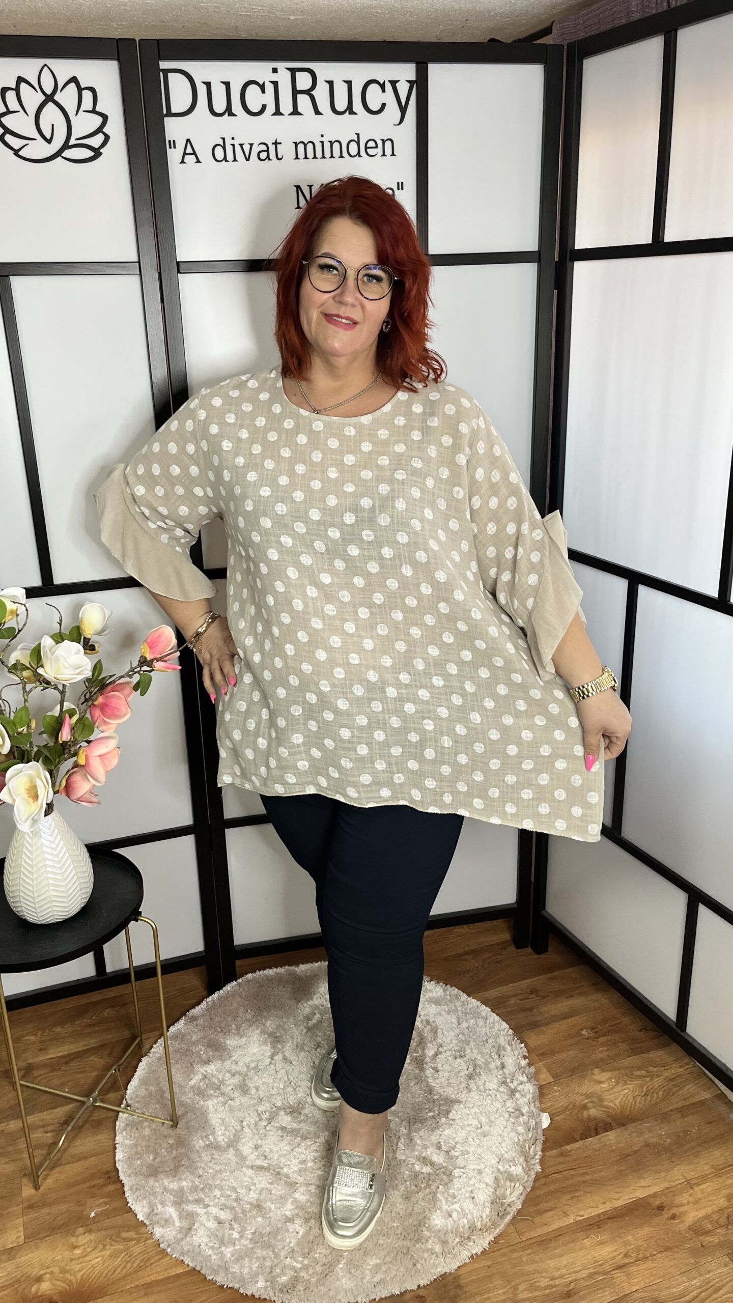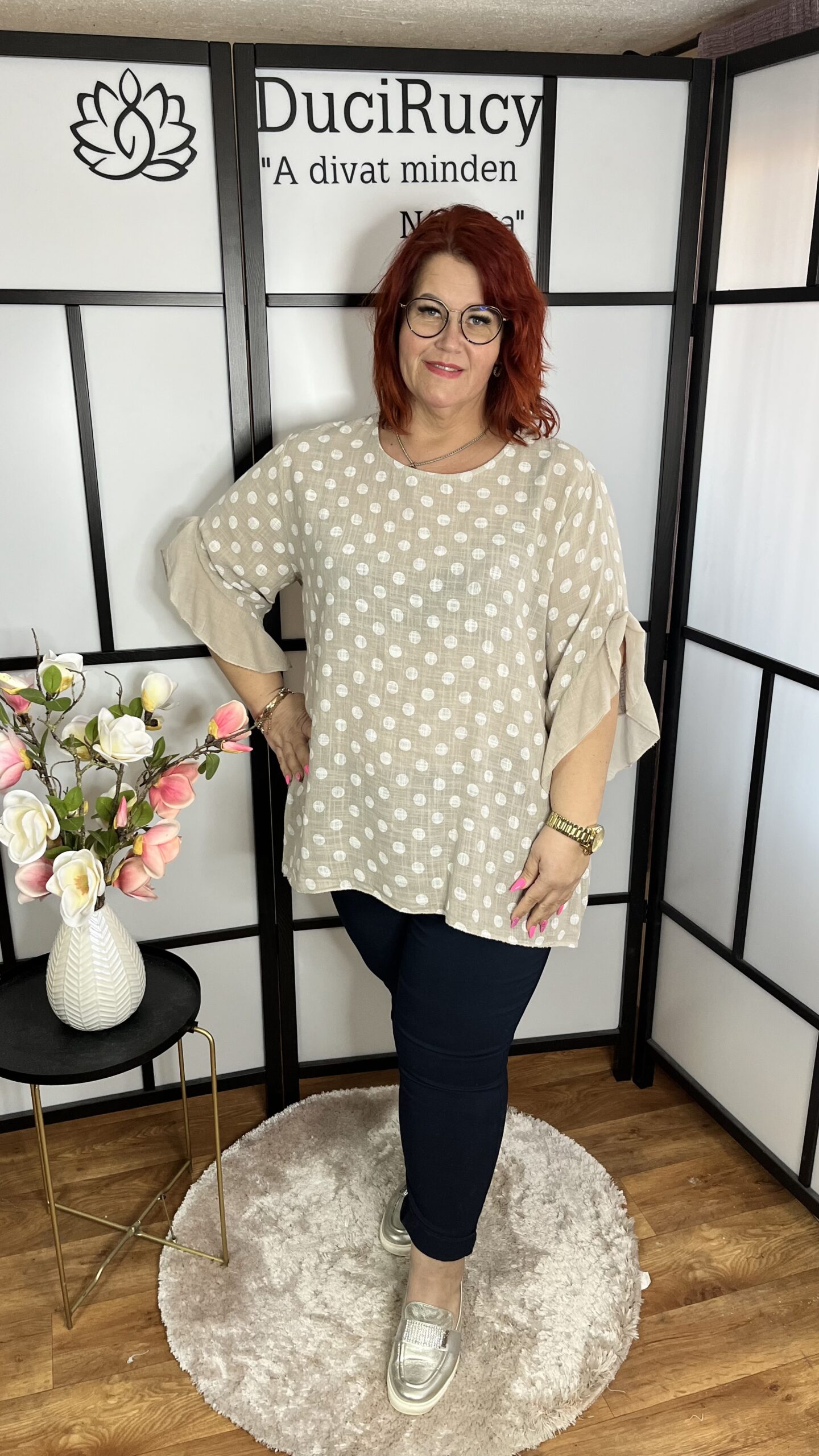 Bézs színű, kerek nyakú, pöttyös, fodros ujjú, lenvászon tunika