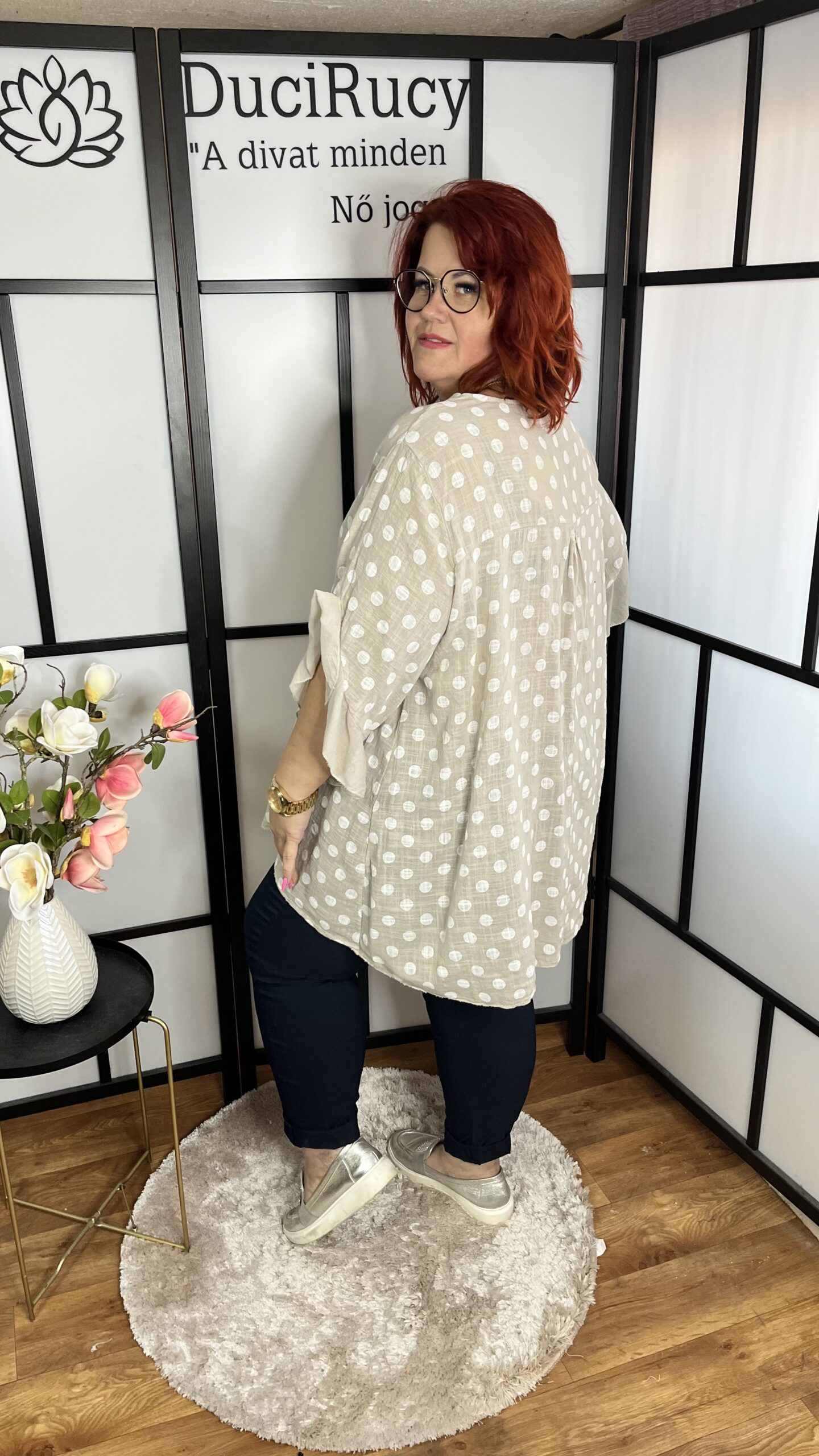 Kerek nyakú, lenvászon anyagú, fodros ujjú, pöttyös tunika. Az anyaga nem rugalmas, nagyon kellemes lenvászon.