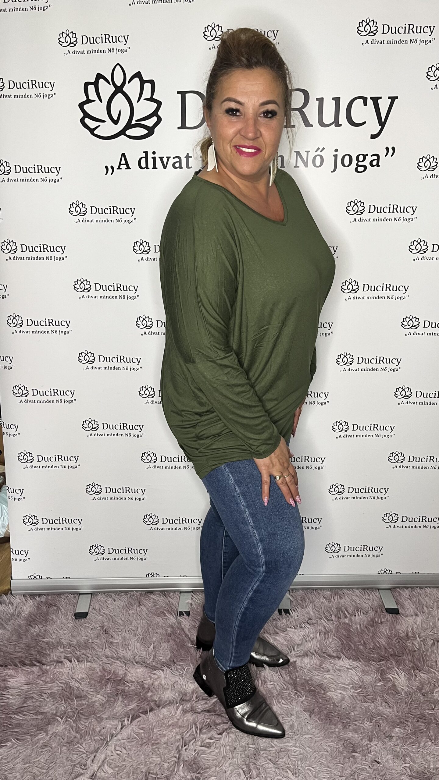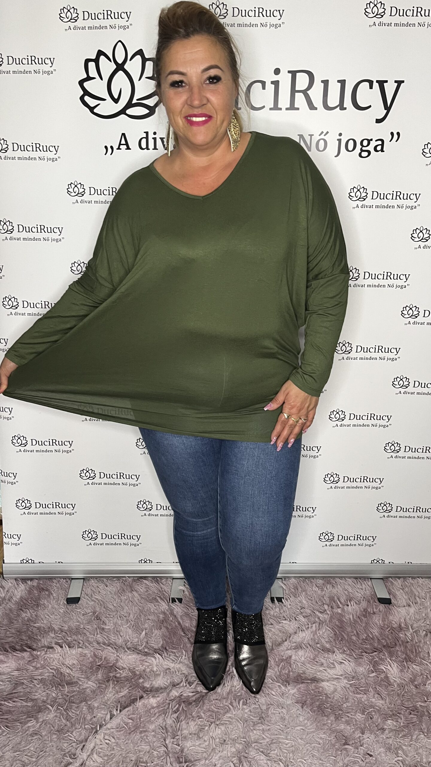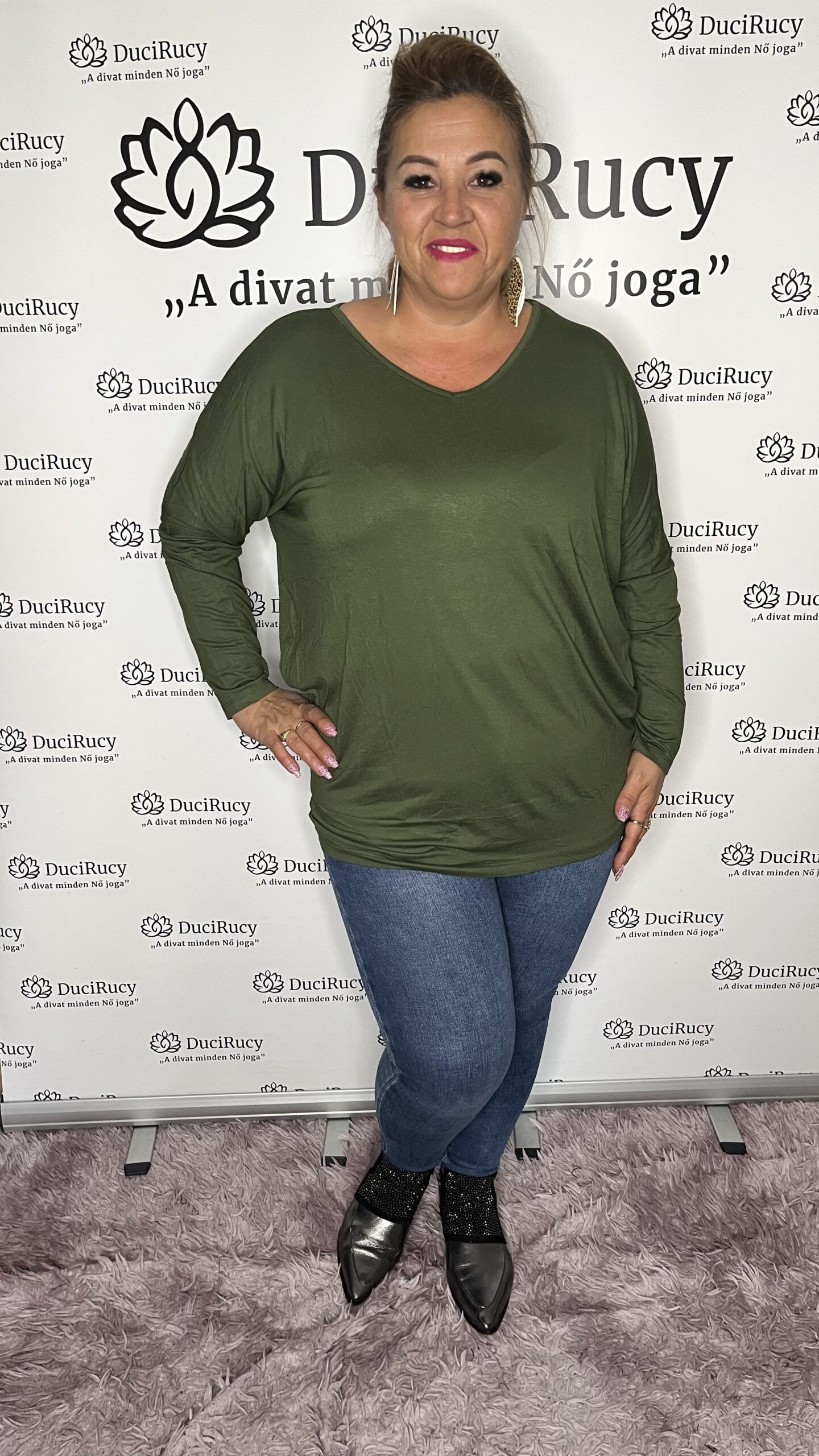 Bubble fazonú (T-ujjú), V nyakú, vékonyabb pamut anyagú felső keki színben