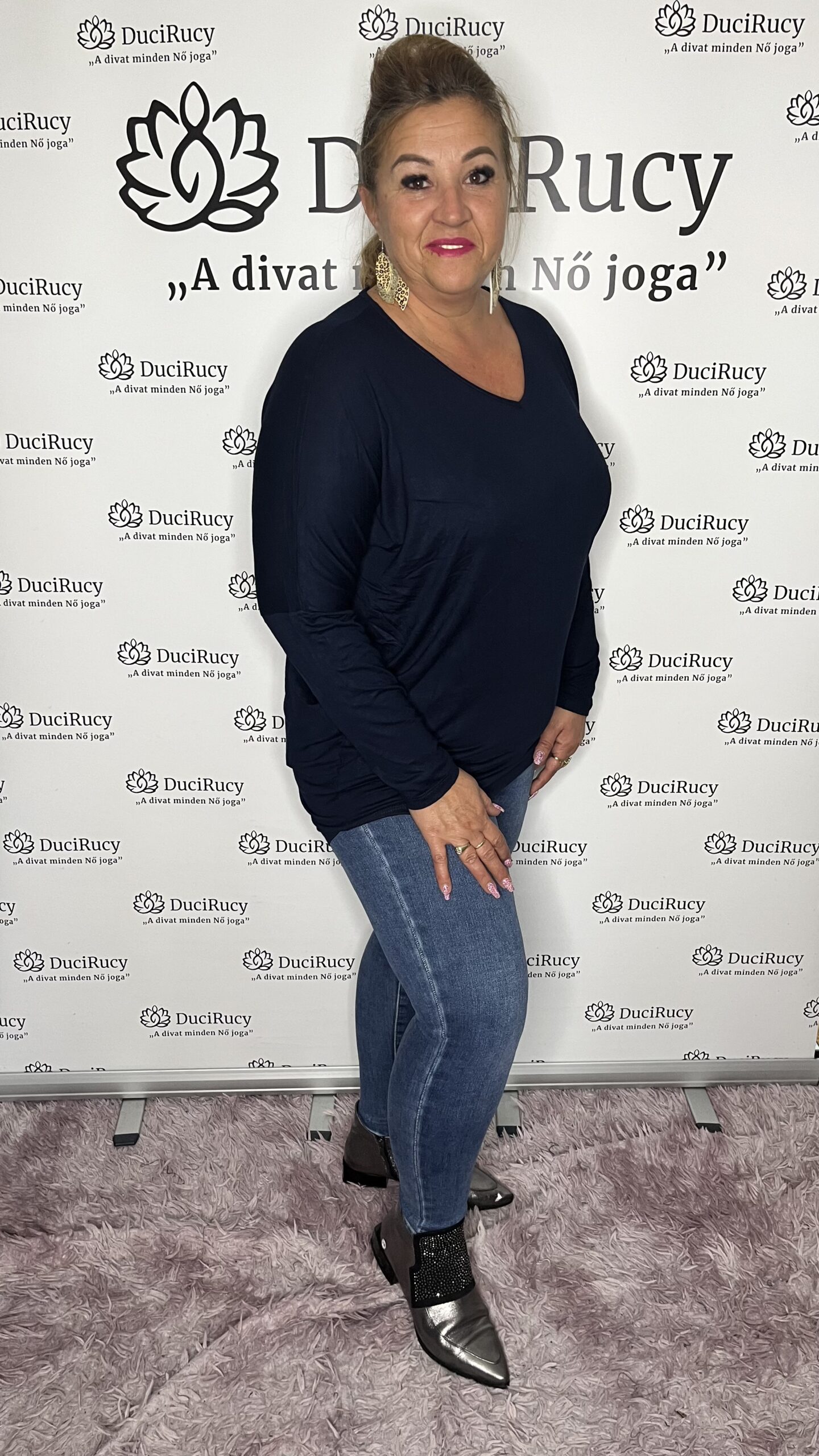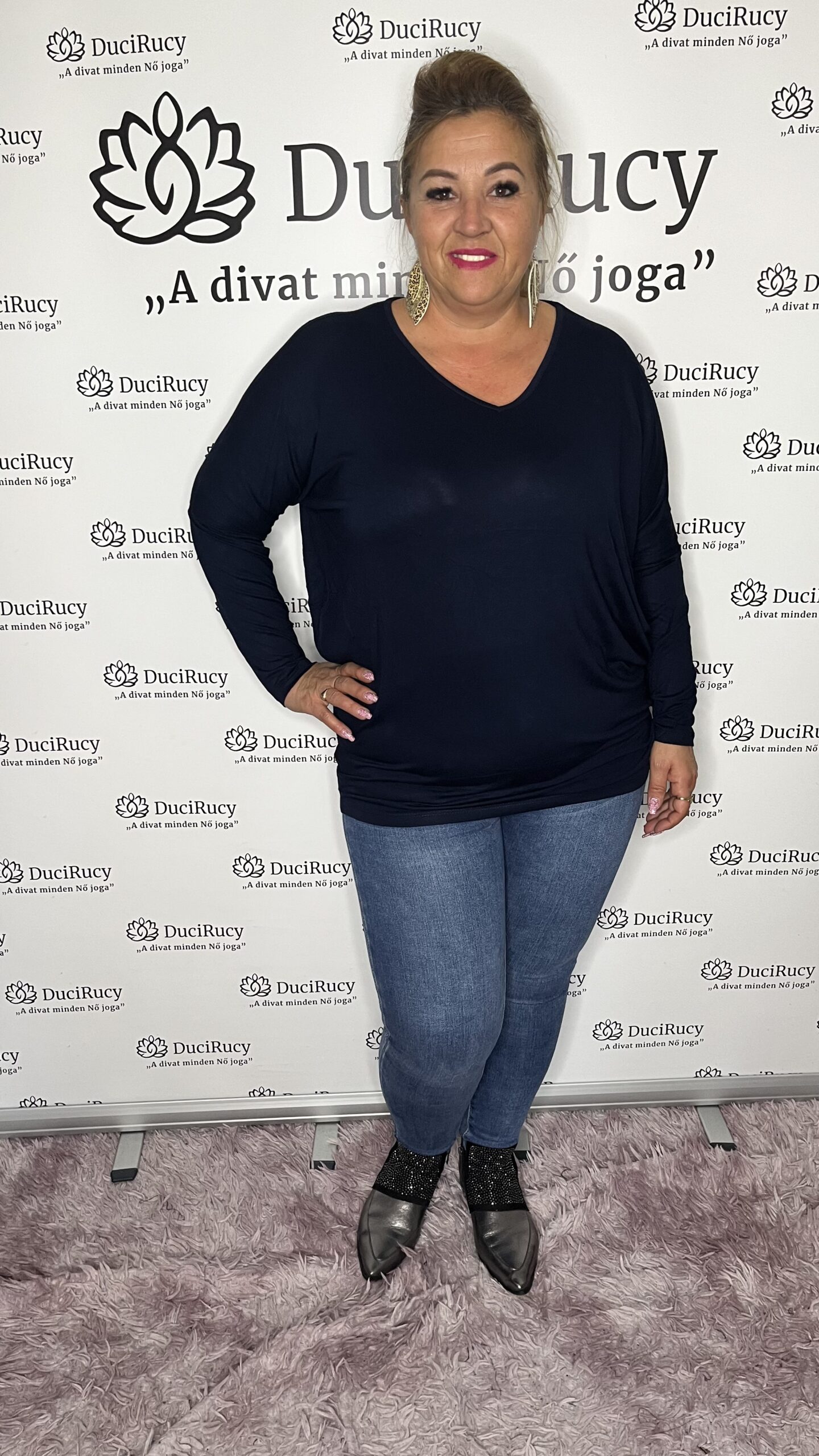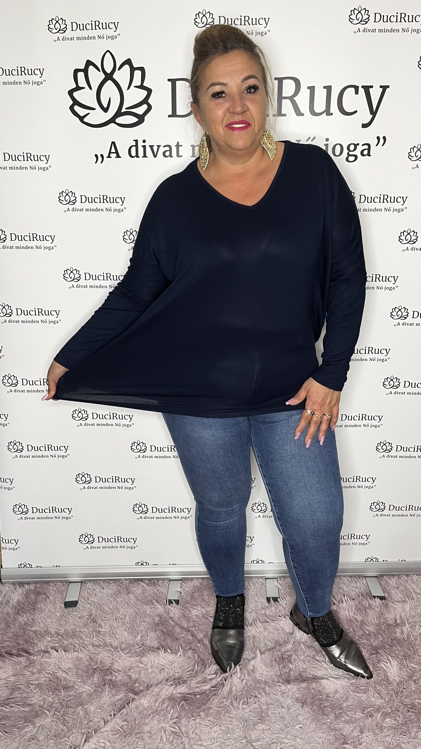 Bubble fazonú (T-ujjú), V nyakú, vékonyabb pamut anyagú felső sötétkék színben