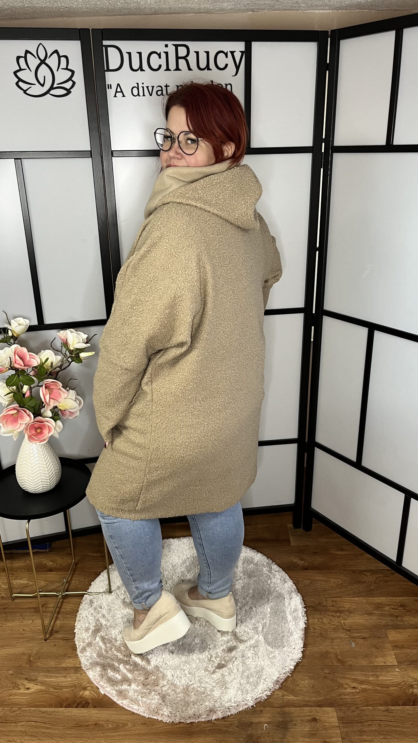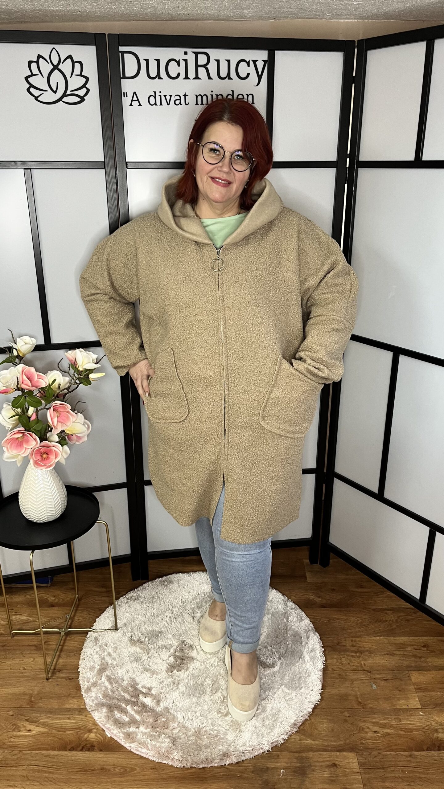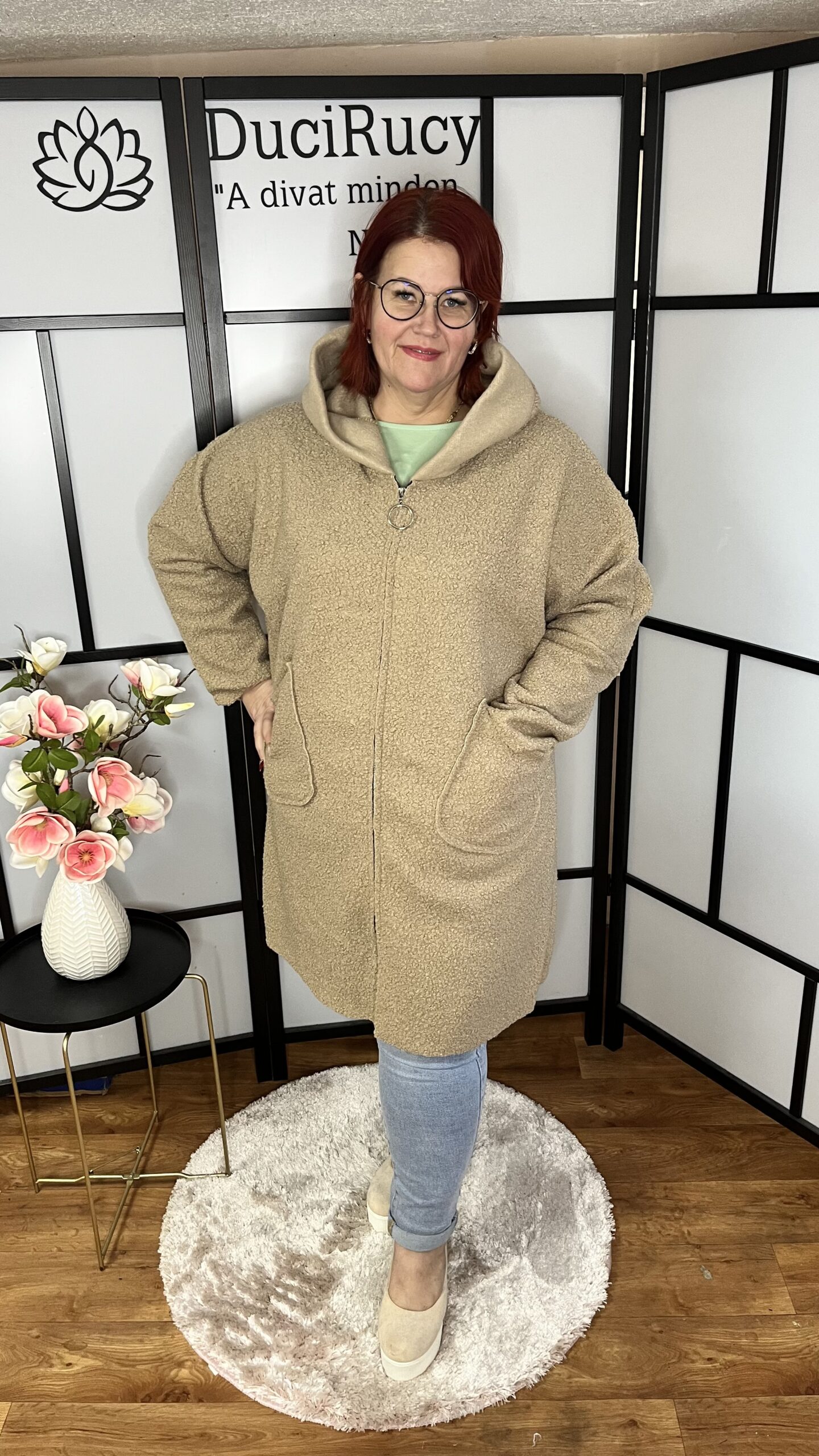 Buklé anyagú elől két zsebes, kapucnis kabát/kardigán. Nagyon kellemes viselet, ősszel közkedvelt ez a típusú kardigán/kabát.