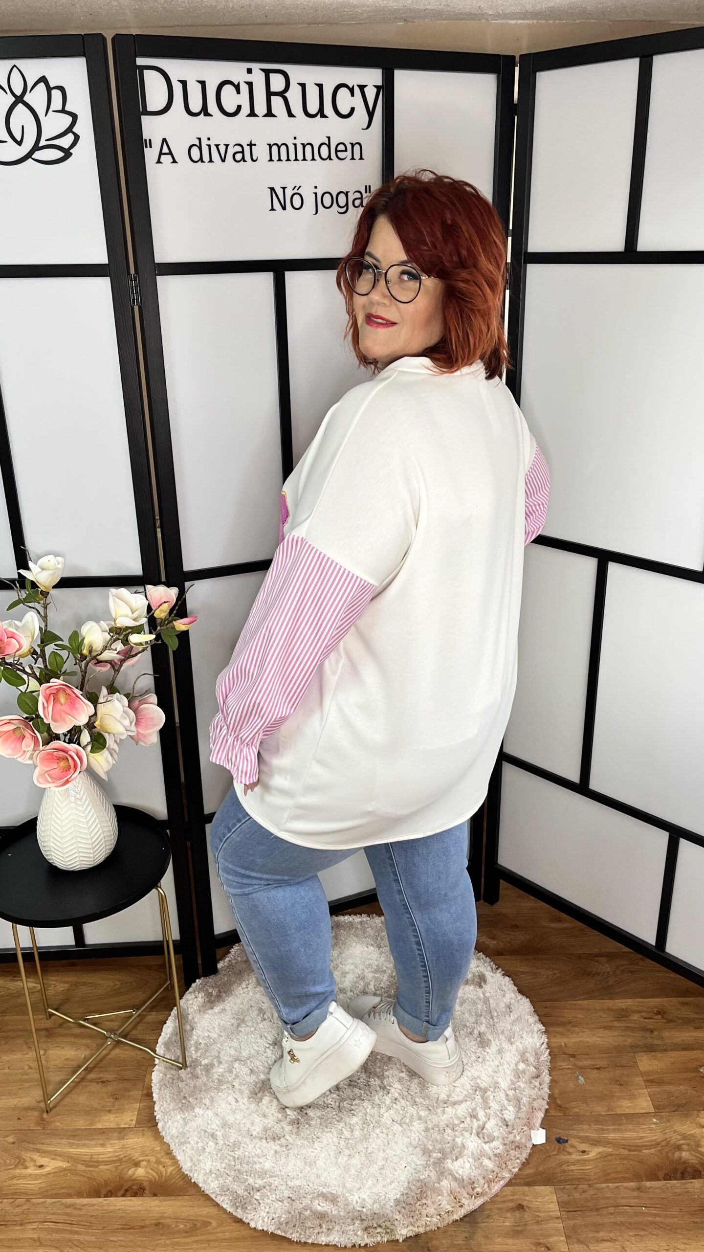 Elegáns, V nyakú, elején nagy virágmintával díszített tunika csíkos ingujjal. Igazán trendi és különleges darab. Bármilyen alkalomra kiváló választás.