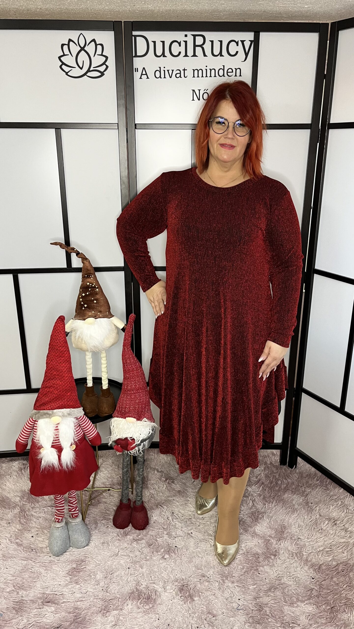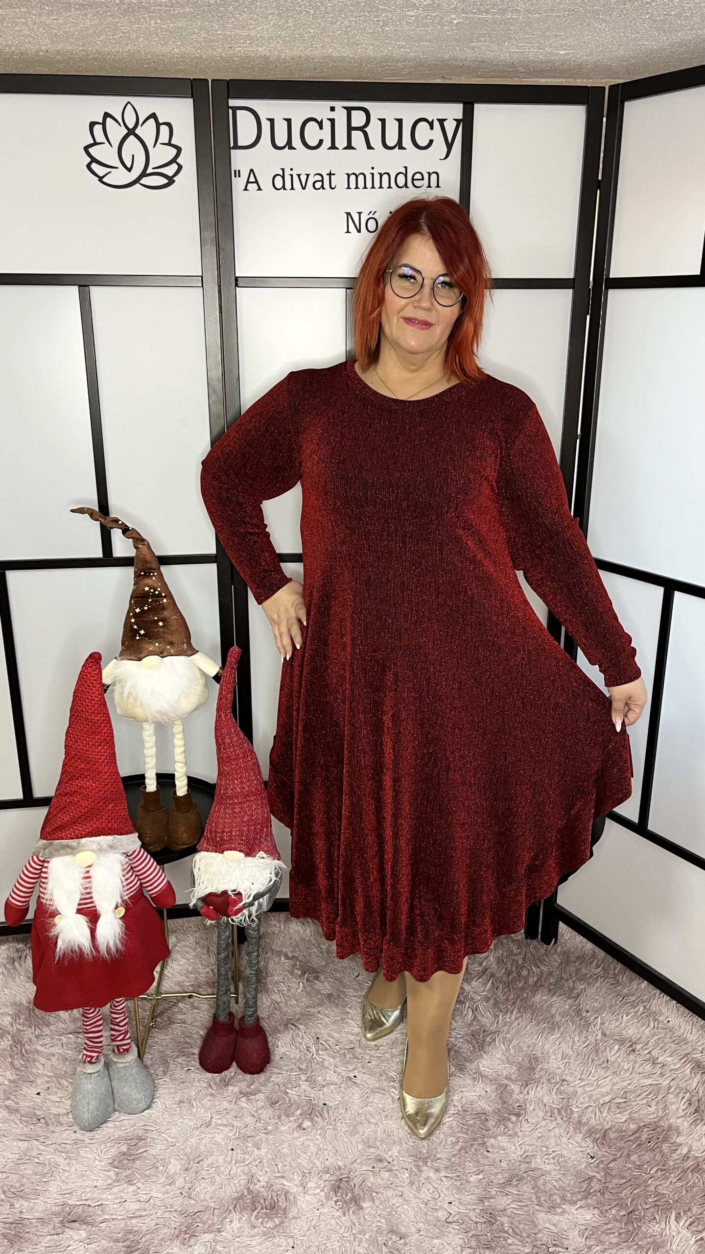Csillámos anyagból készült alul fodorral díszített ék alakú ruha bordó színben
