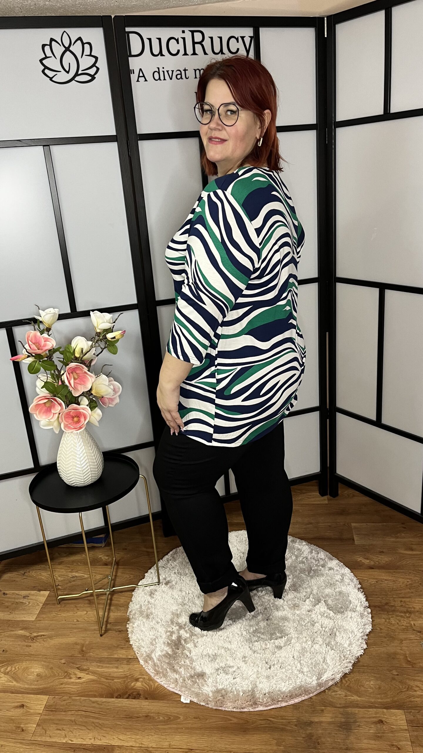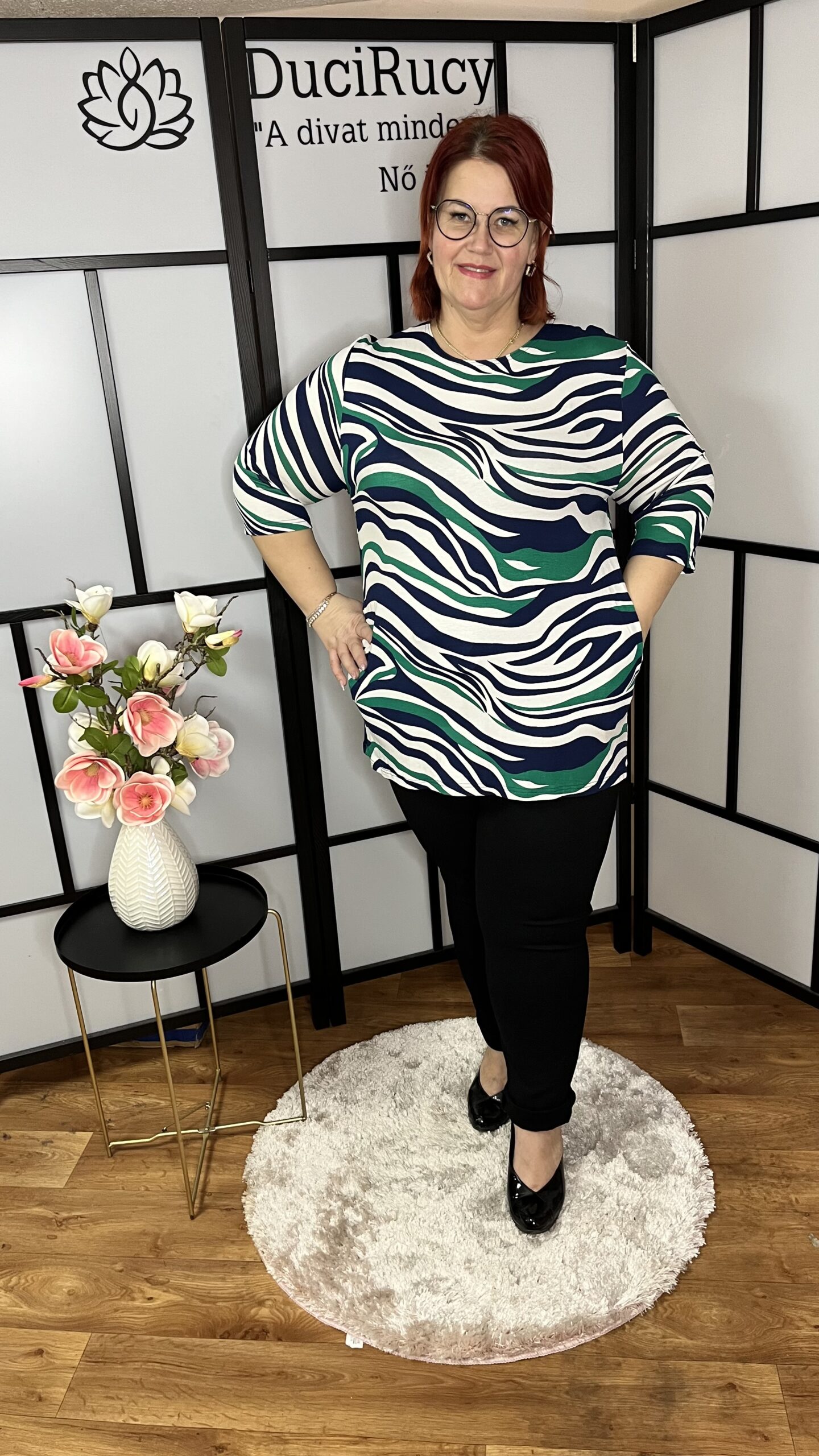A képeken a modell az 54-es méretet viseli. A modell méretei: mellbősége 120 cm, csípőbősége 132 cm, magassága 166 cm.