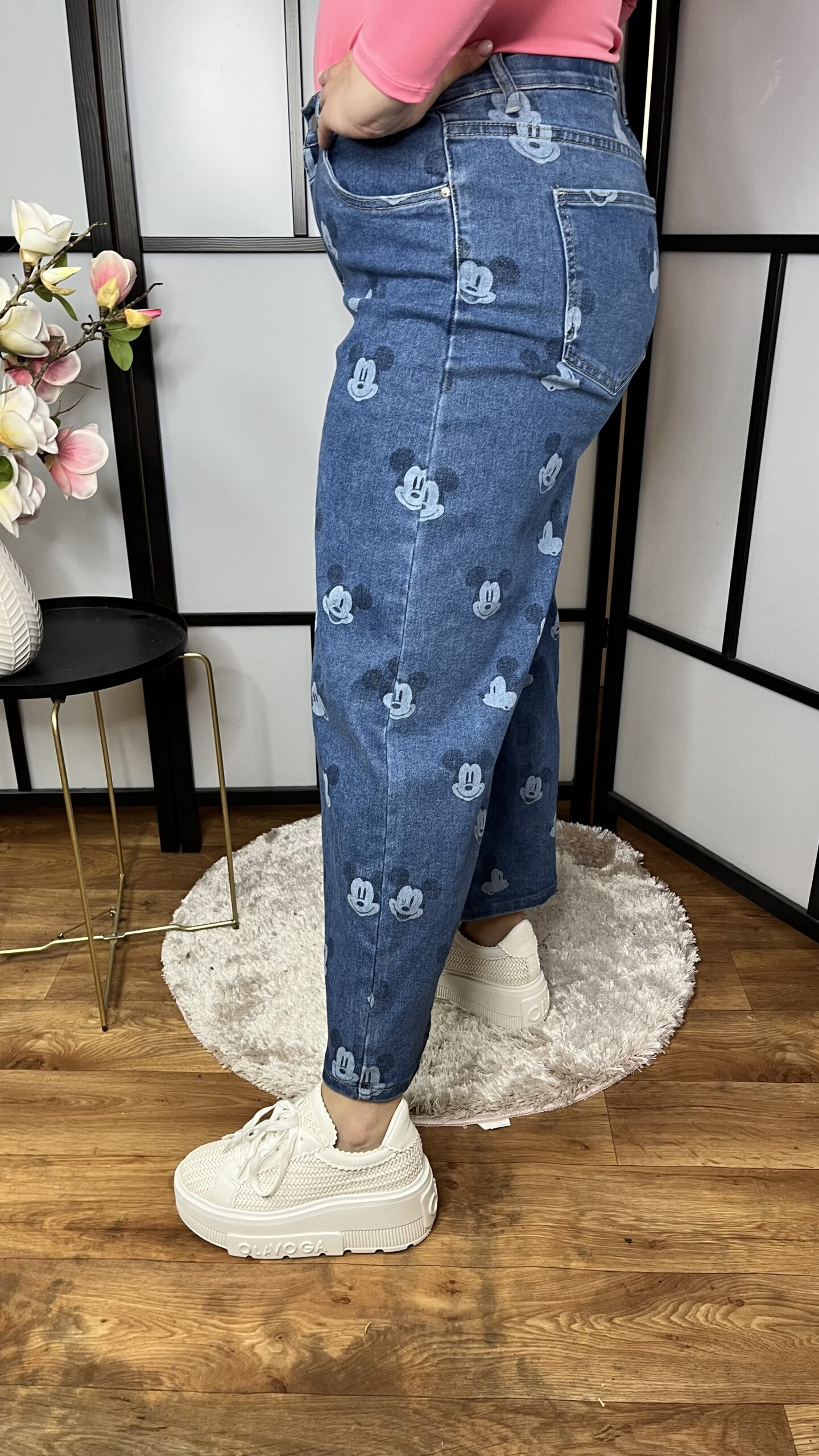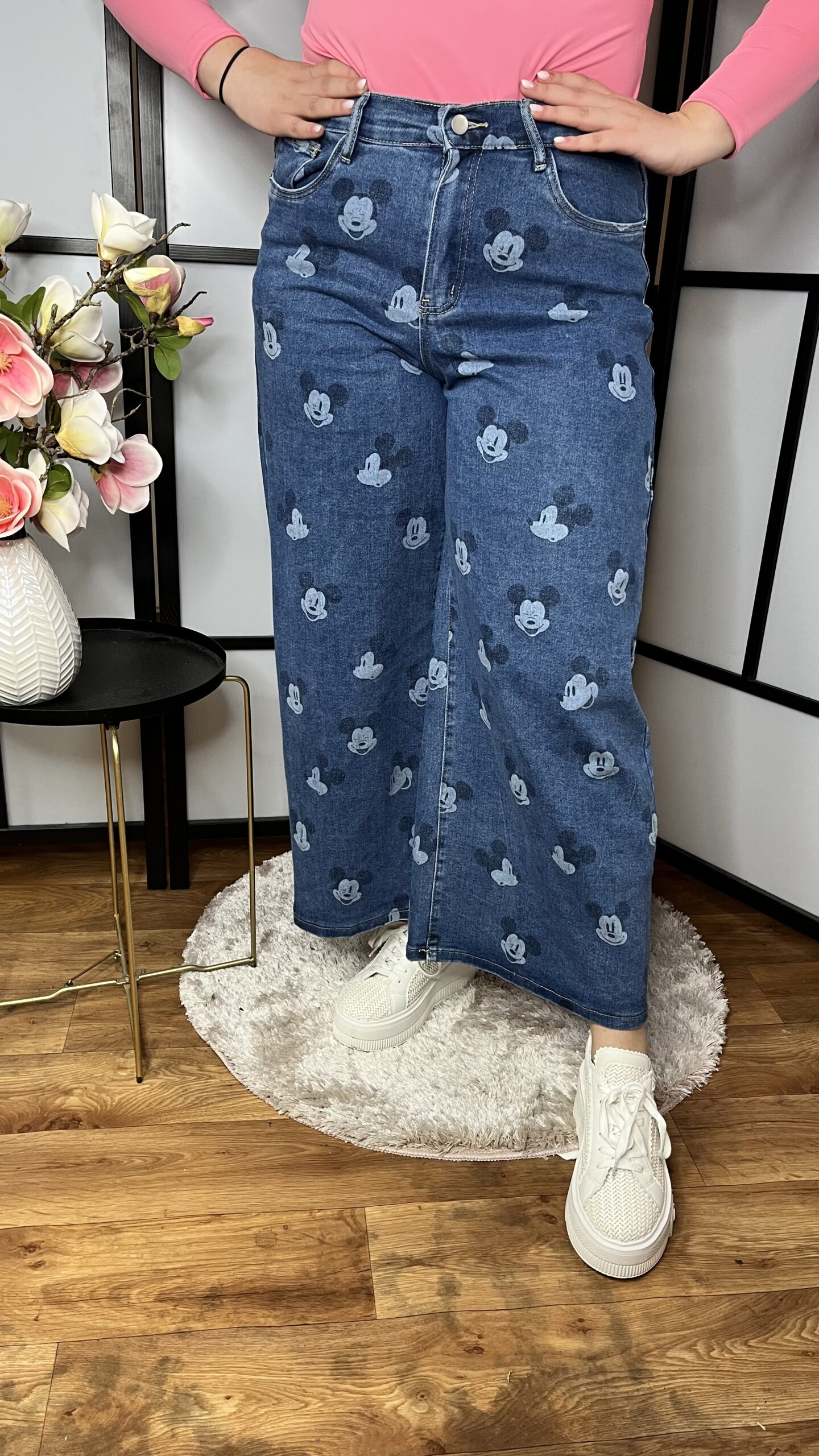 Egyedi és különleges egyenes szárú MICKEY fejekkel díszített fantasztikus farmernadrág