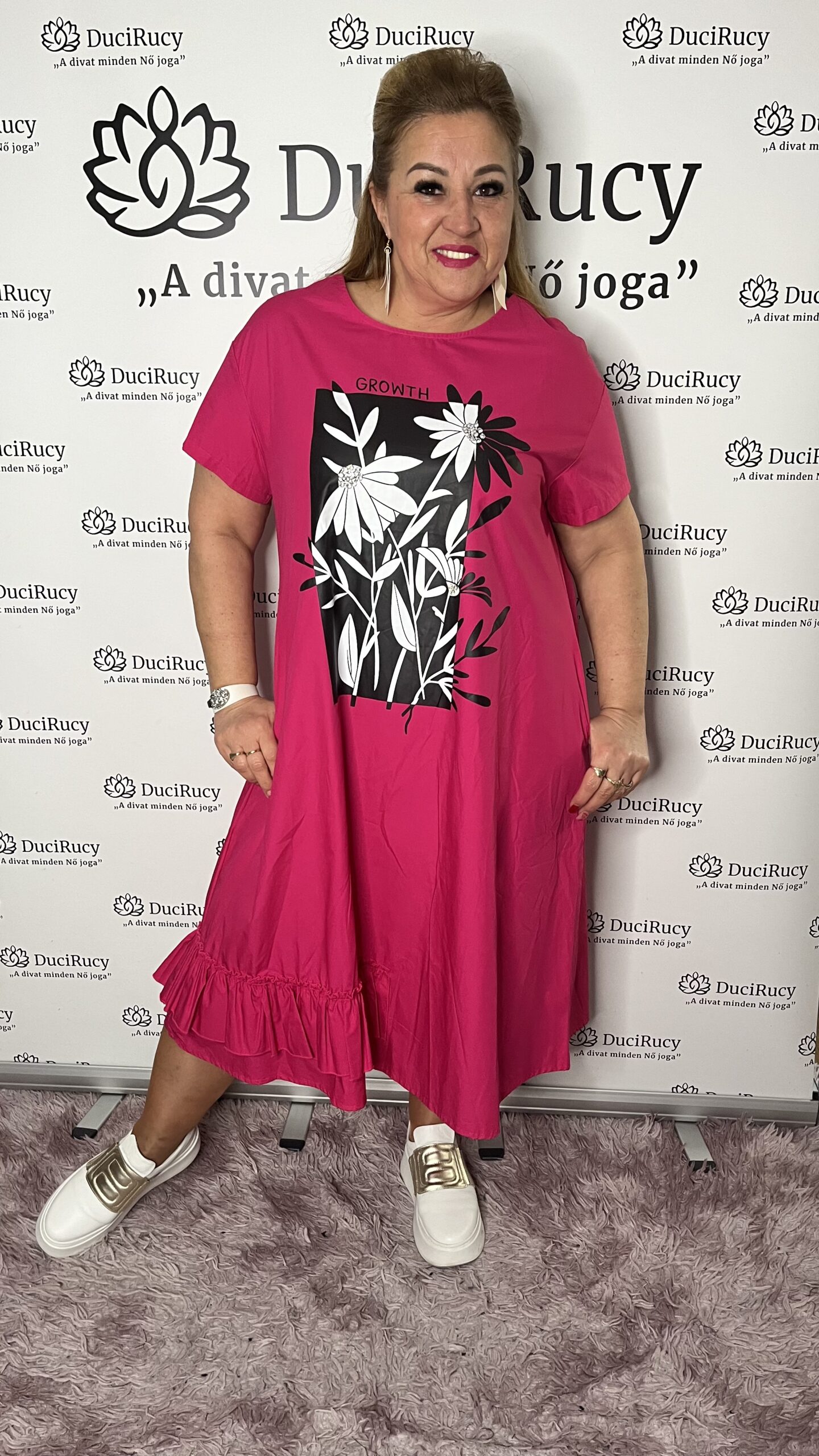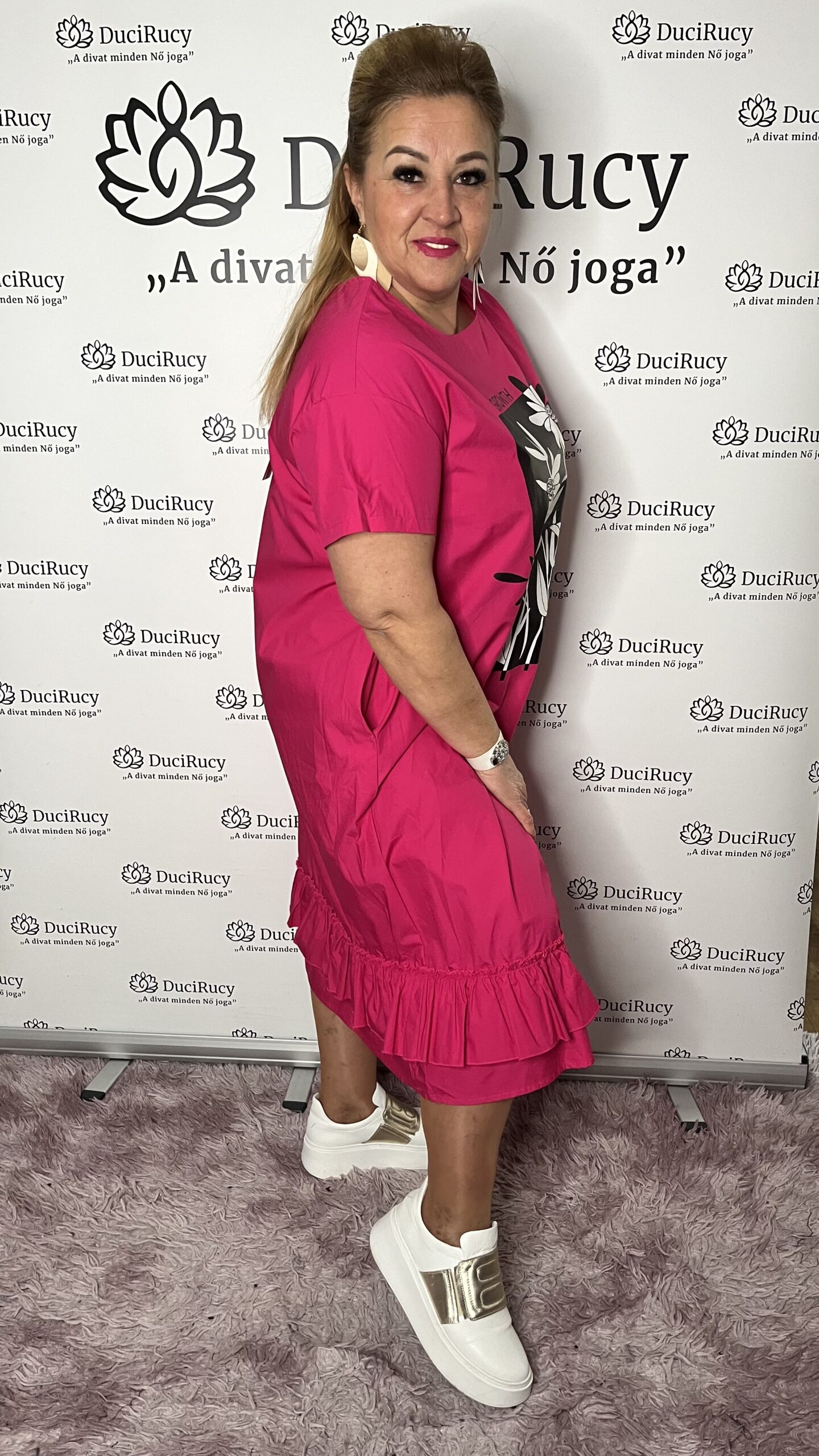 Szuper fazonú vászonruha, melynek elején nyomott minta található. A ruha alján, az egyik oldalon fodros résszel díszített. A ruha anyaga nem rugalmas.
