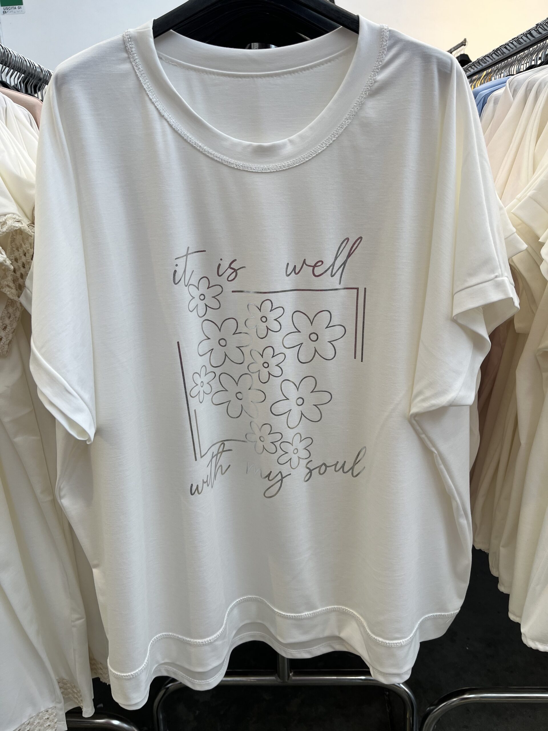 Extra méretű, ezüst virágos és írásos pamut póló felhőkék színben mennyiség