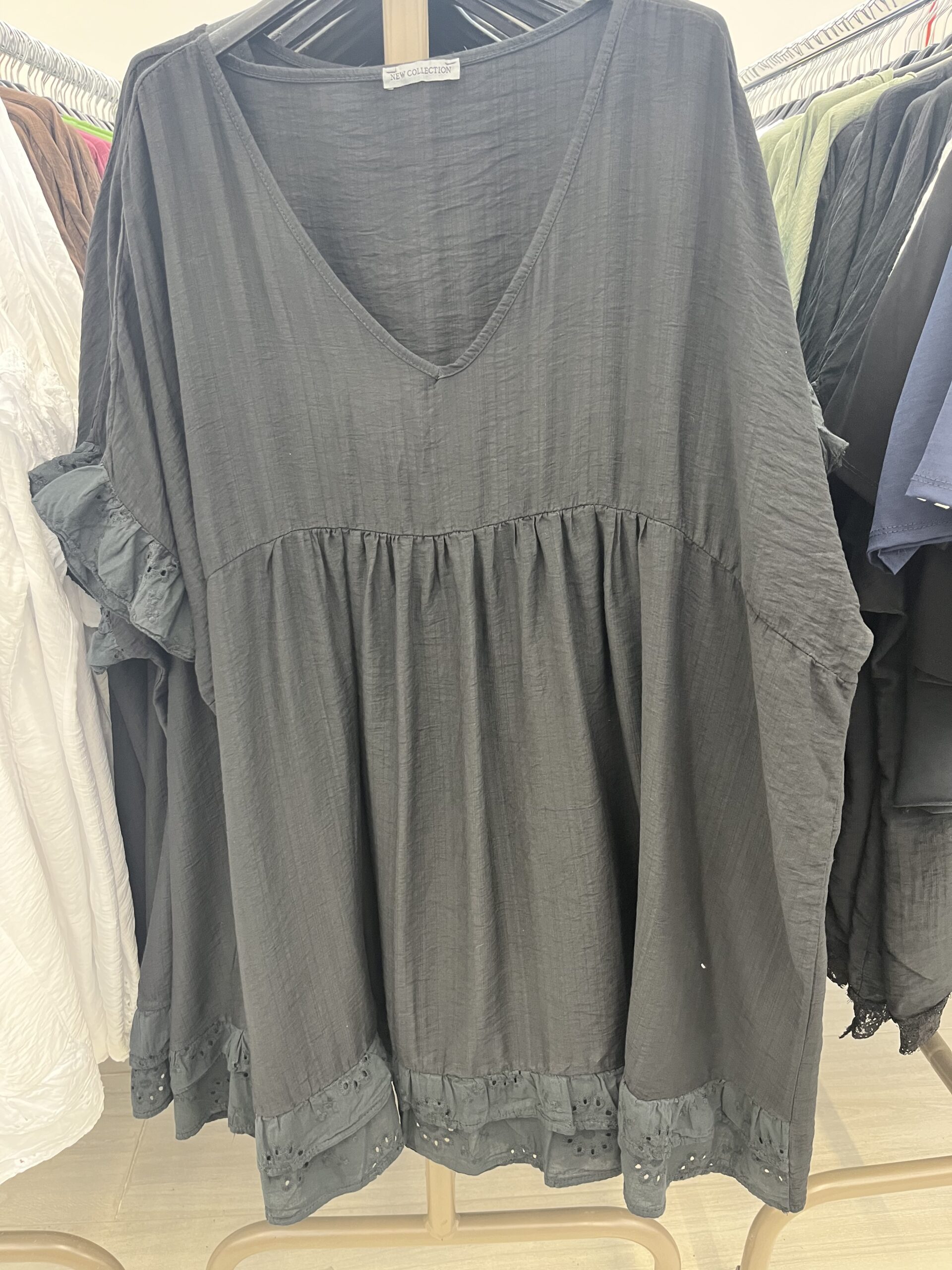Extra méretű, V nyakú, madeirás ujjú tunika felhőkék színben