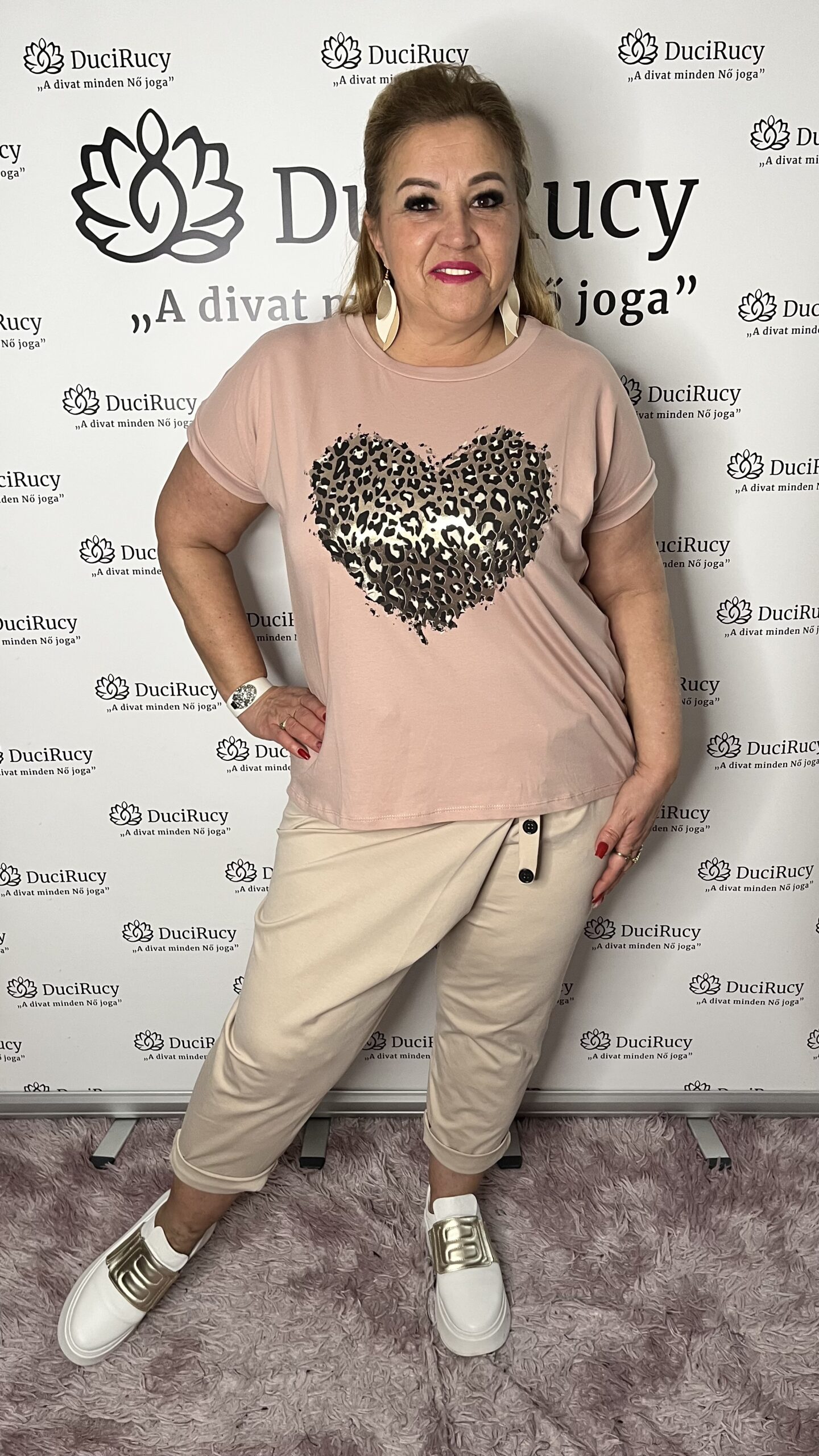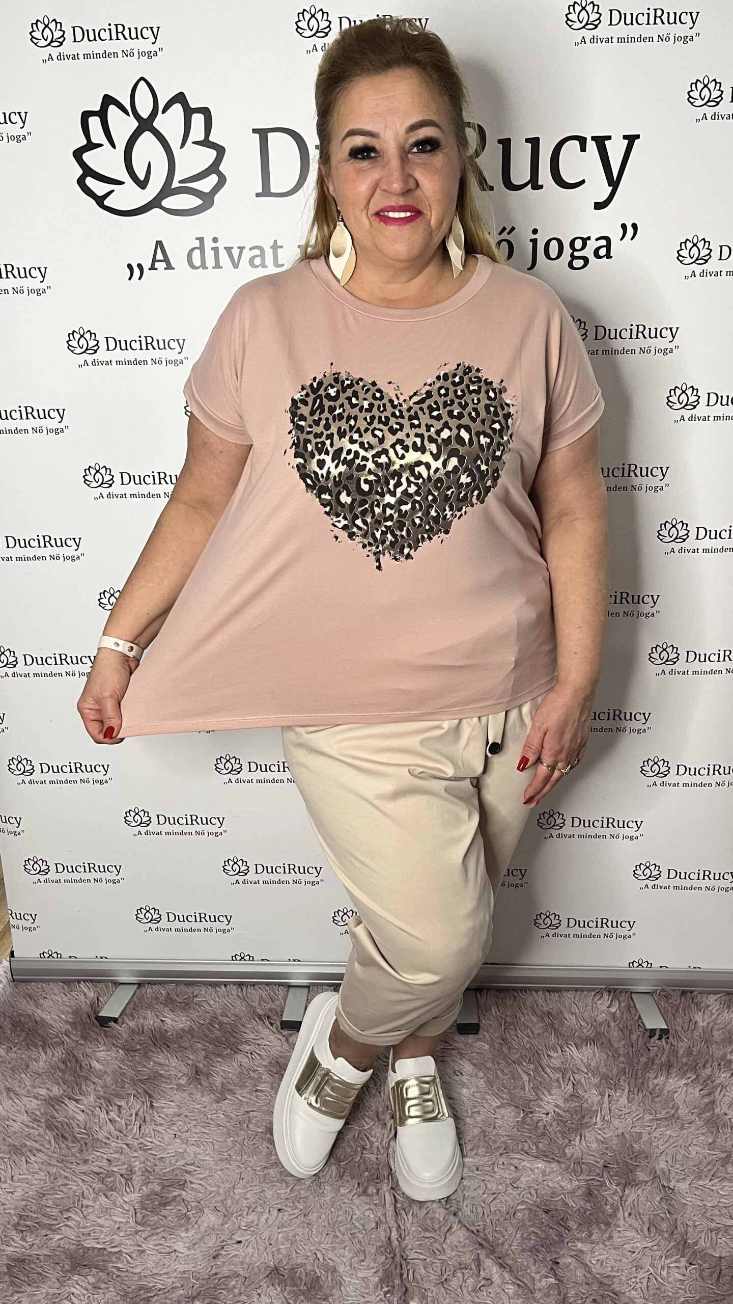 Extra minőségű olasz pamut póló NAGY méretben puder színben párduc szíves mintával