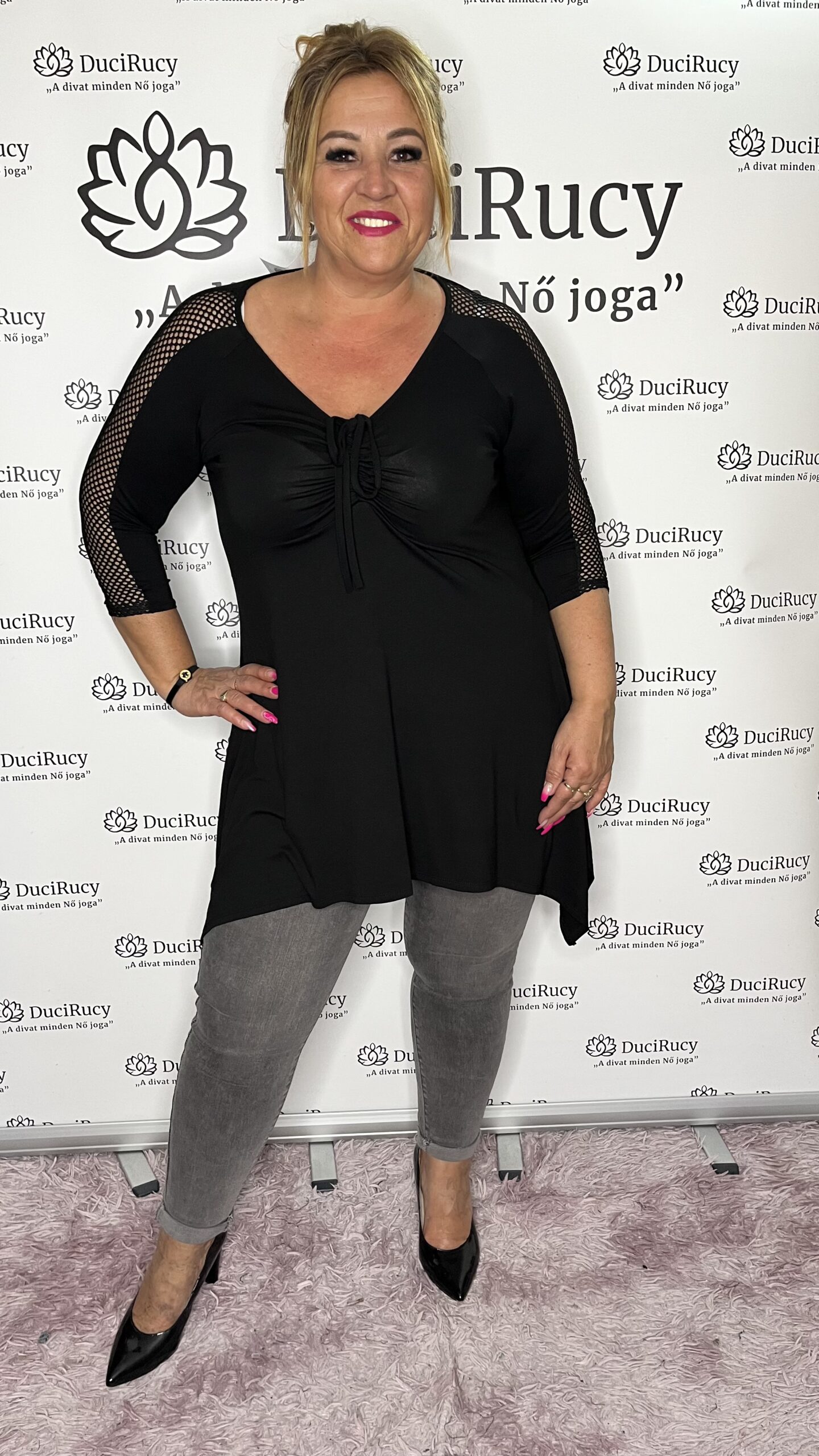 A képeken a modell M méretet viseli. A modell méretei: derékbőség 100 cm, csípőbőség 120 cm, magassága 167 cm.