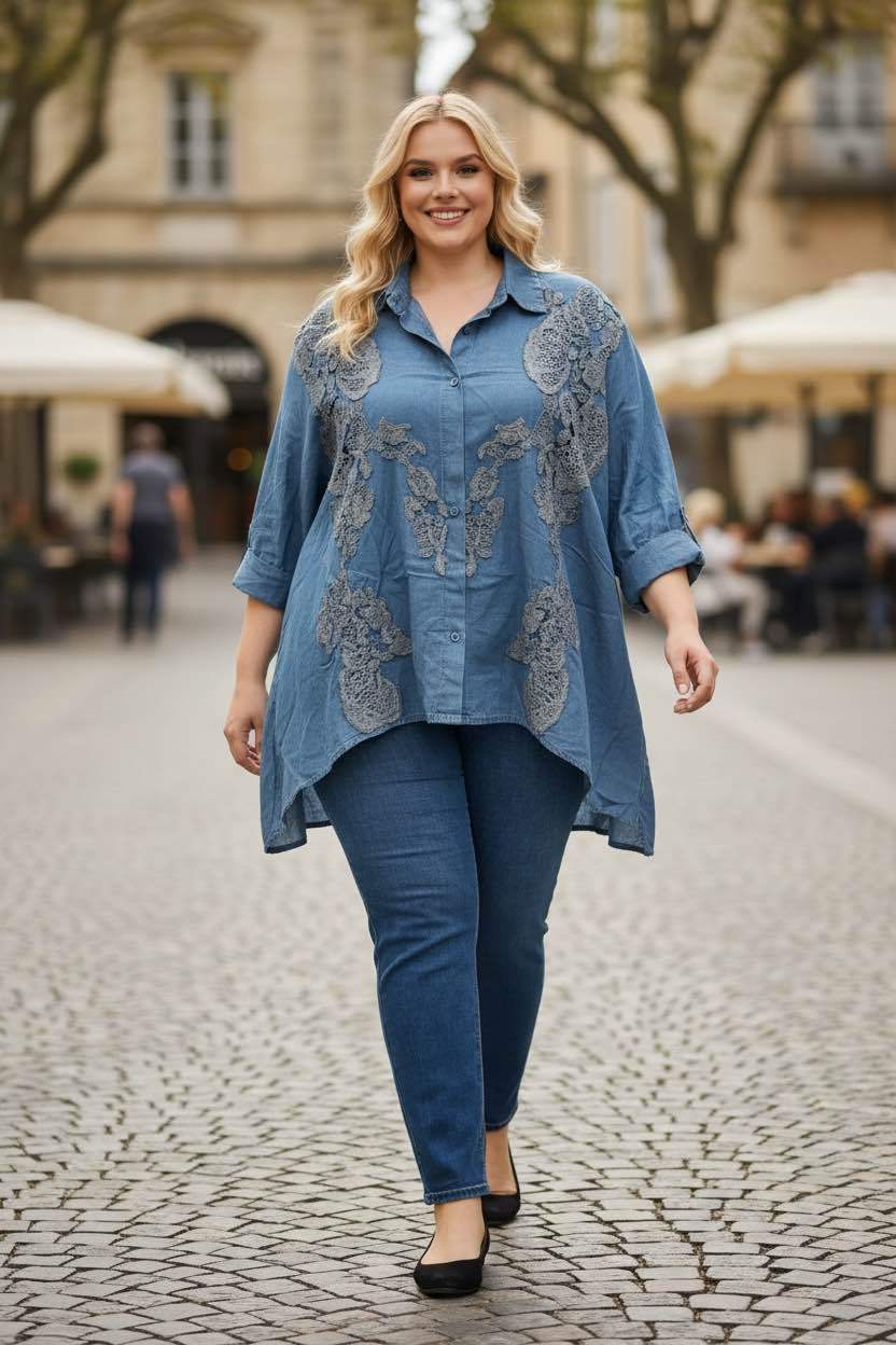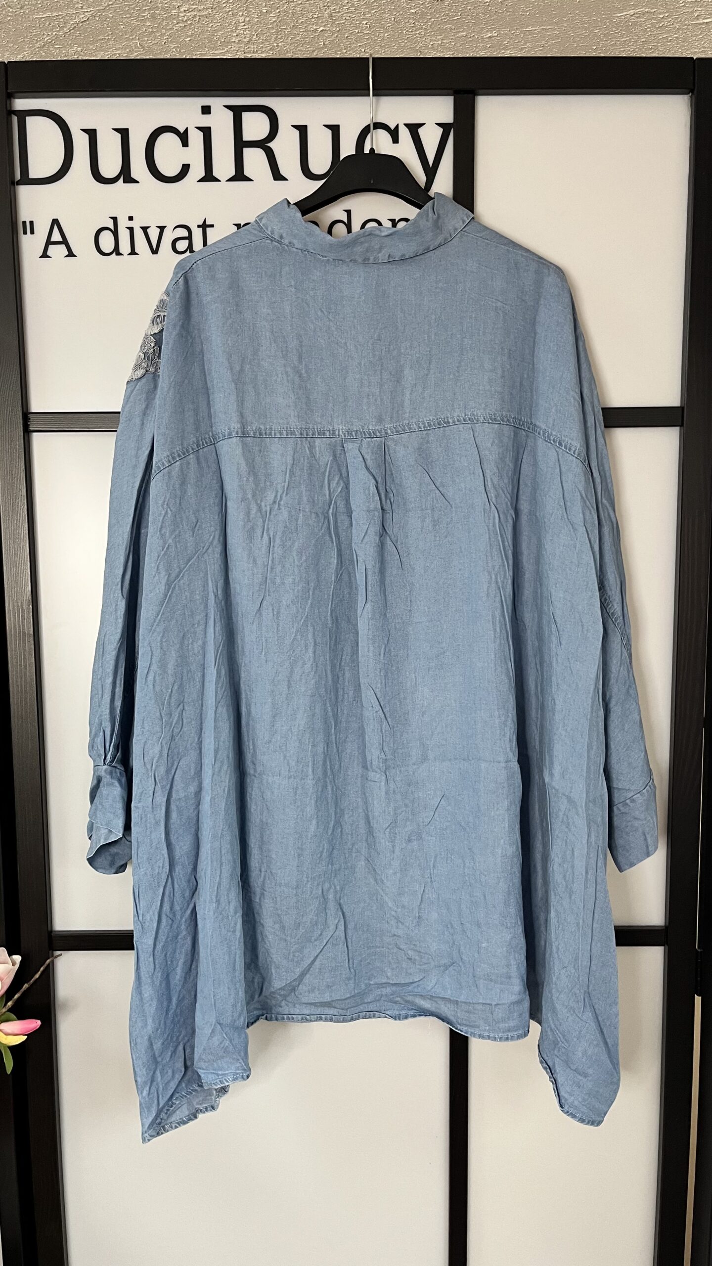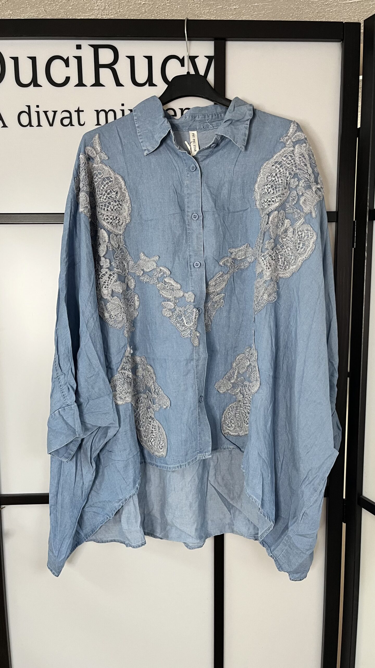 Nagyon divatos, denevér ujjú (T-ujjú), ejtett vállú, oversize, vékony farmerhatású ing elején csipke díszítéssel. Az ing anyaga nem rugalmas.