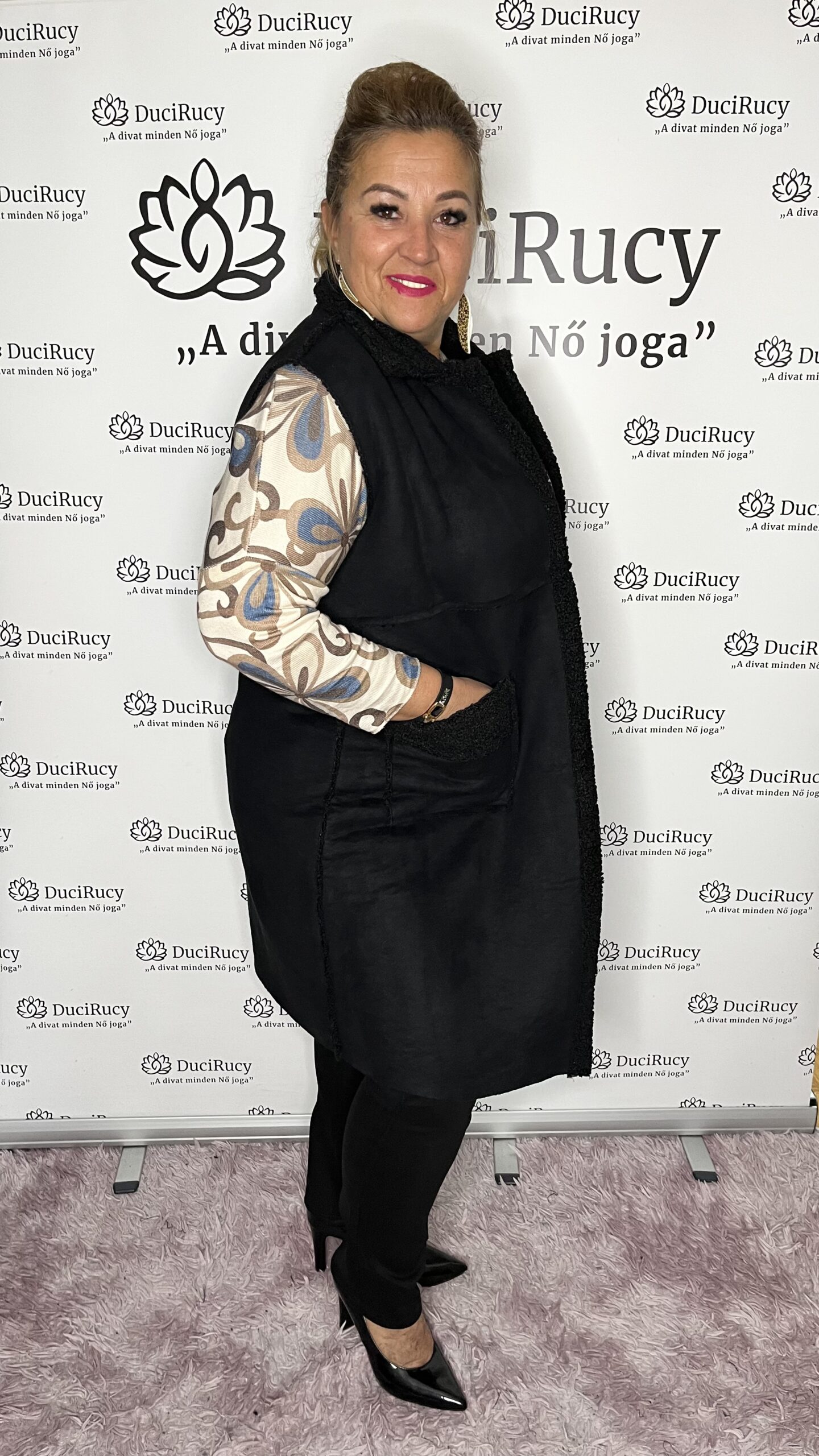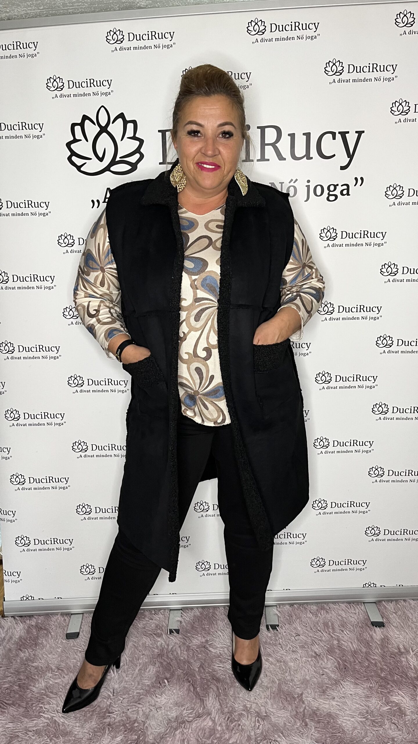 Divatos, puha mellény irha jellegű anyagból. A mellény egyenes fazonú, elején két zsebben díszített.