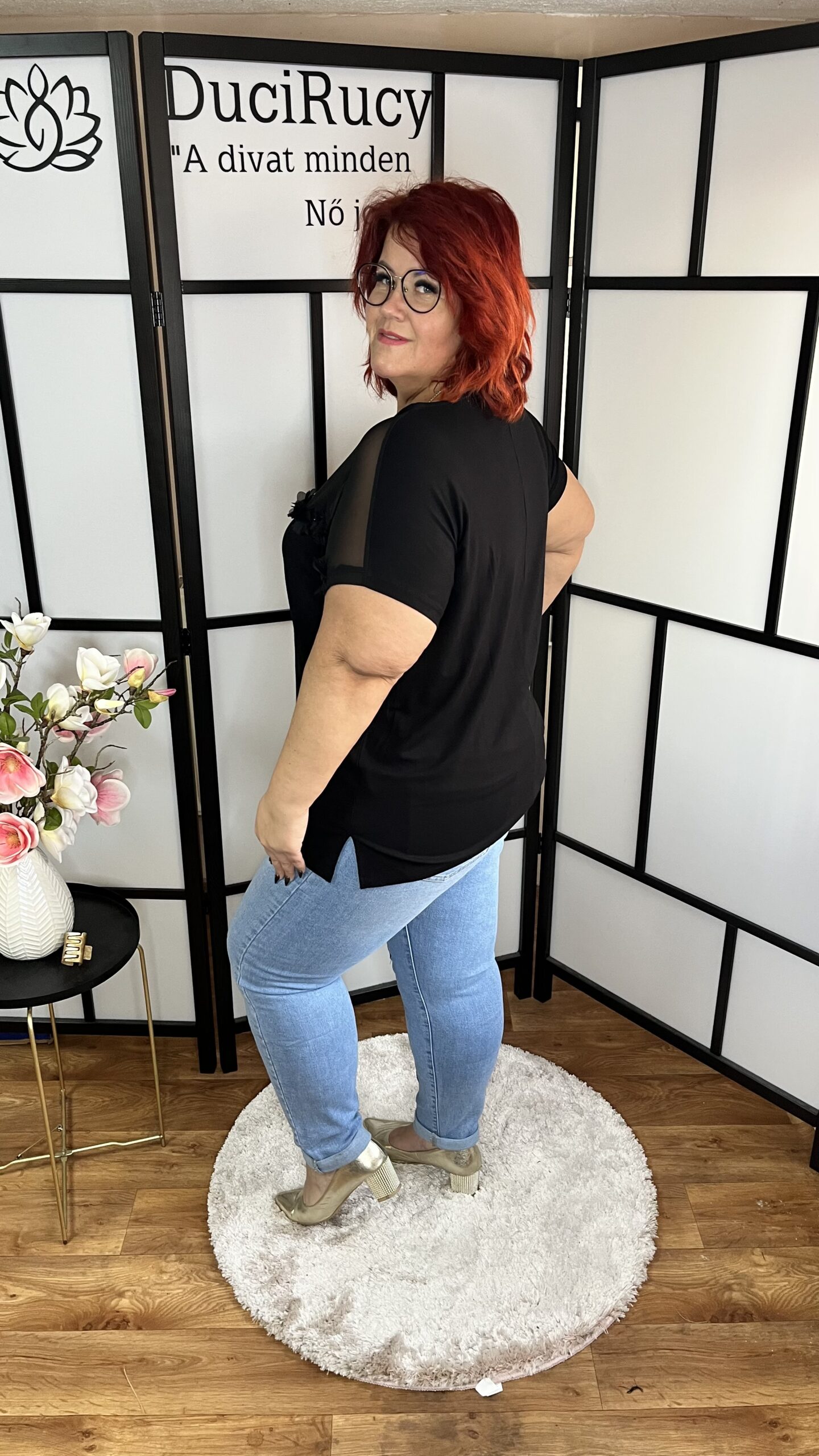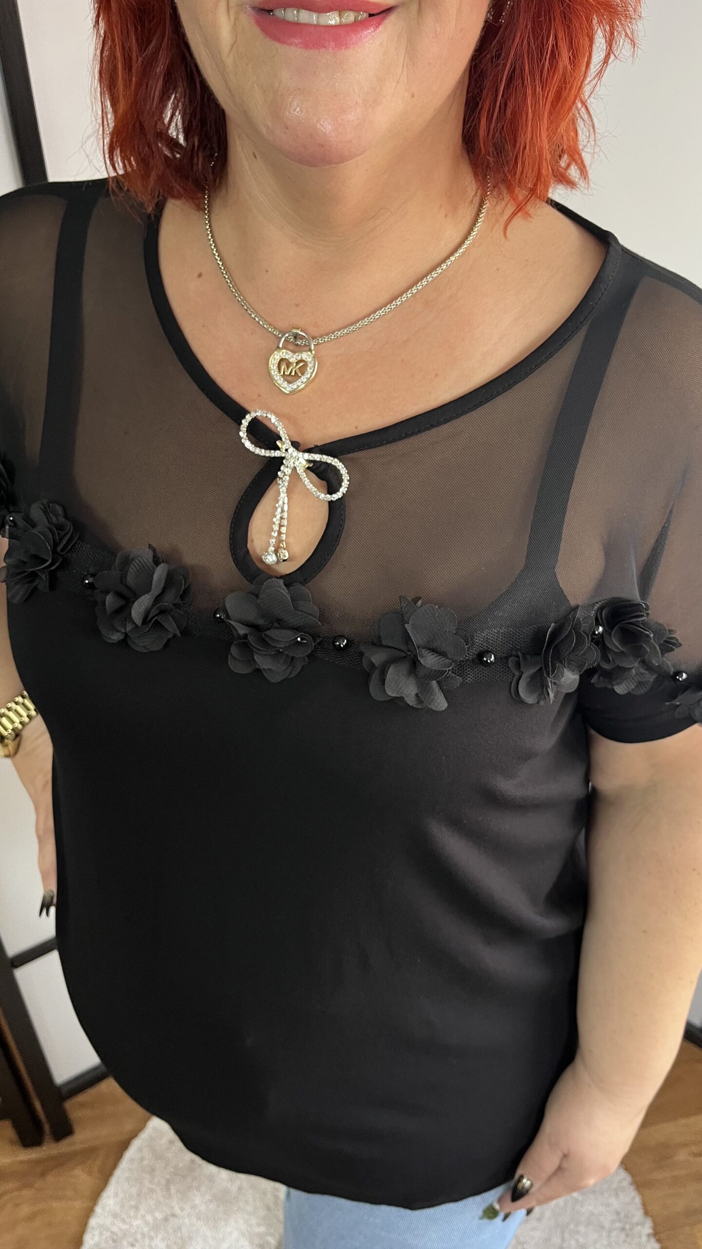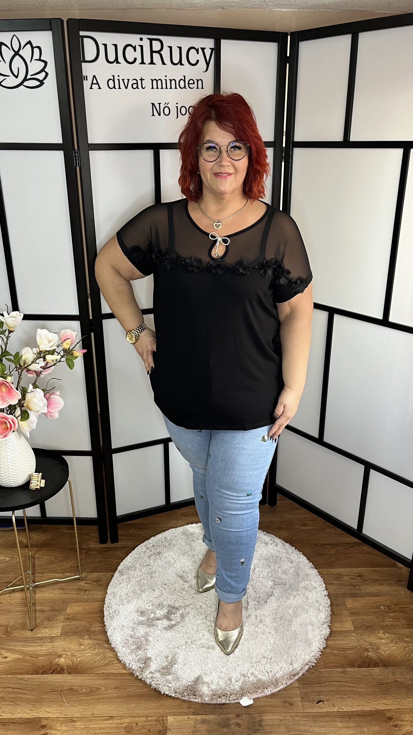Igazán különleges megoldású, kiváló török pamut anyagból készült tüllel kombinált felső. A felső díszítése a felső részen virágok, valamint strasszokból kirakott masni. A felső anyaga rugalmas. Bármilyen alkalomra kiváló választás akár egy nadrággal, akár egy szoknyával.