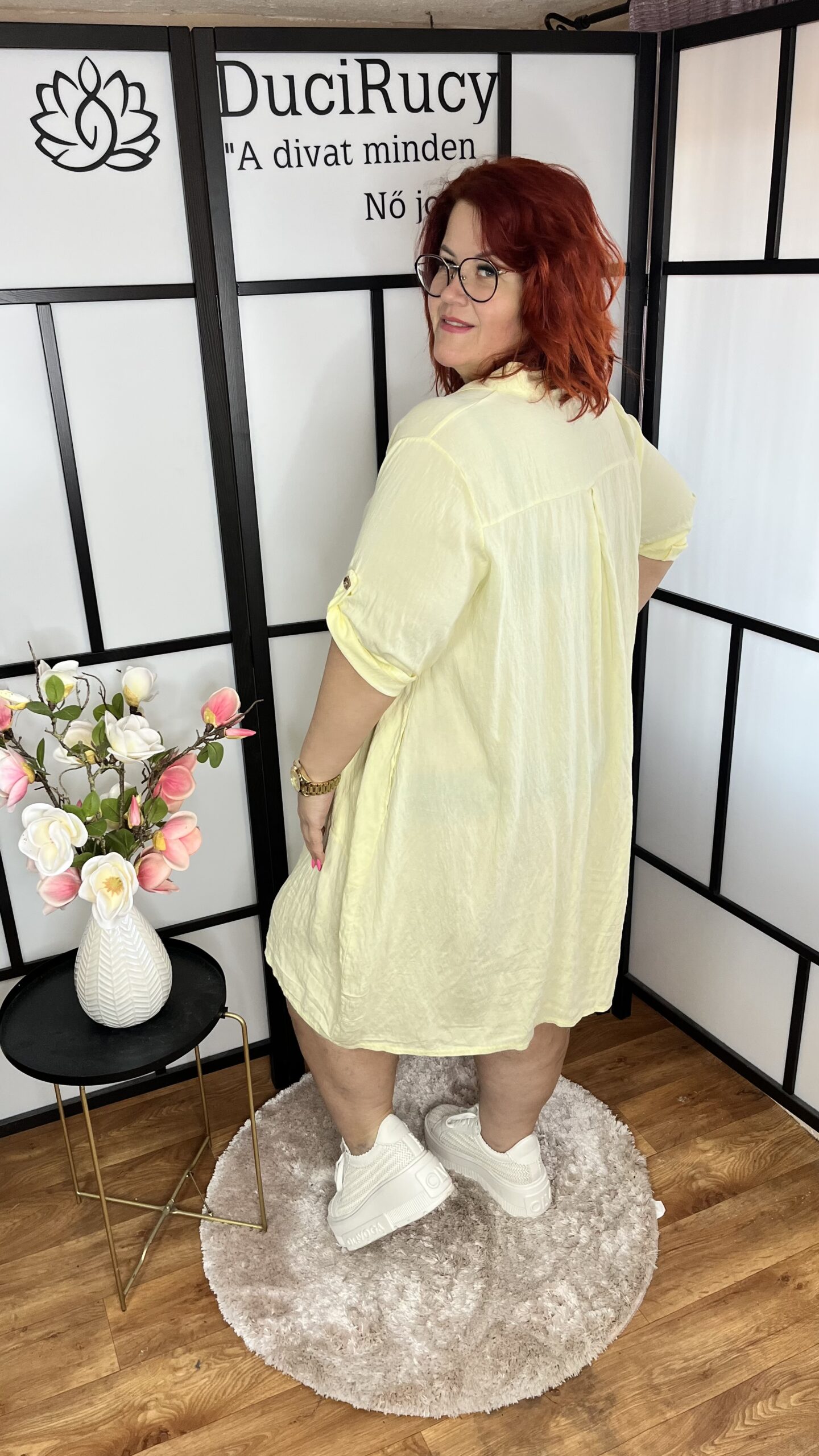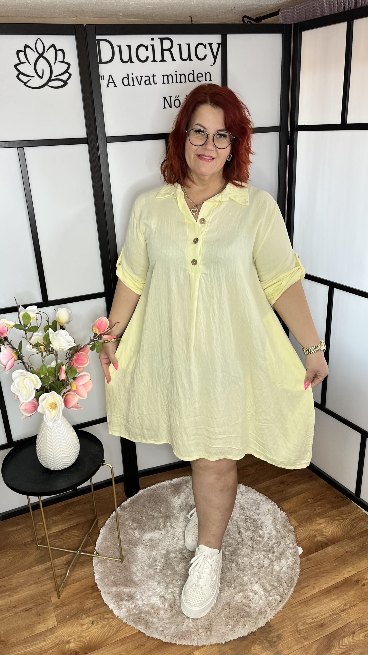 Felgombolható ujjú inggalléros elől 3 gombos zsebes hagymaruha sárga színben