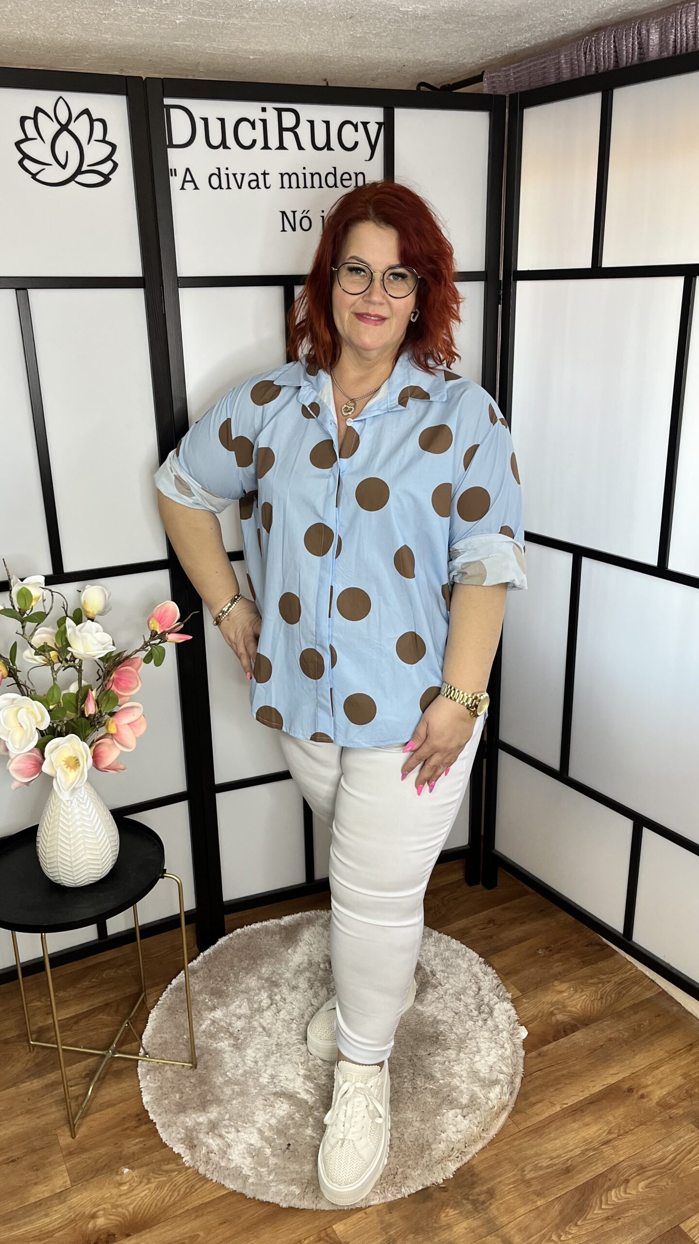Olasz szuper divatos, kerekített fazonú, nagy pöttyös vászon ing. Nagyon jól kombinálható darab. Az ing anyaga nem rugalmas.