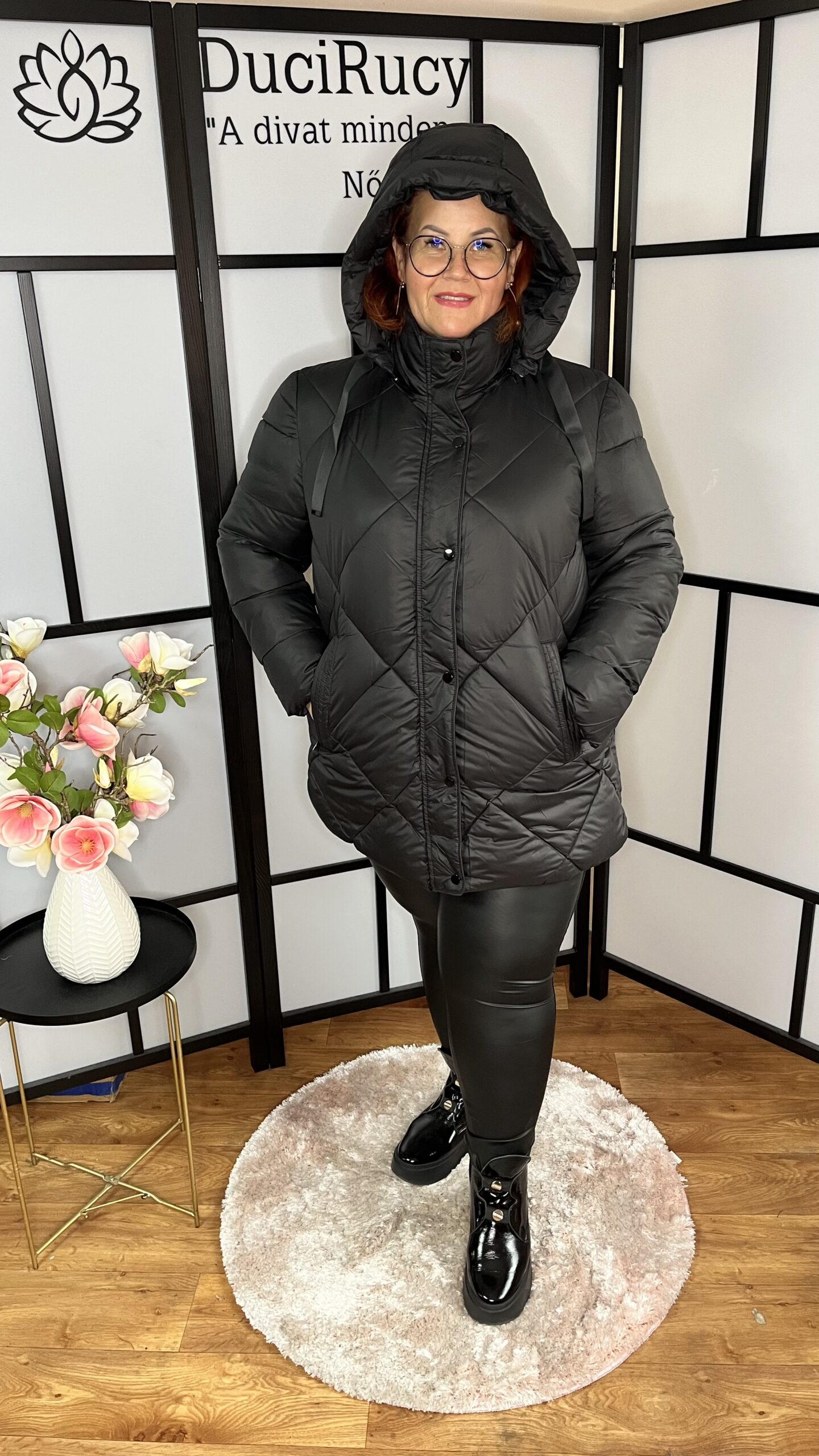 Közepes hosszúságú, steppelt kapucnis téli kabát. A kapucni szőrmével díszített és levehető.