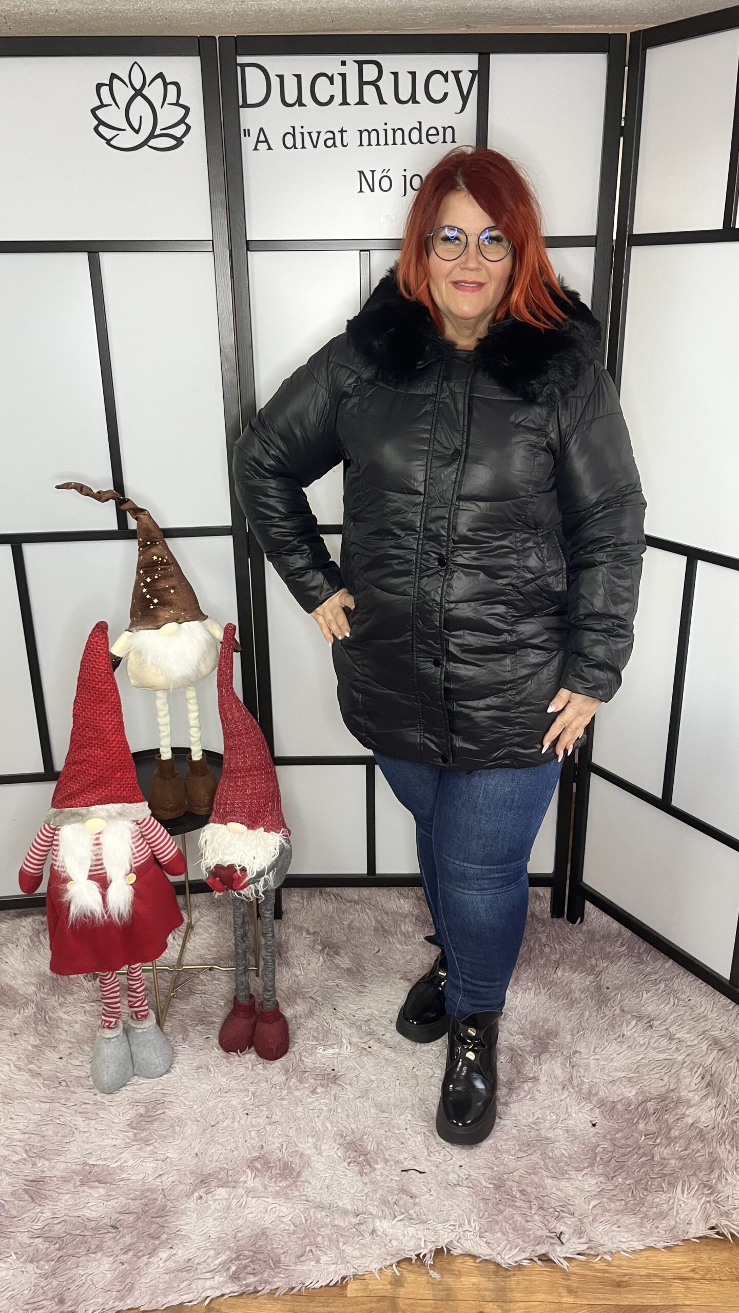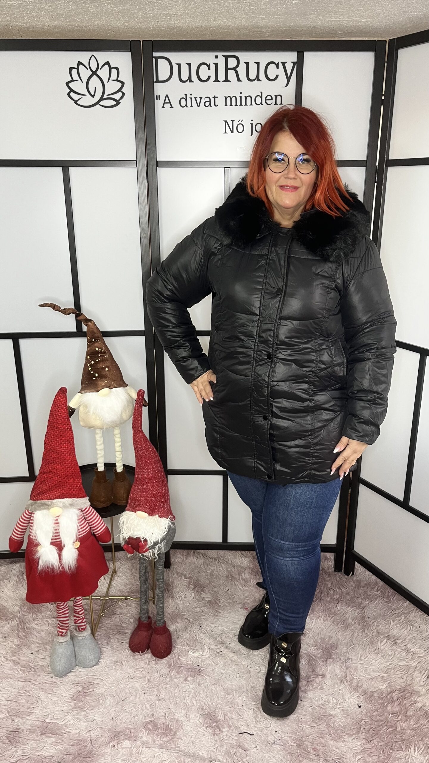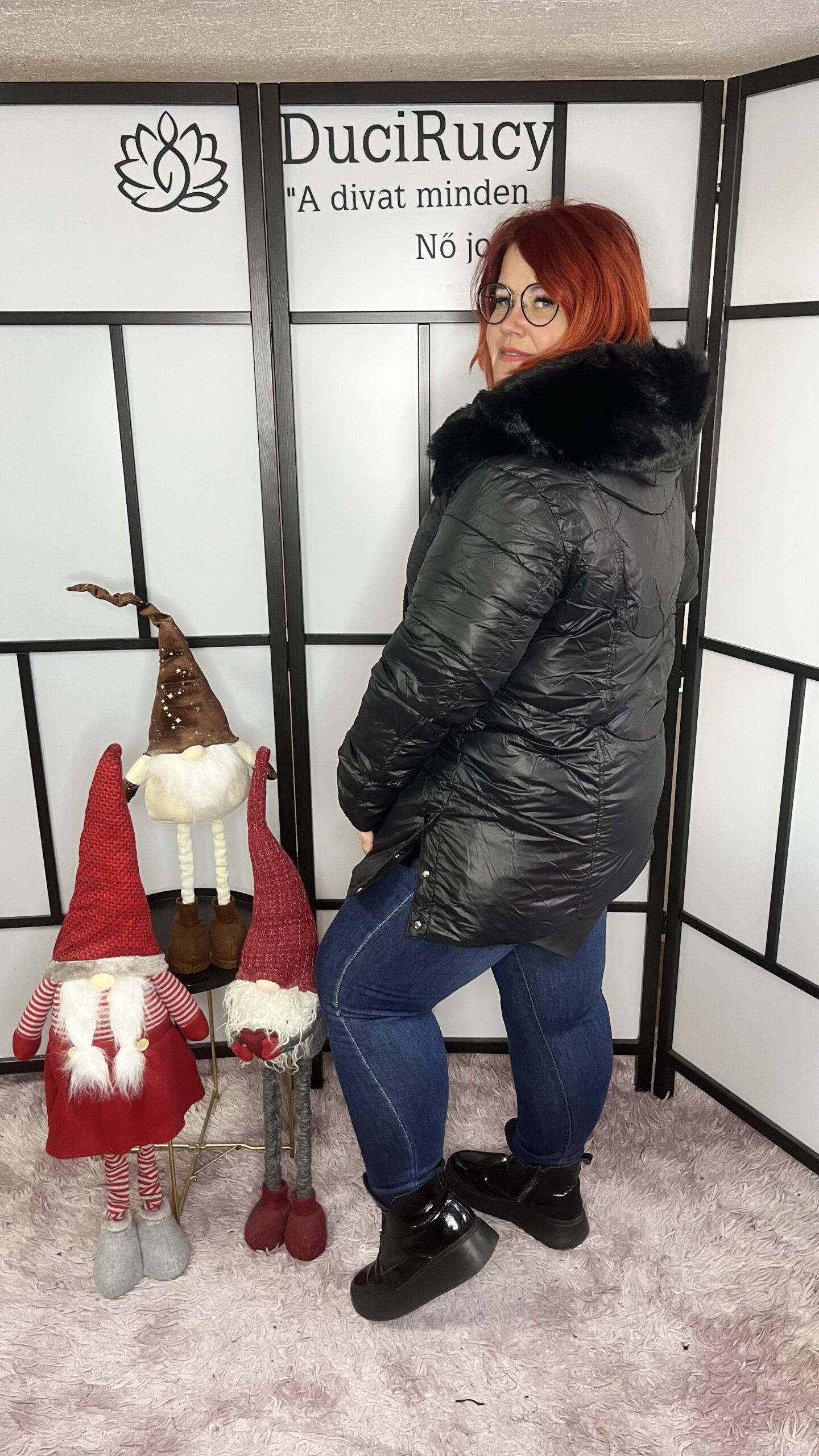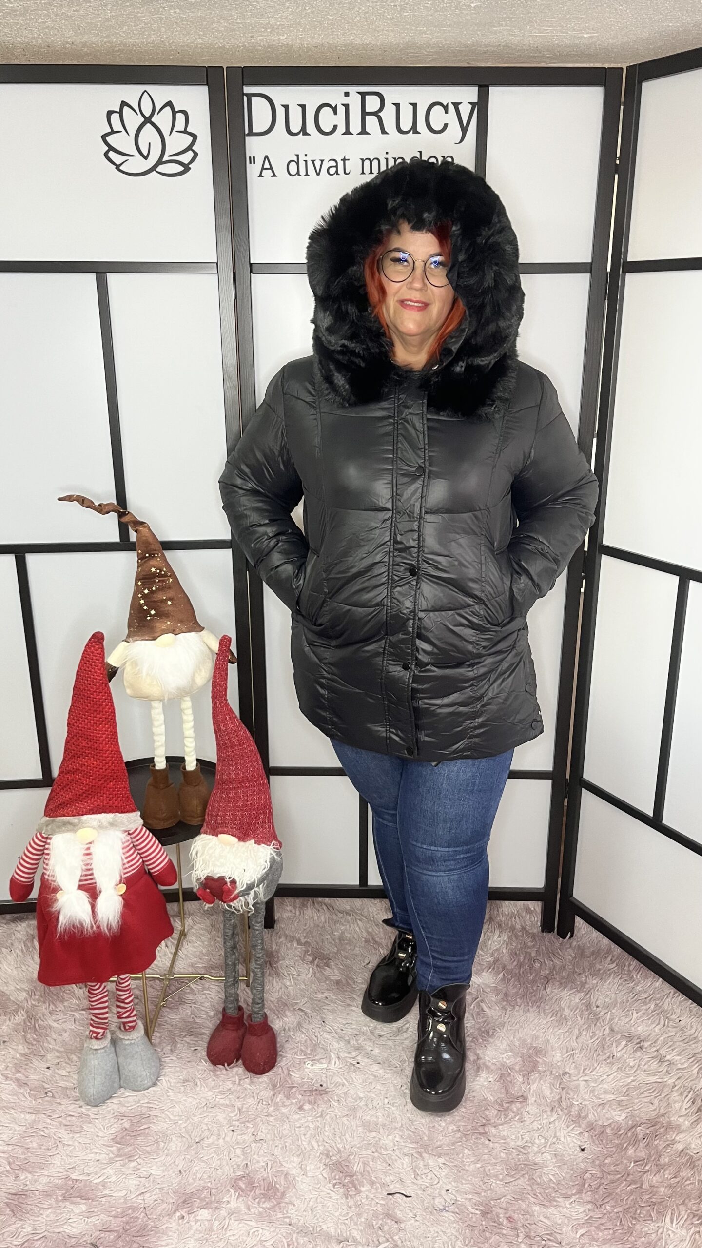 Közepes hosszúságú, steppelt kapucnis téli kabát oldalán aktív patentokkal. A kapucni szőrmével díszített és a szőrös rész legombolható róla.