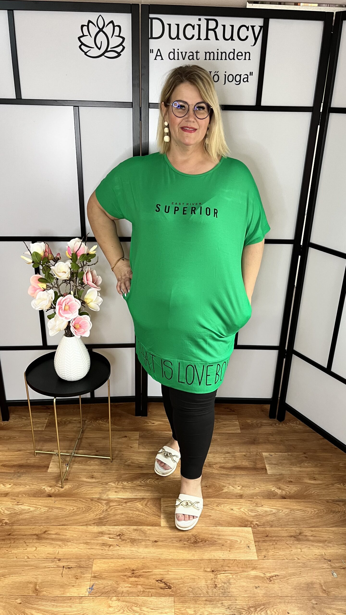 Feliratos, alul passzés, pamut zsebes, hagyma fazonú tunika. A tunika anyaga rugalmas pamut anyag.