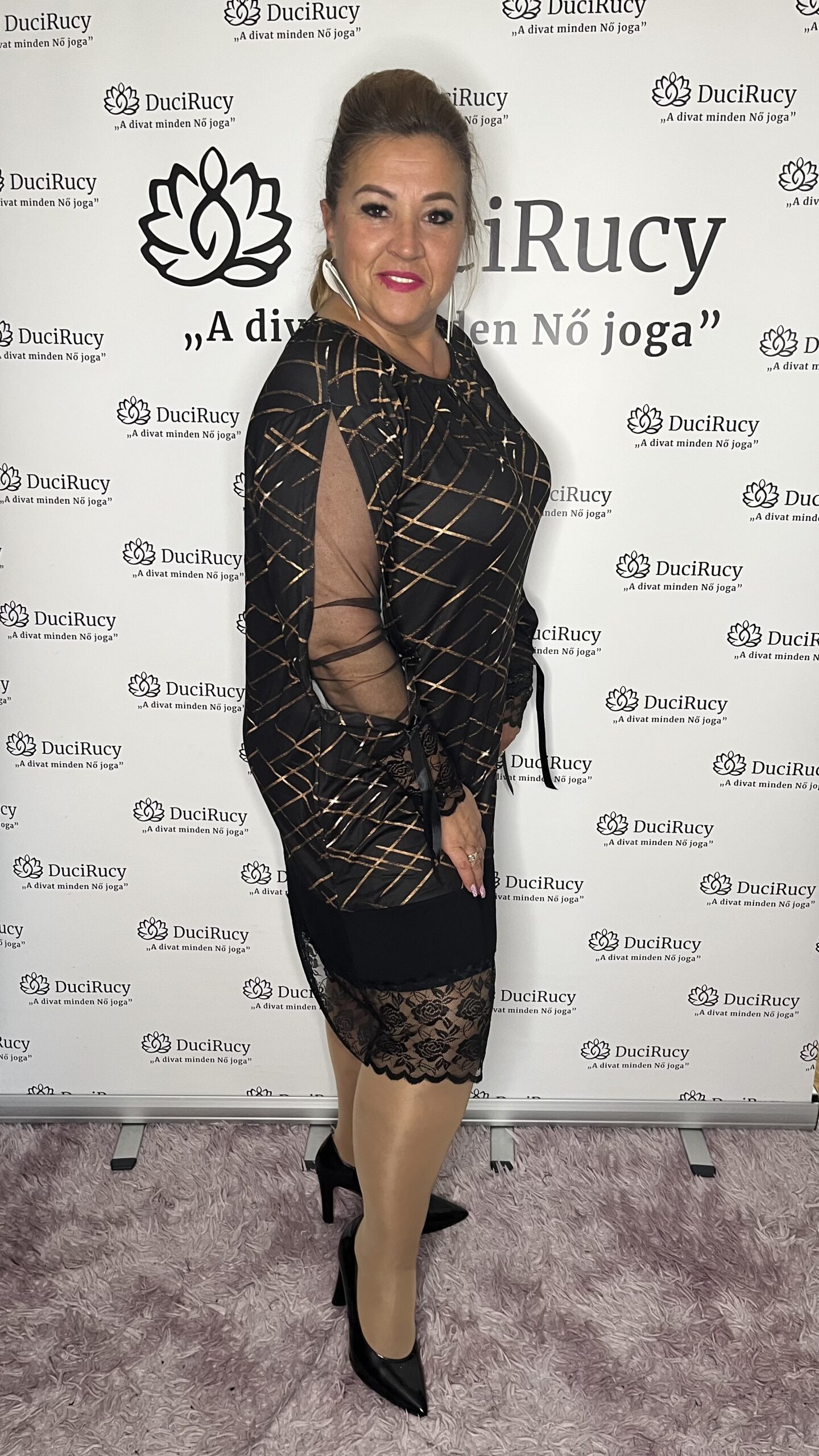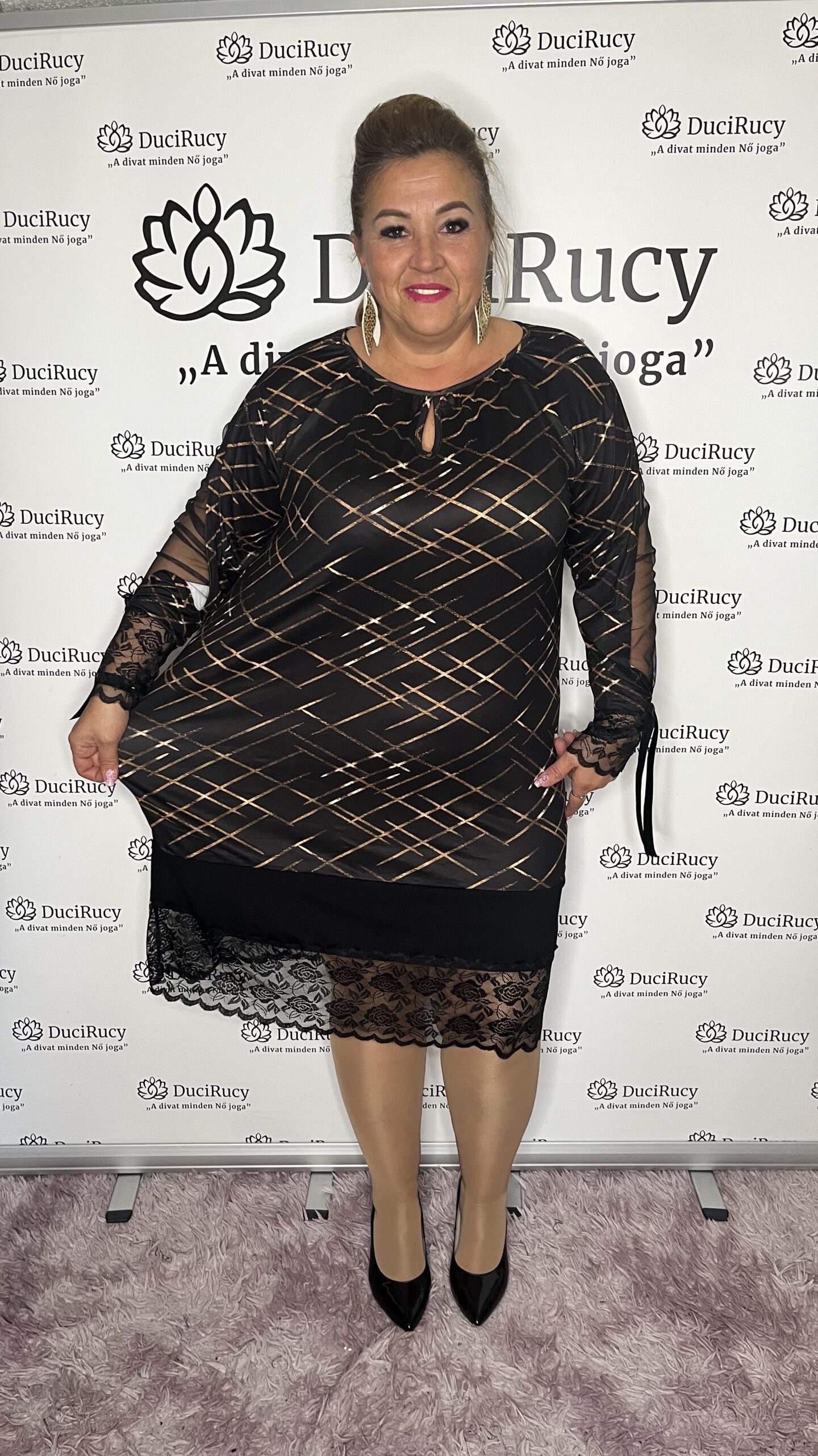 A képeken a modell is ezt a méretet viseli. A modell méretei: mell- és csípőbőség 120 cm, magassága 167 cm.