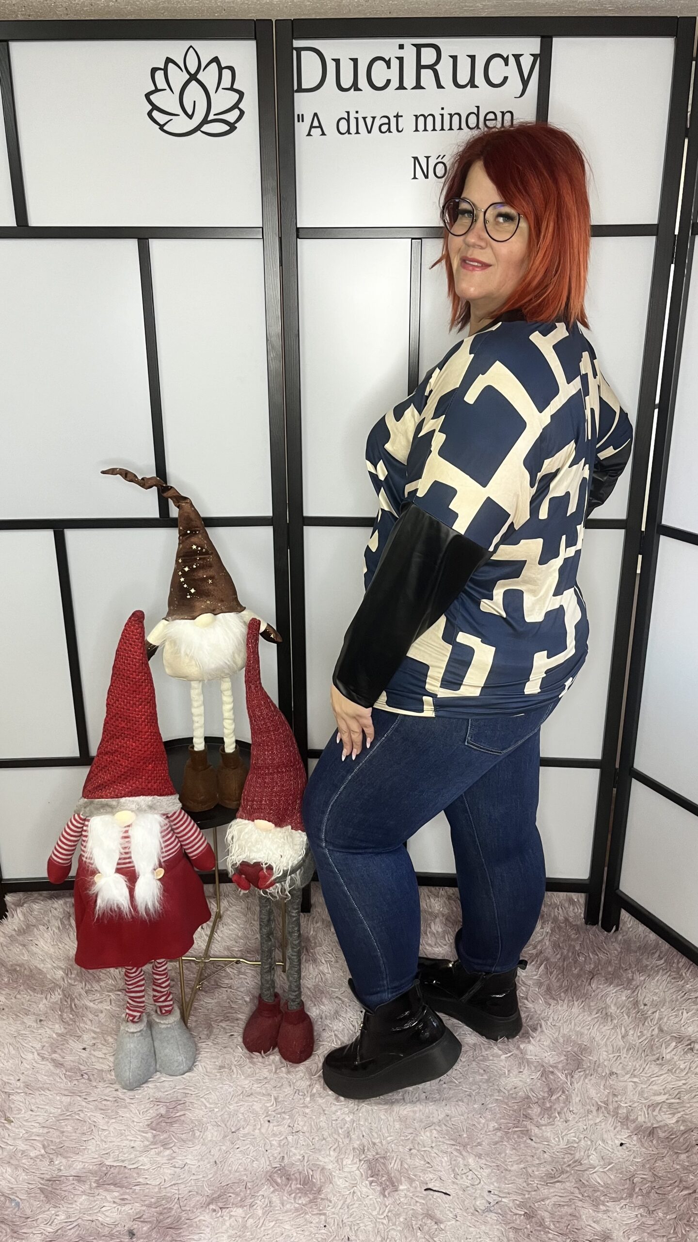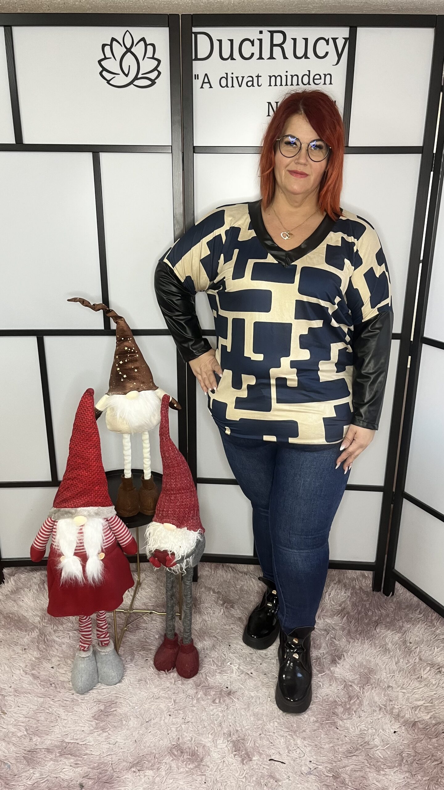 Francia V nyakú, bőrös ujjú felső sötétkék-bézs mintával