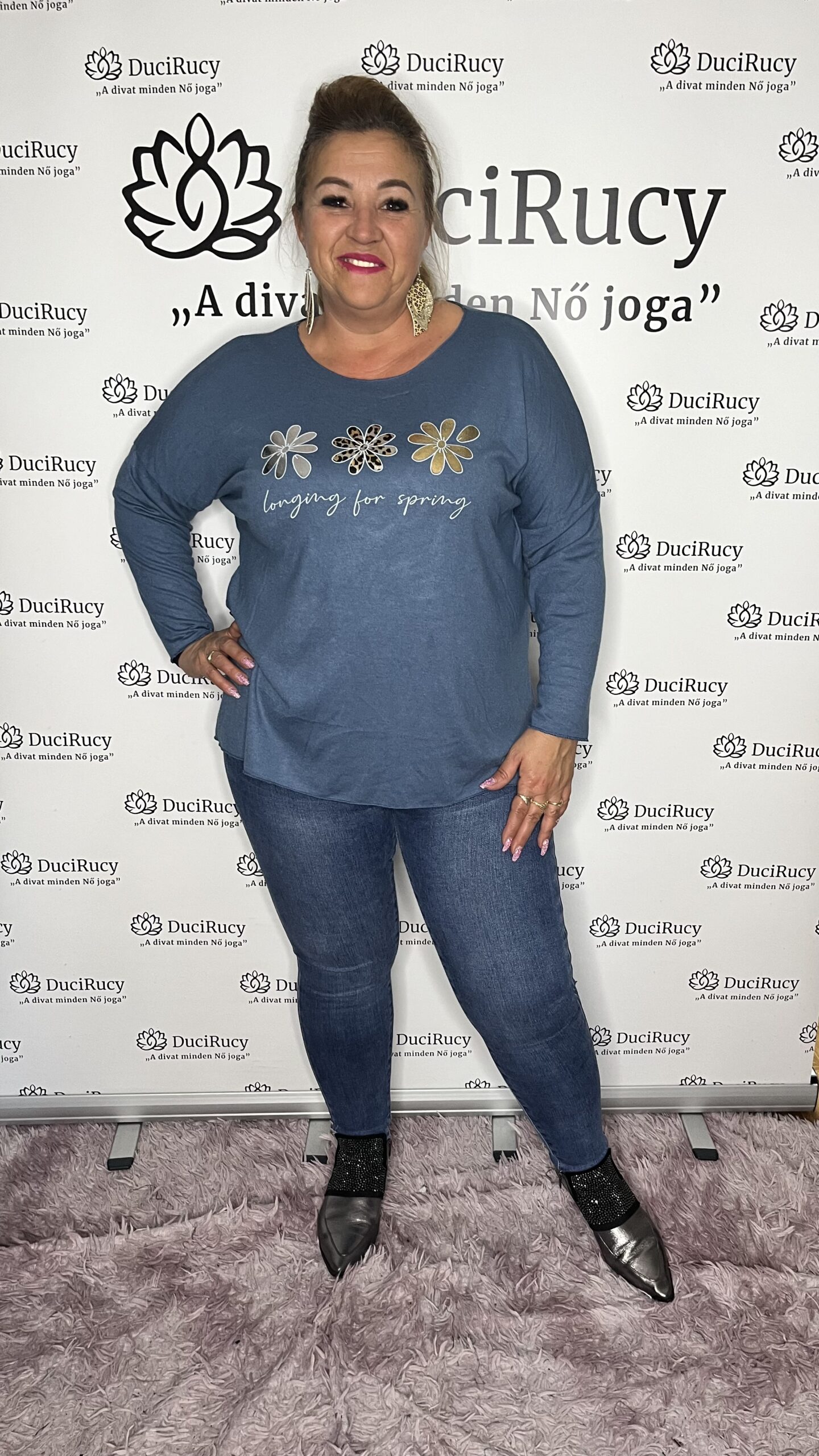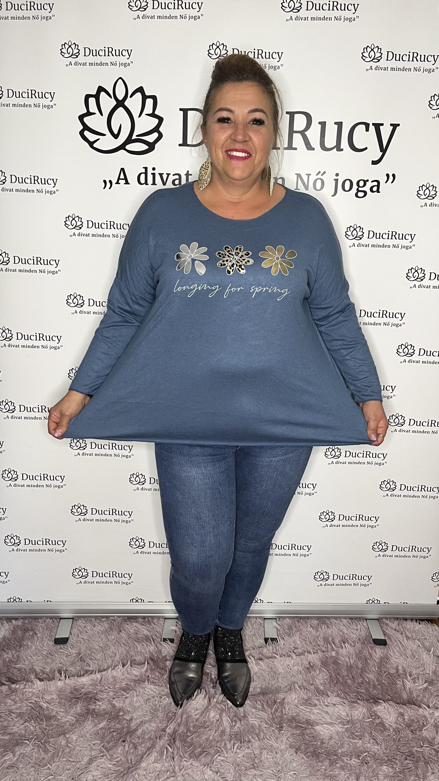 Olasz, kerek nyakú, gépi kötésű, 3 virággal díszített felső. Kötött anyagának köszönhetően extra rugalmas anyagú. Enyhén denevér fazon (T-ujjú).