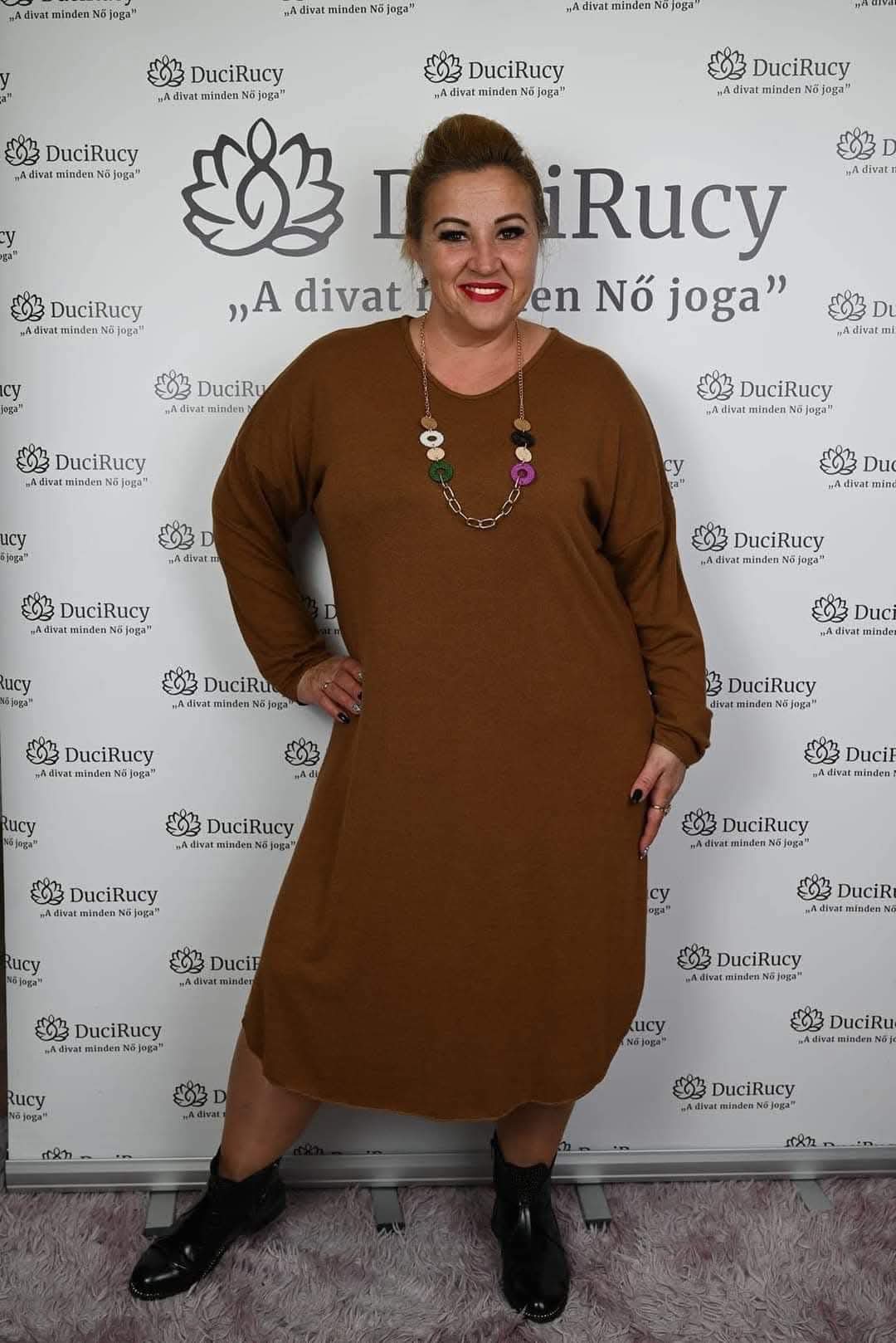 Gépi kötésű kerekített fazonú ruha ajándék nyaklánccal barna színben