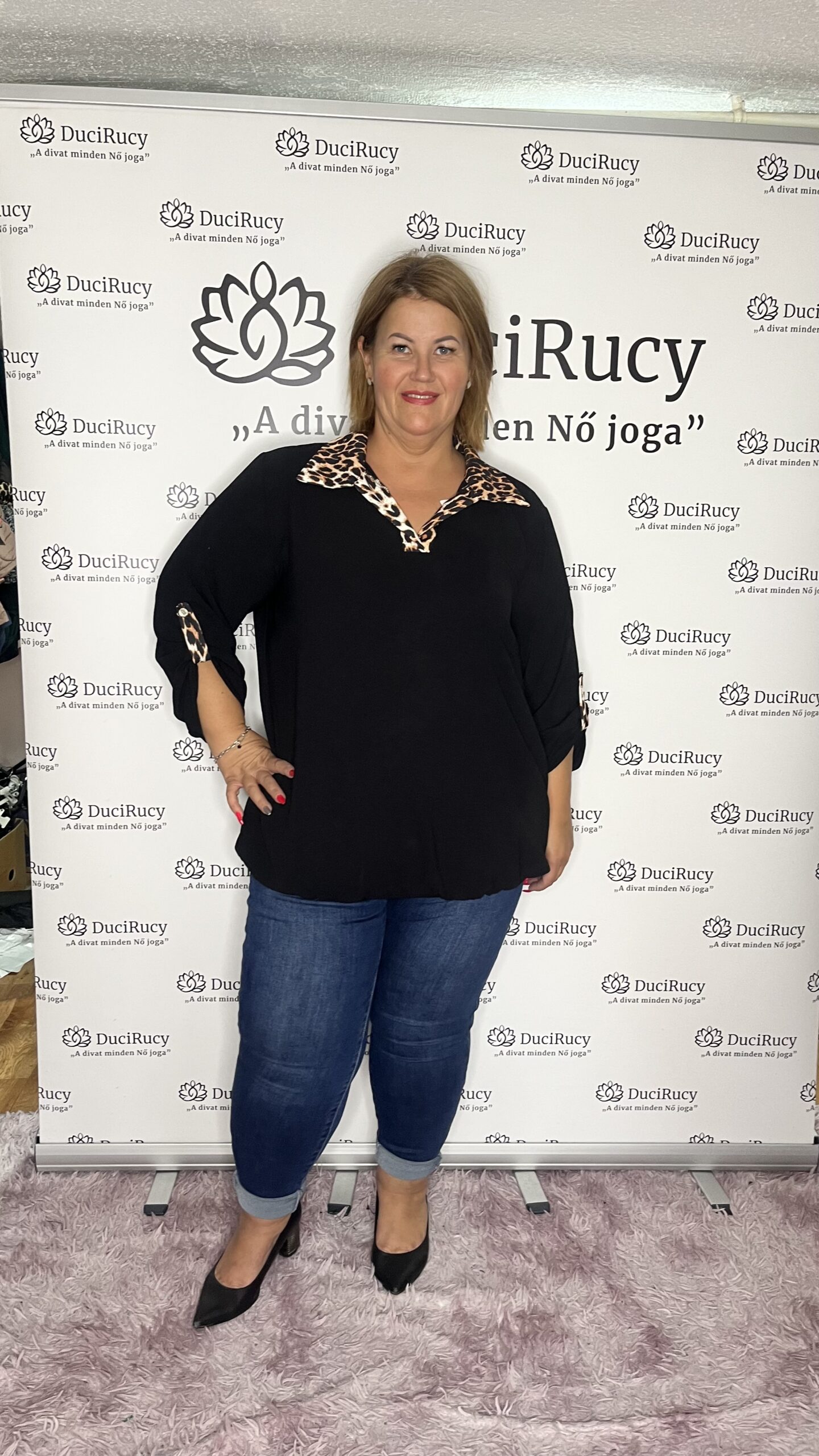 Olasz lenge anyagból készült, gumis aljú, V ingnyakú felső/blúz állatmintás gallérral. Remek viselet akár nadrághoz, akár szoknyához is.