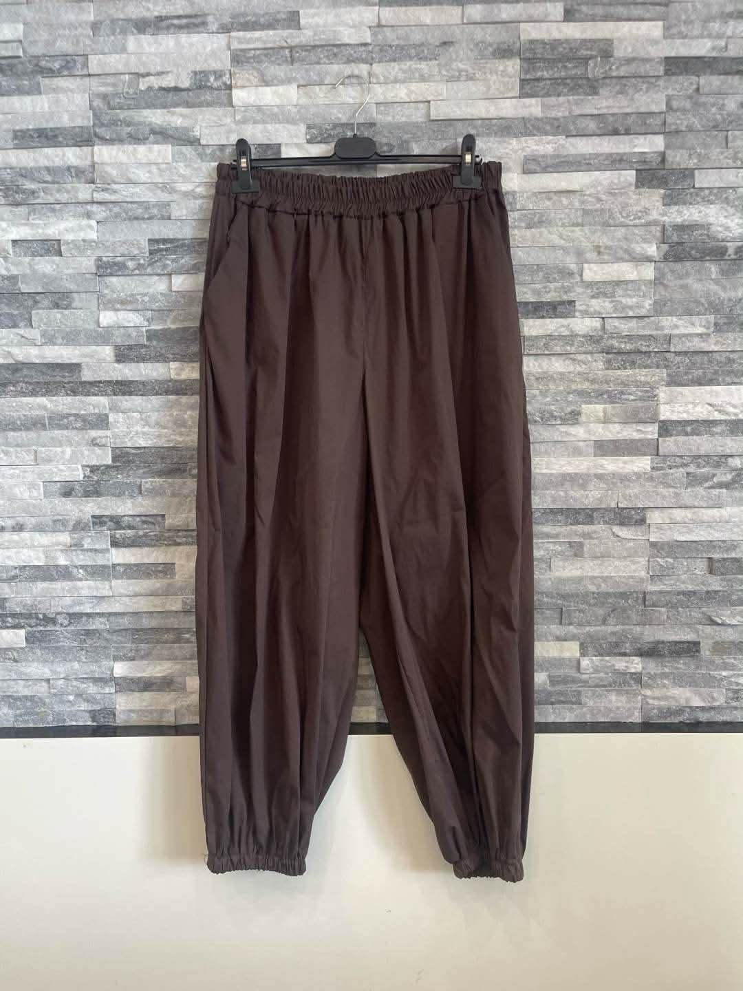 Gumis derekú és aljú, bővebb fazonú nyári nadrág csokibarna színben