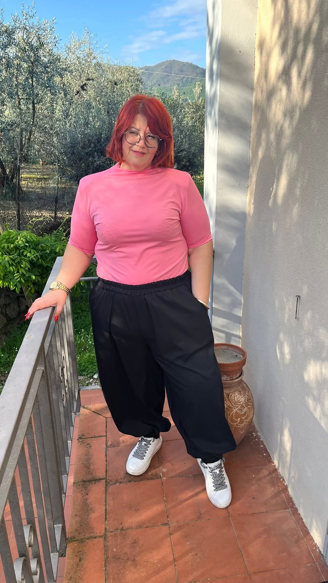 Igazi nyári, könnyed anyagú, gumis aljú és derekú, bő fazonú zsebes nadrág. A nadrág anyaga nem rugalmas.