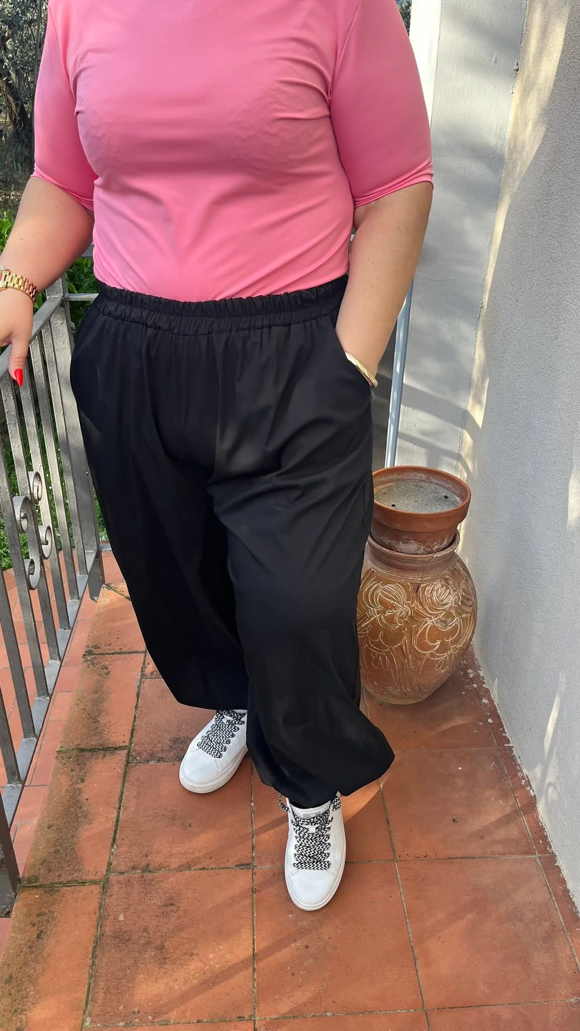 Gumis derekú és aljú, bővebb fazonú nyári nadrág fekete színben
