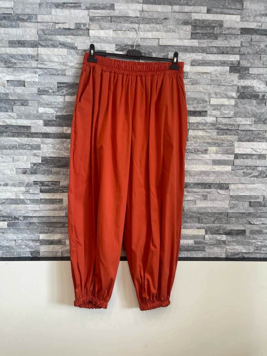 Gumis derekú és aljú, bővebb fazonú nyári nadrág terrakotta színben