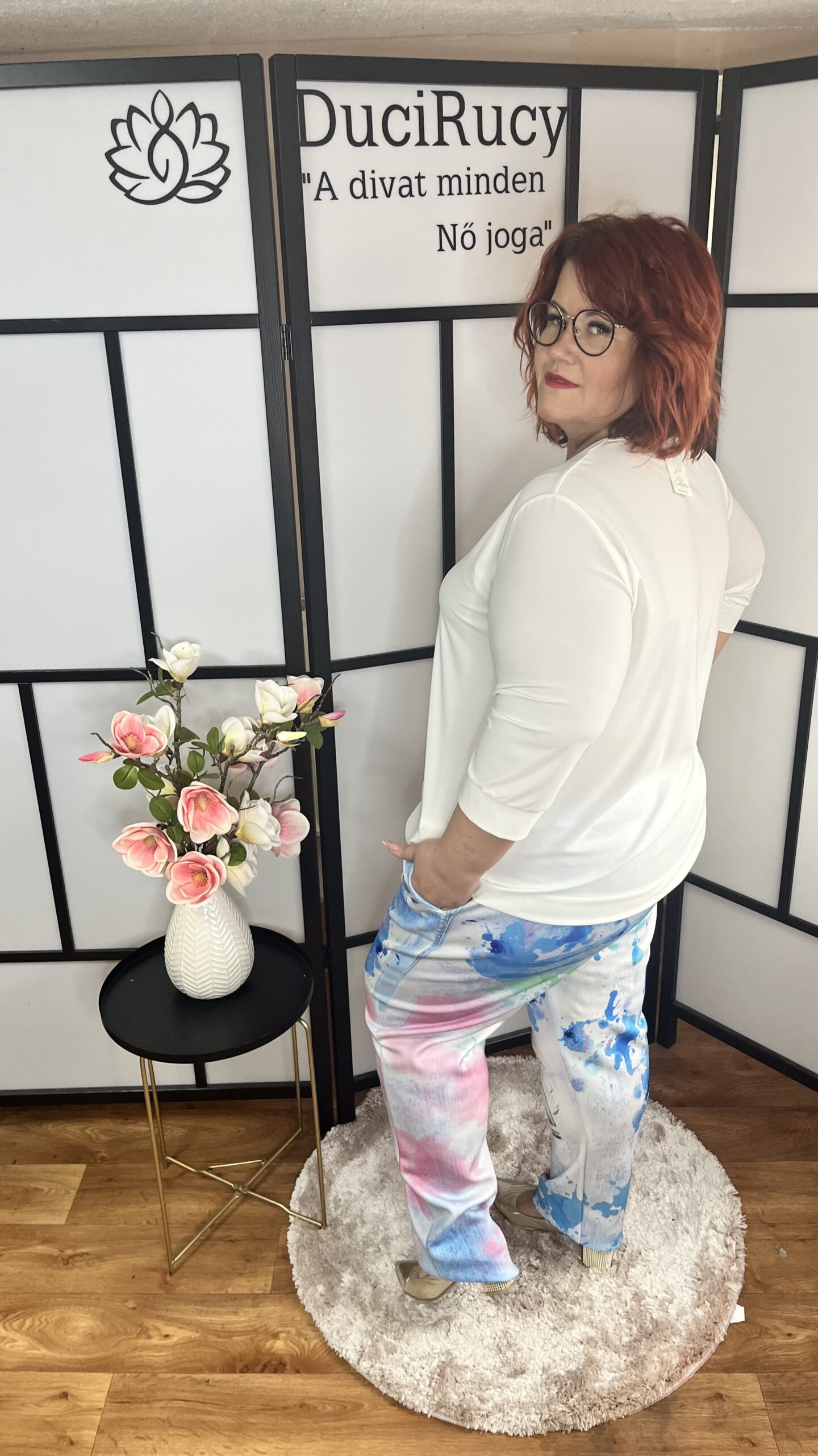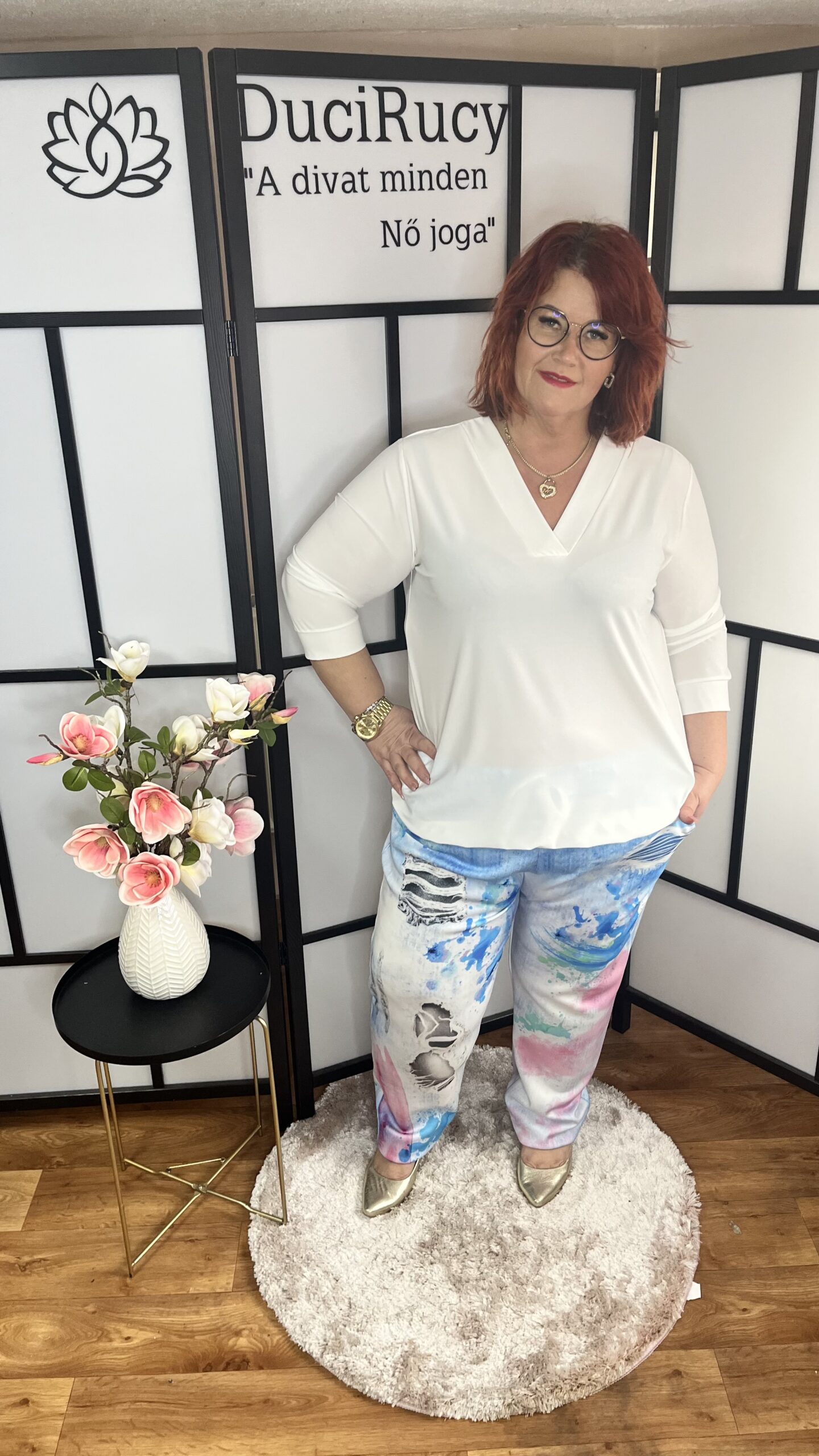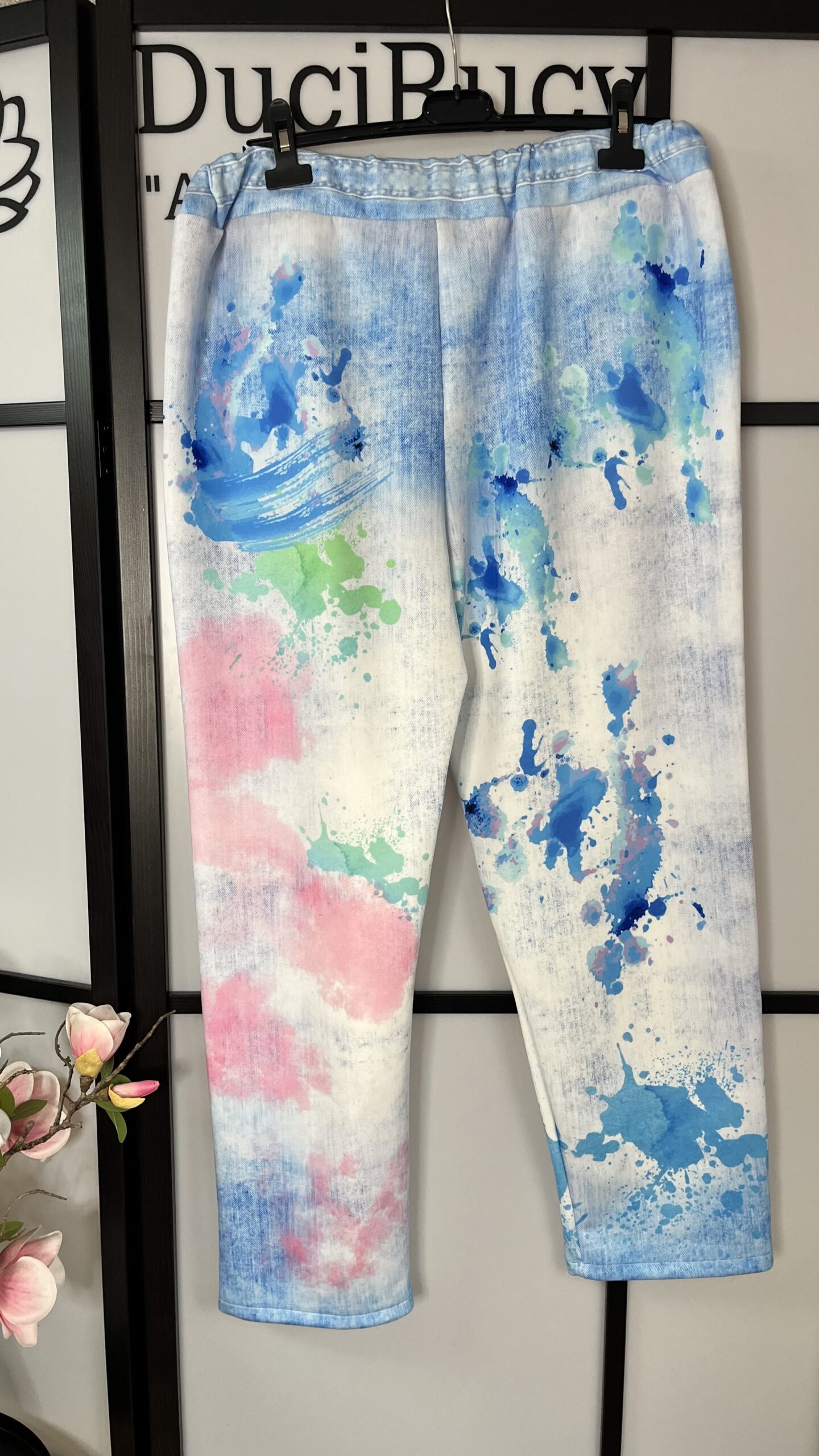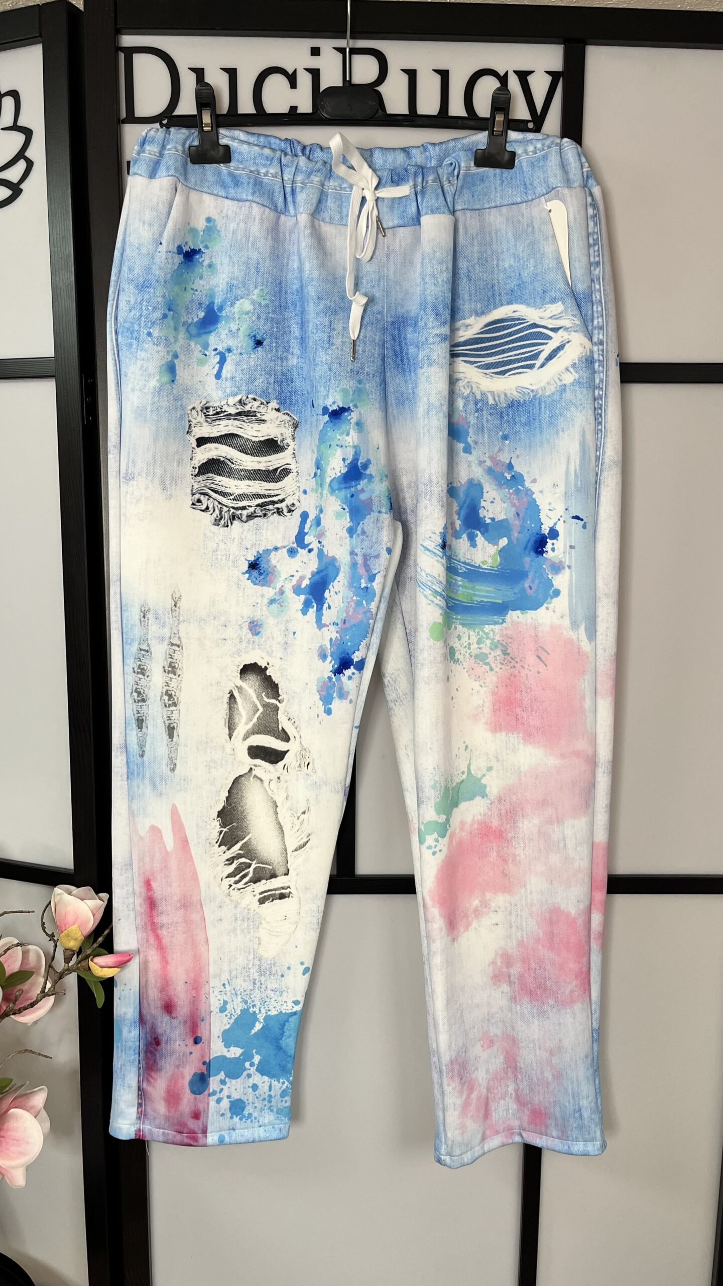 Nagyon divatos, gumis derekú, mintás farmerhatású vászon nadrág. Igazán mutatós darab, magas derékrésszel. A nadrág anyaga rugalmas.