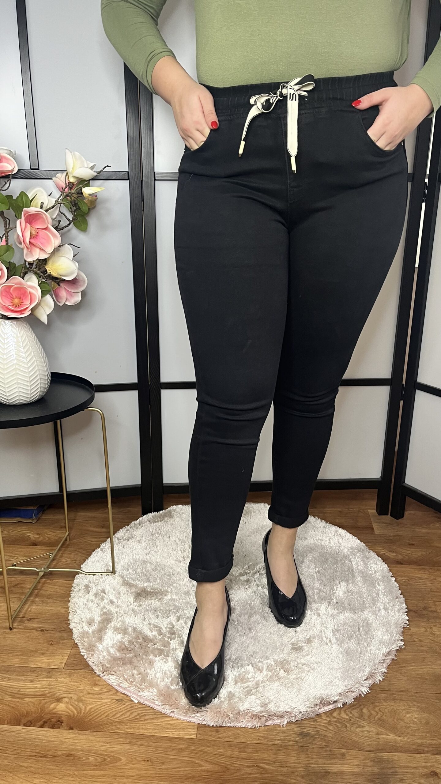 Gumis derekú, push up fazonú, szűkszárú farmernadrág fekete színben