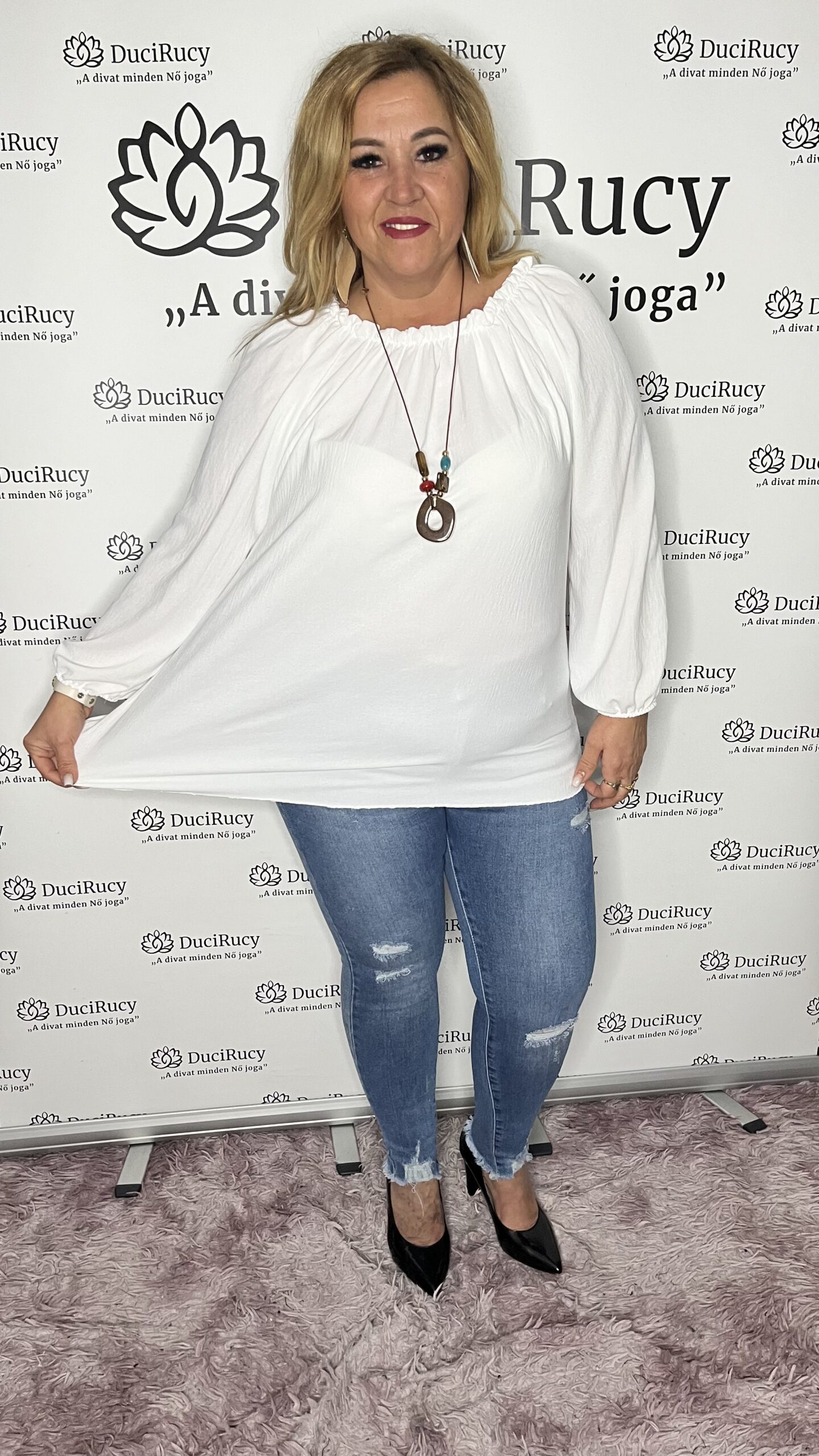 Gumis nyakú olasz felső ajándék nyaklánccal fehér színben