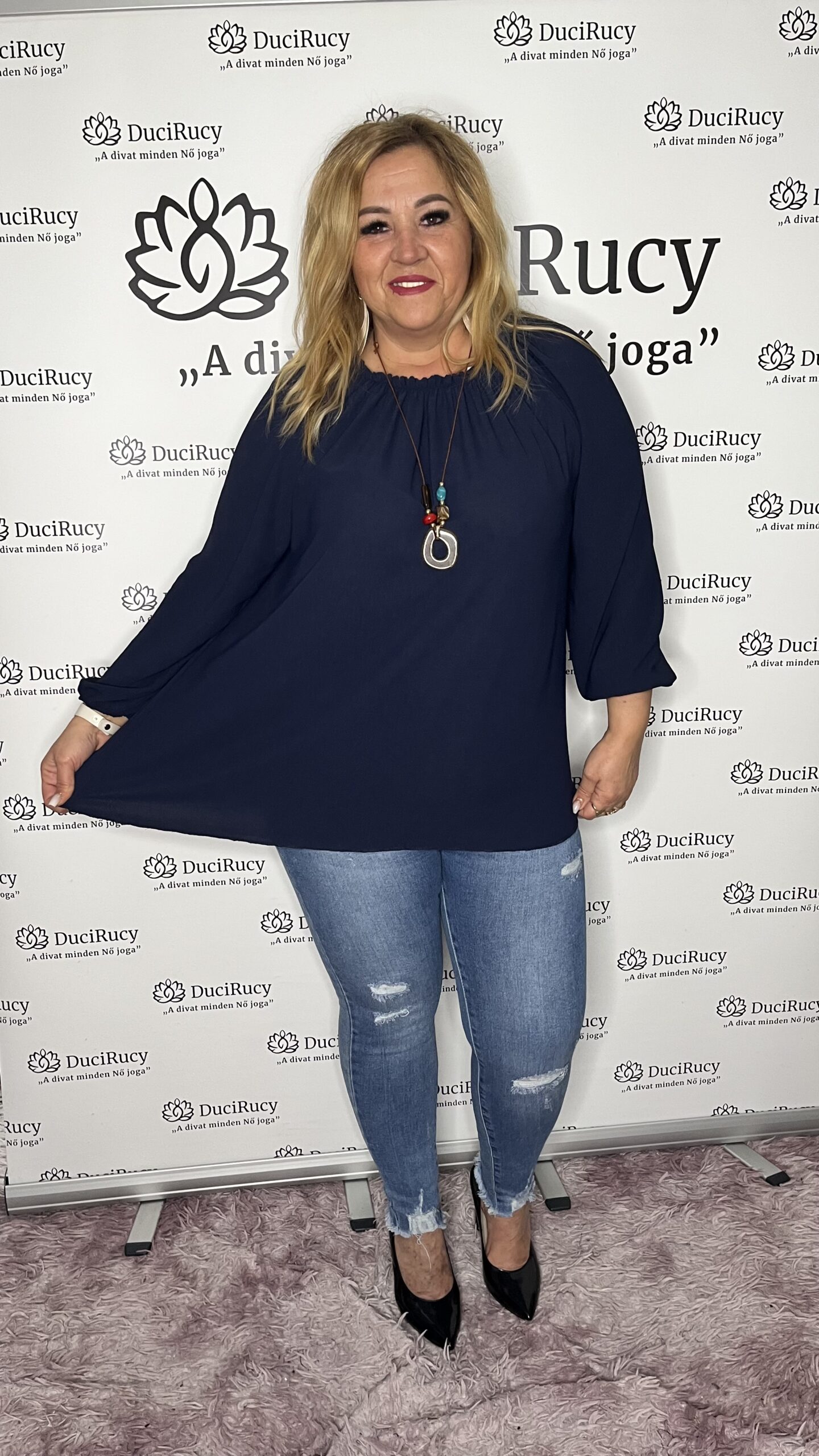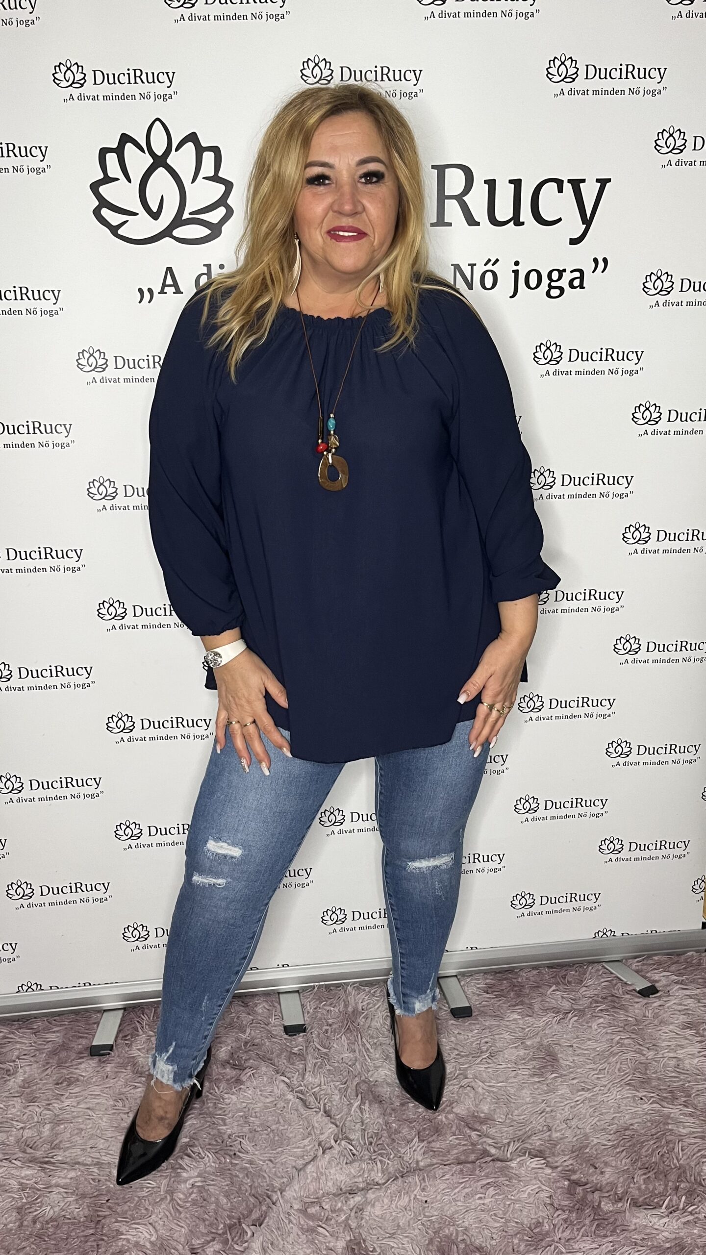 Gumis nyakú olasz felső ajándék nyaklánccal sötétkék színben