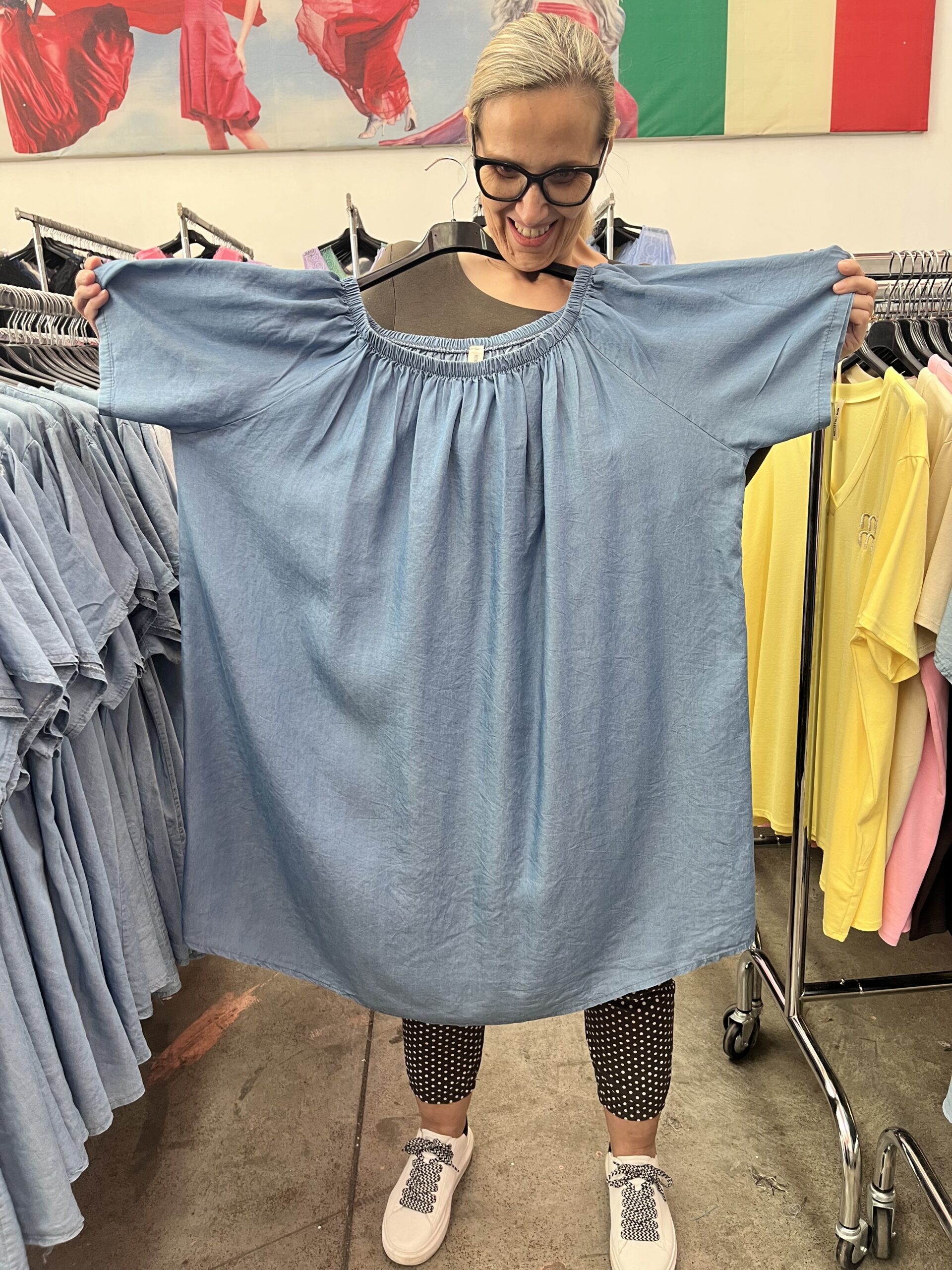 Gumis nyakú, vékony farmer anyagú lenge ruha világoskék színben