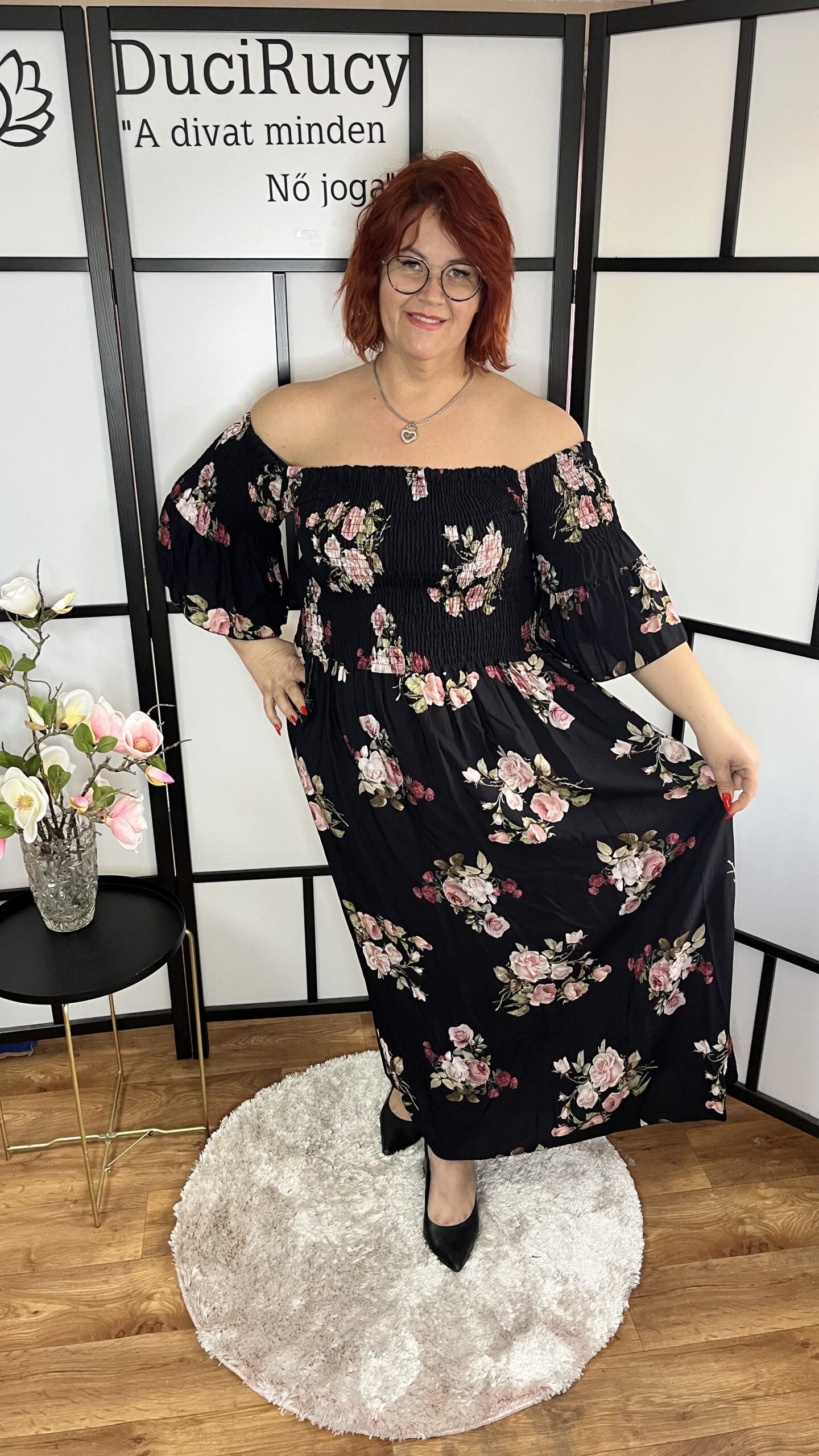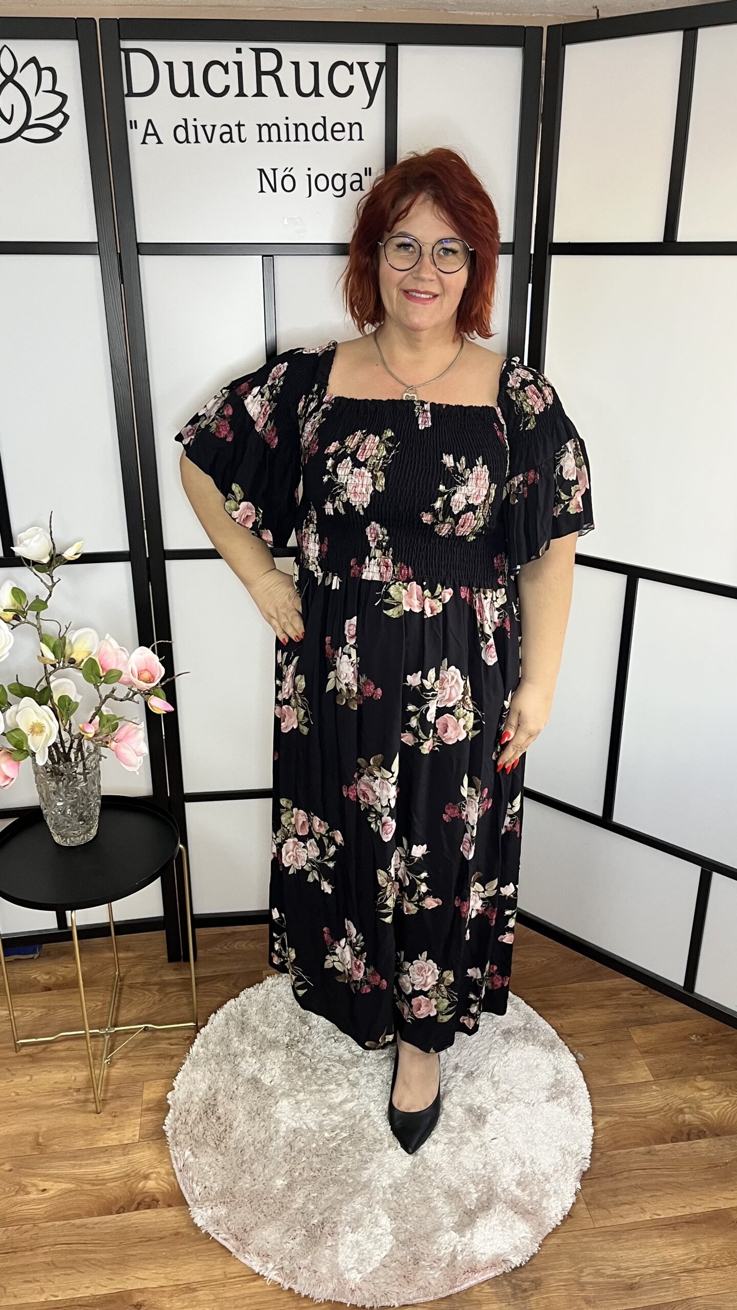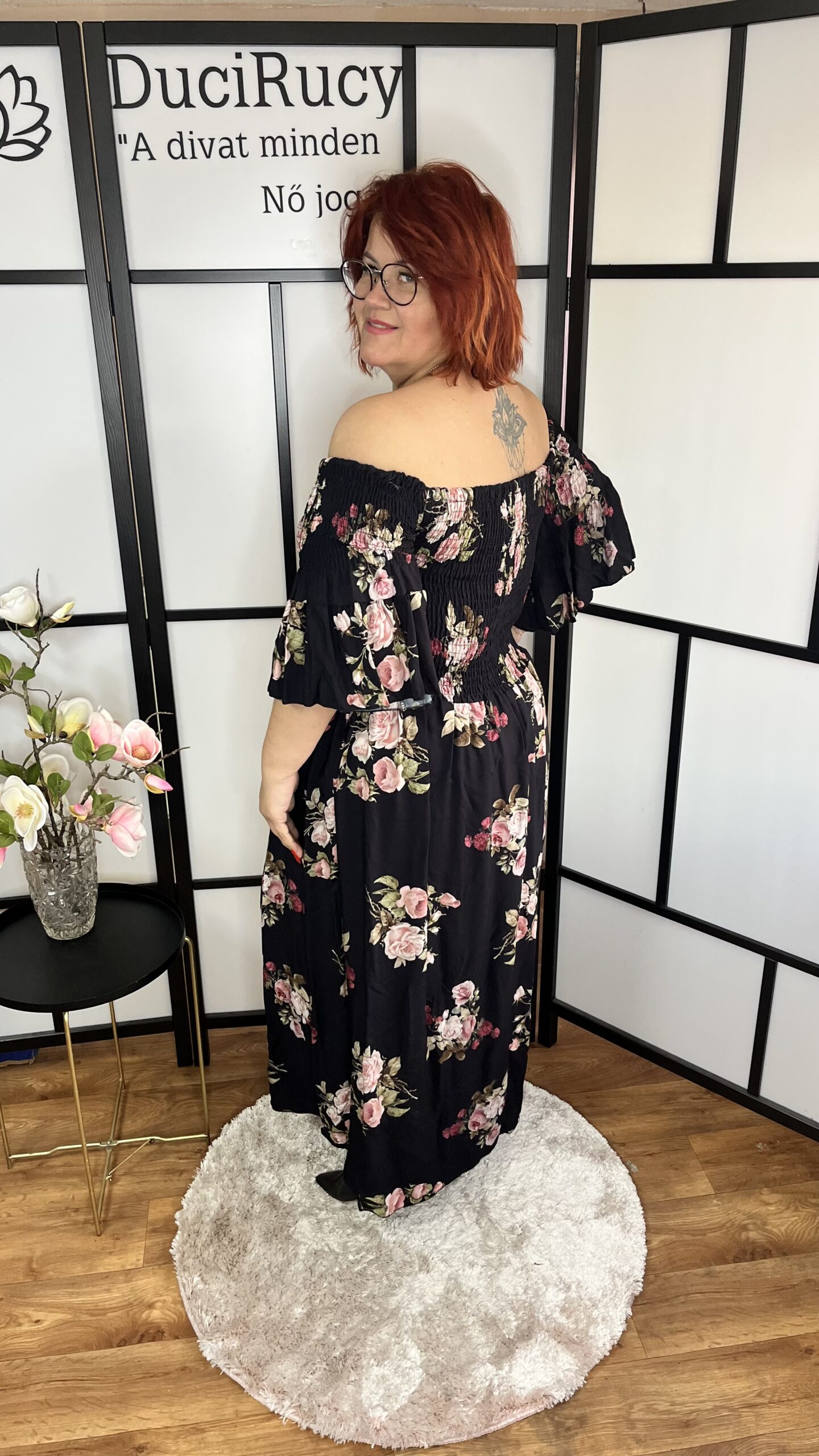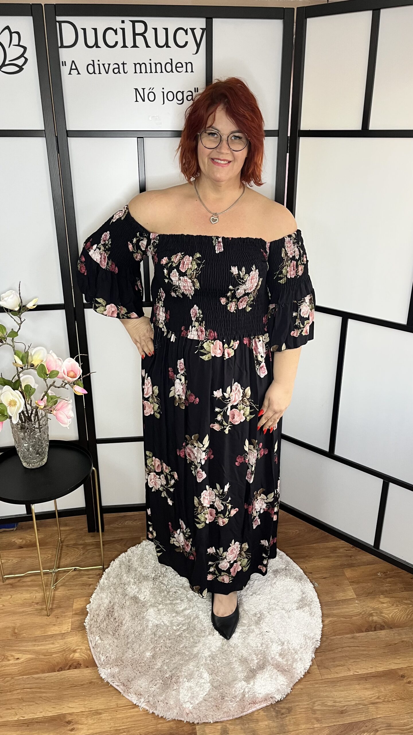 Gumírozott tetejű, vállra lehúzható (Carmen fazonra), fantasztikusan kellemes flokon anyagból készült, nyári maxi ruha fodros ujjal. Igazán trendi, mutatós darab.