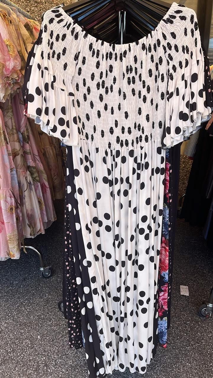 Gumis tetejű flokon maxi ruha fehér-fekete pöttyös
