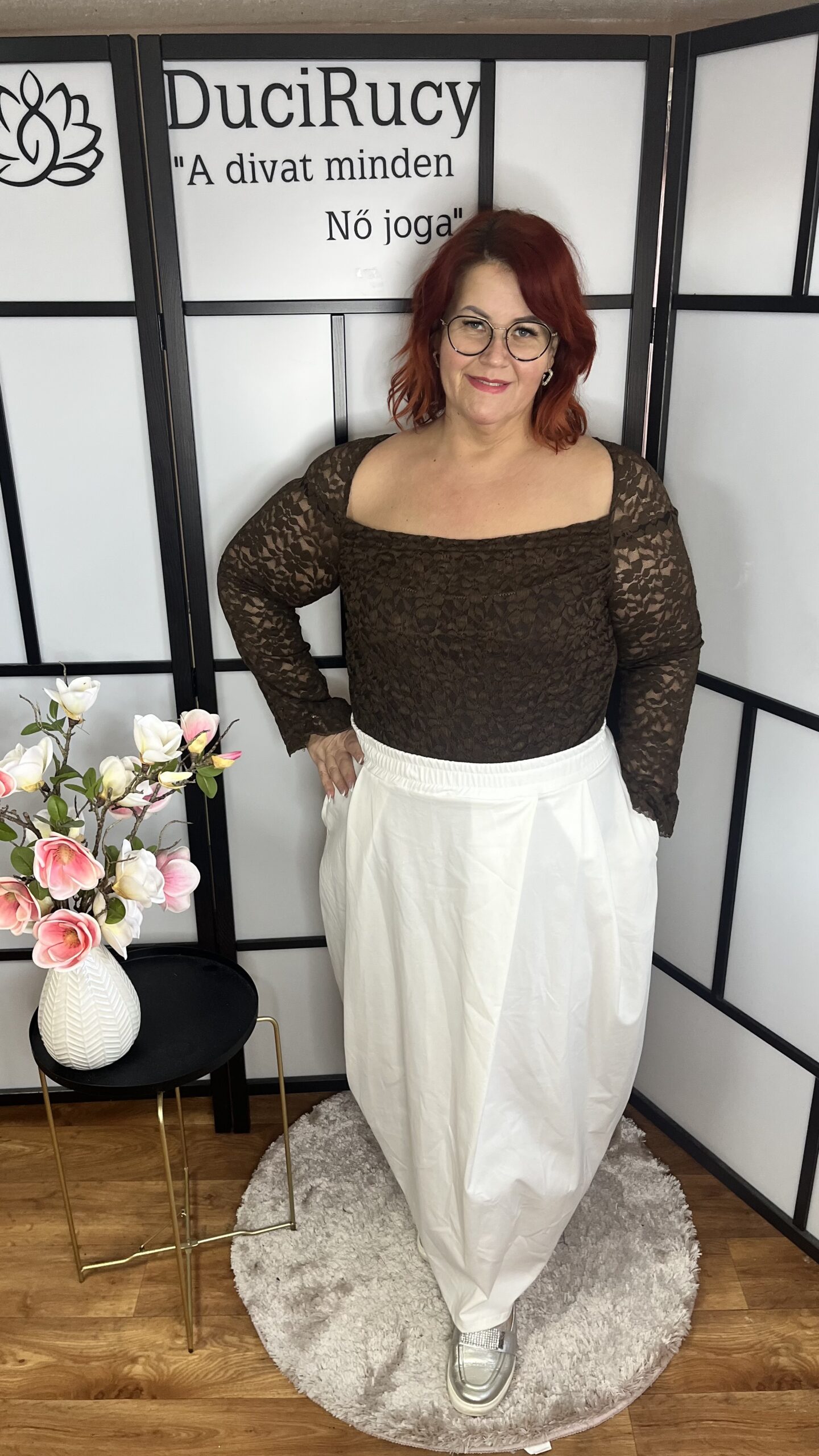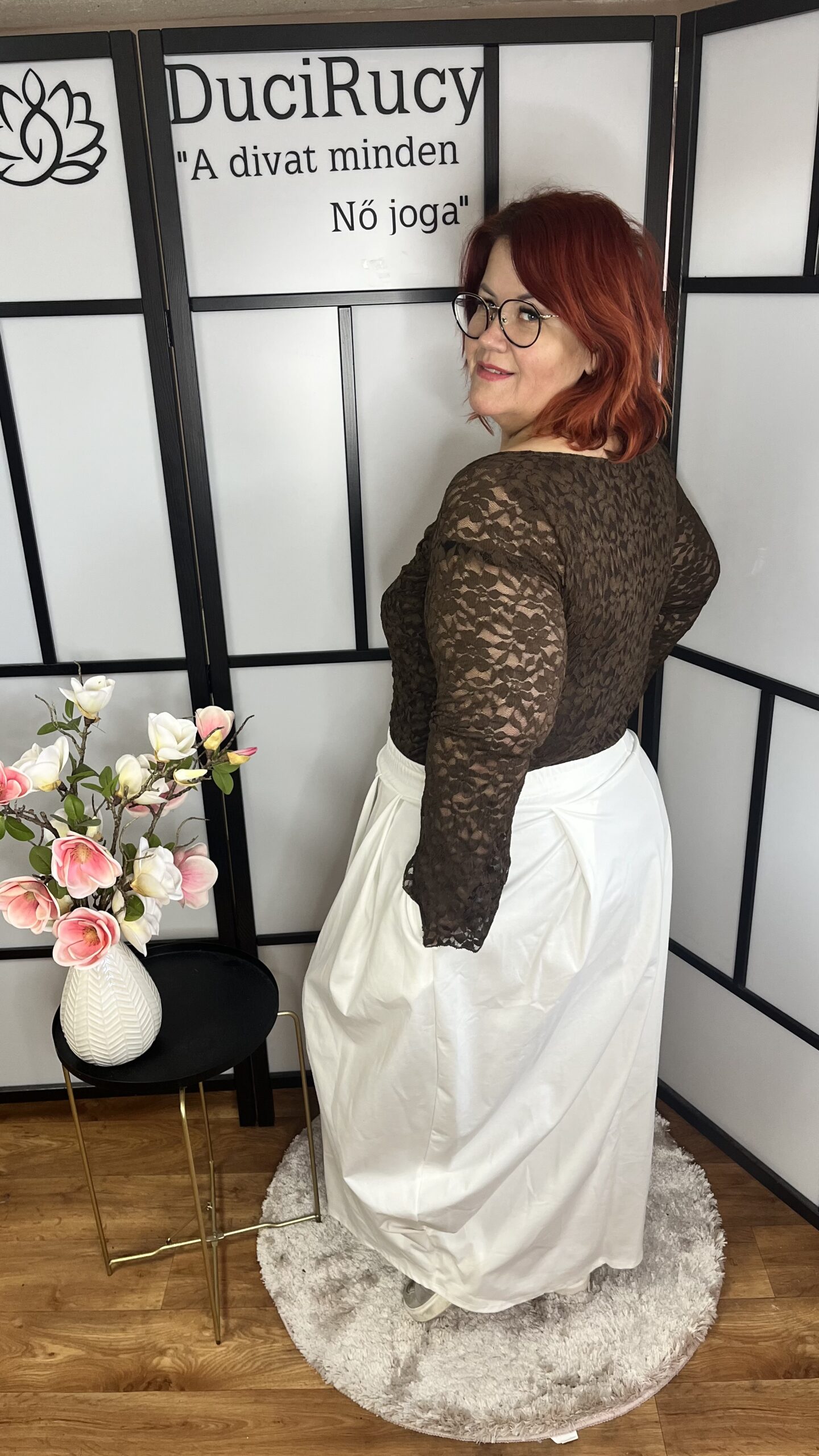 A modell mellbősége 120 cm, csípőbősége 134 cm, magassága 166 cm.