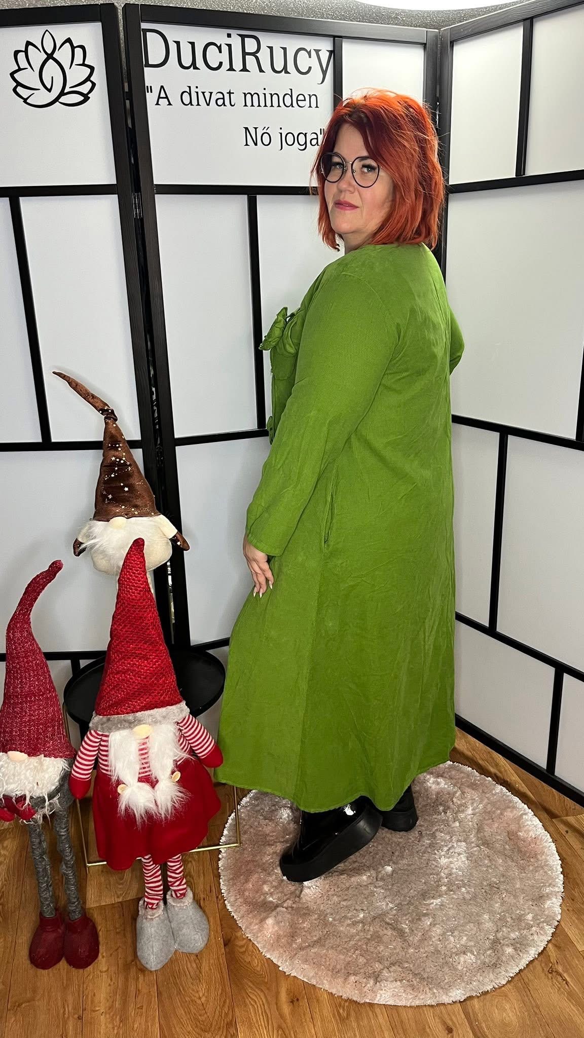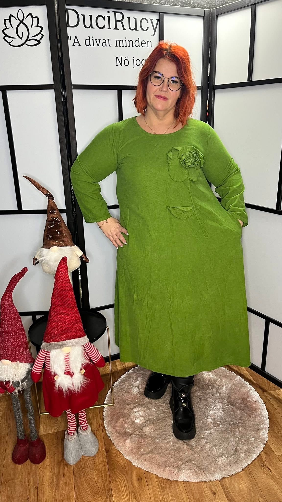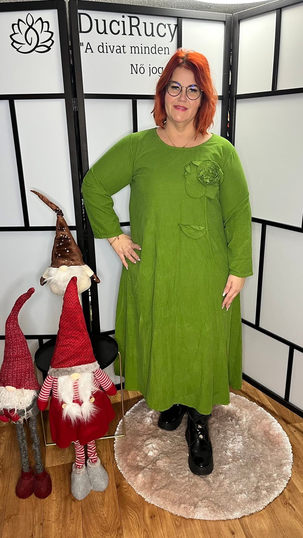 Gyönyörű mikrokord anyagból készült maxi ruha 3D virággal díszítve oliva színben