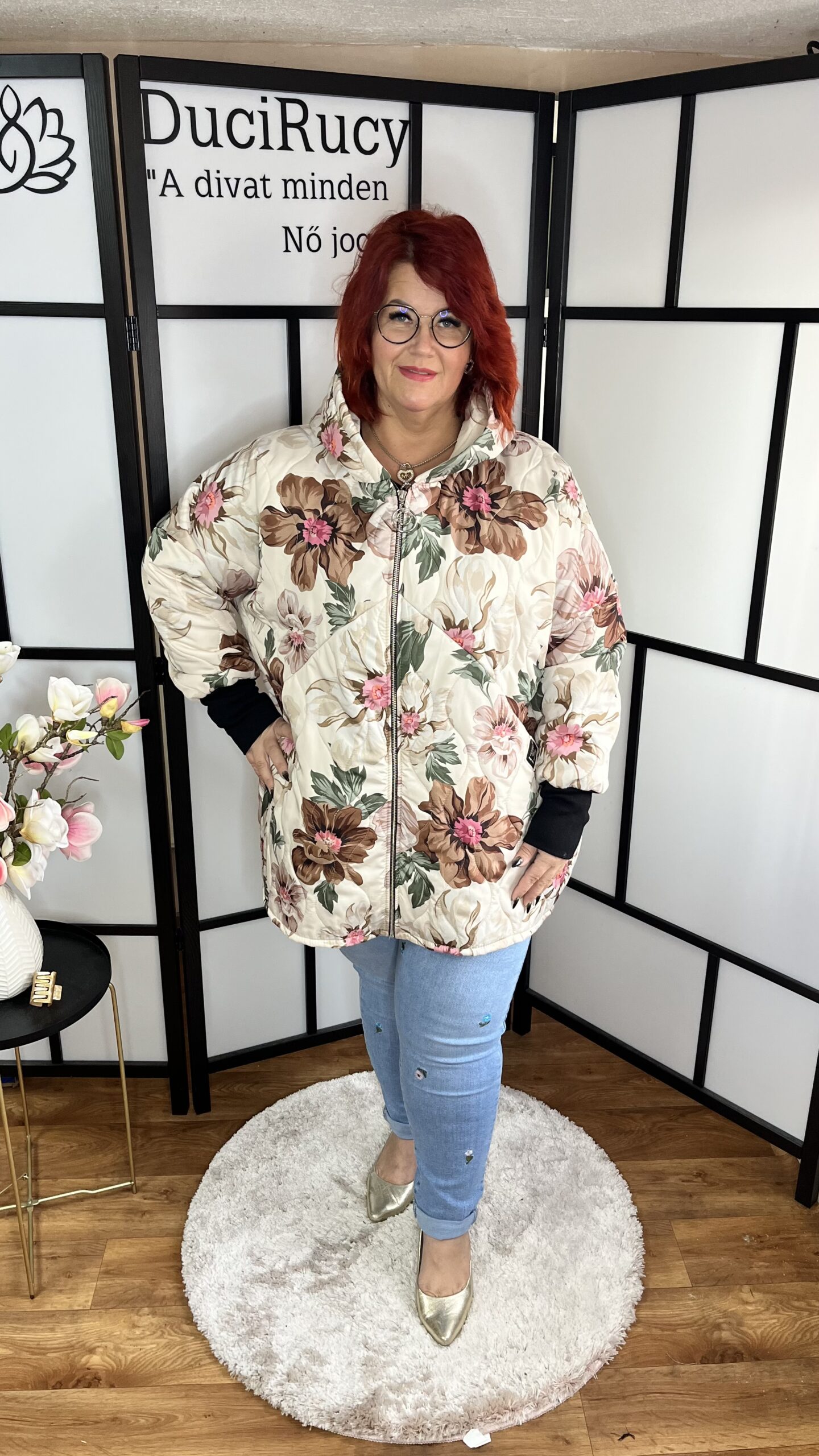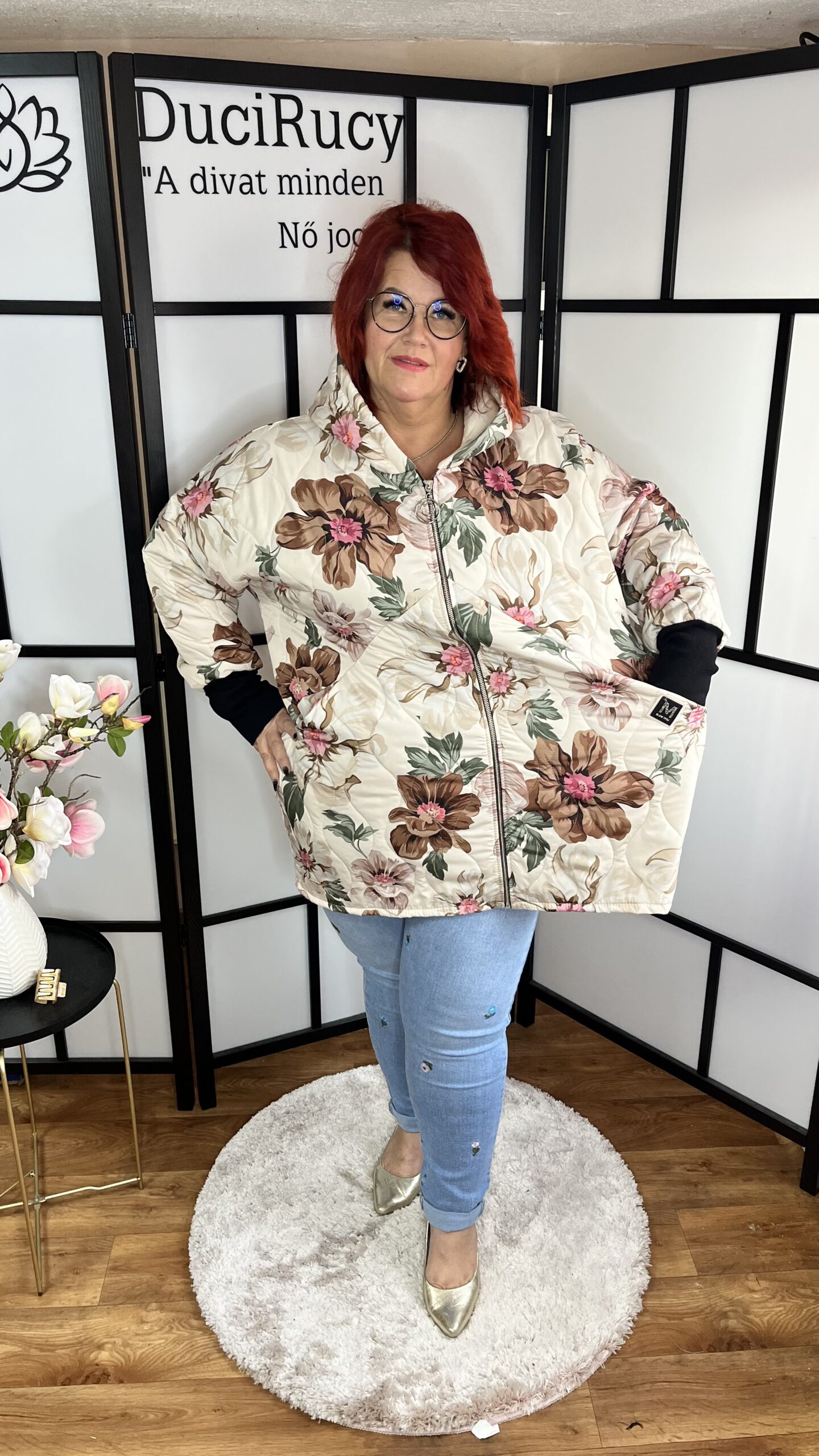 A modell is ezt a méretet viseli. Az Ő méretei: mellbőség 120 cm, csípőbőség 134 cm, magassága 166 cm