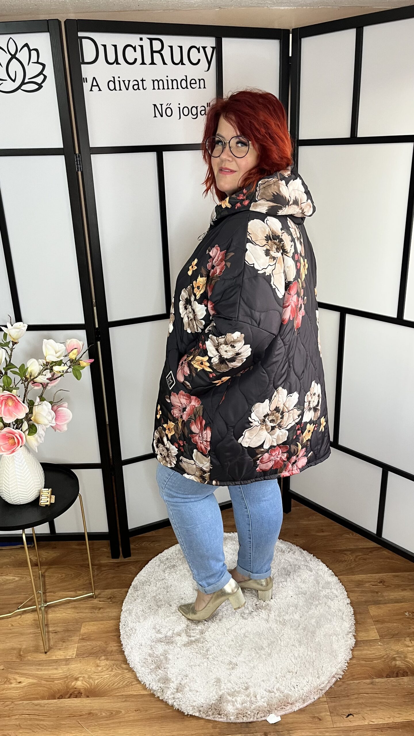 A modell is ezt a méretet viseli. Az Ő méretei: mellbőség 120 cm, csípőbőség 134 cm, magassága 166 cm