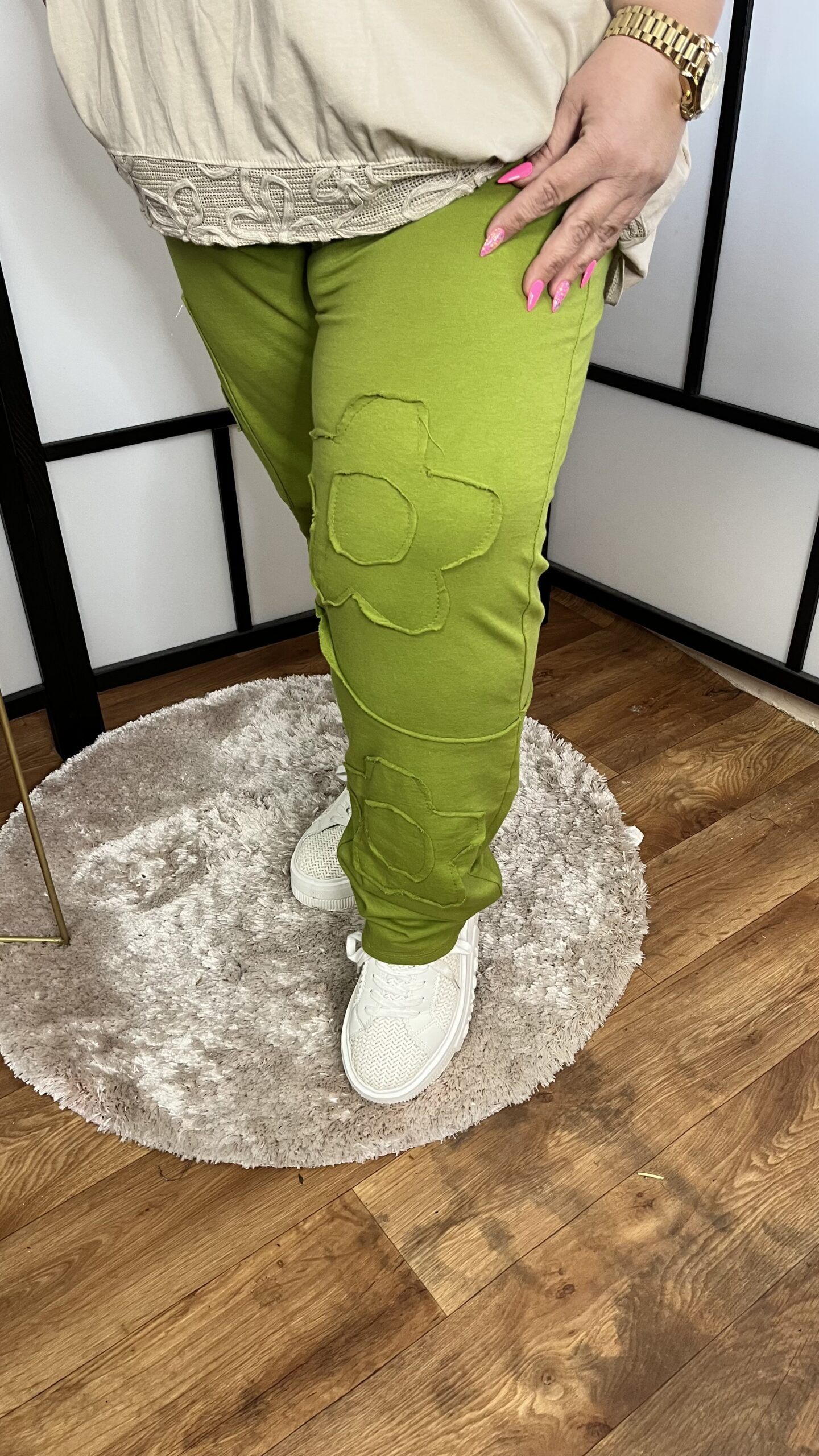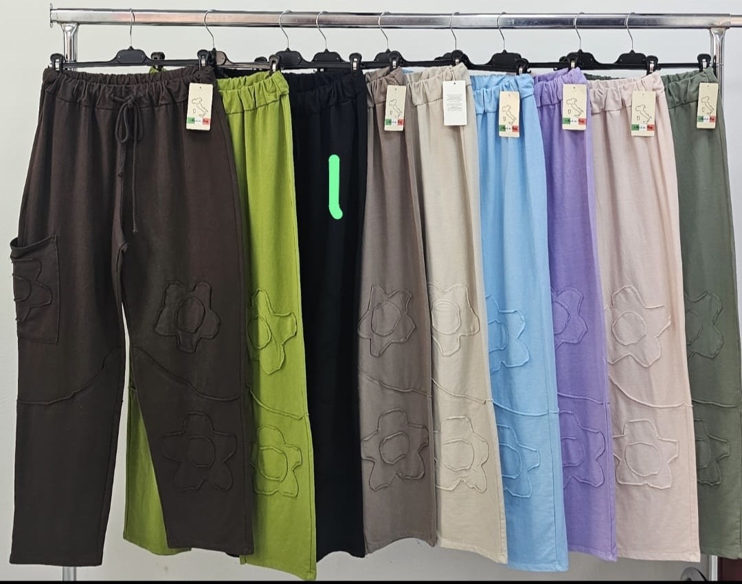 Gyönyörű egyedi olasz tervezésű prémium minőségű PAMUT anyagból készült gumis derekú, egyenesebb, bő szabású nadrág rávarrt zsebekkel és virággal díszítve.