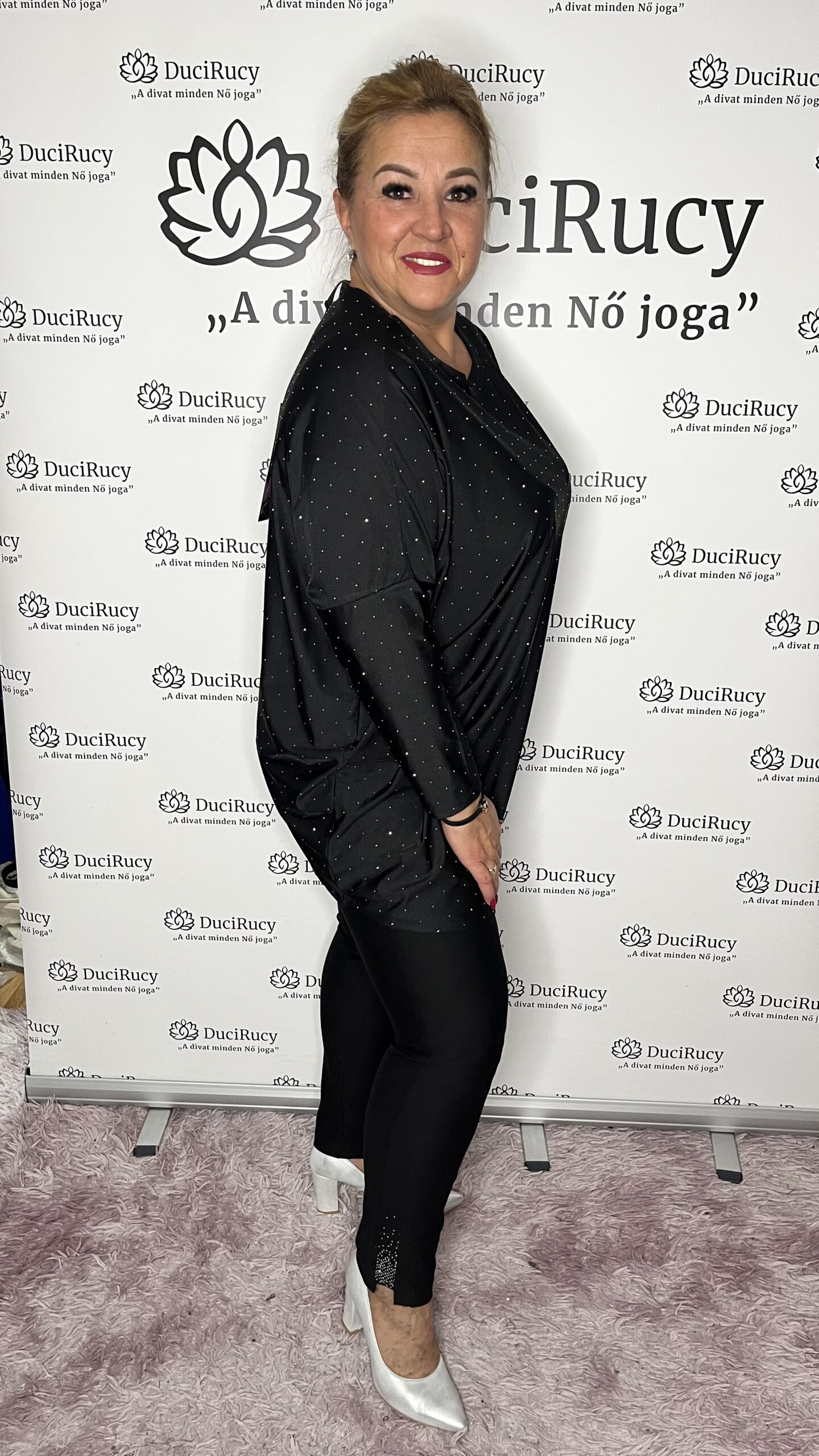 A képeken a modell is ezt a méretet viseli. A modell méretei: mell- és csípőbőség 120 cm, magassága 167 cm.