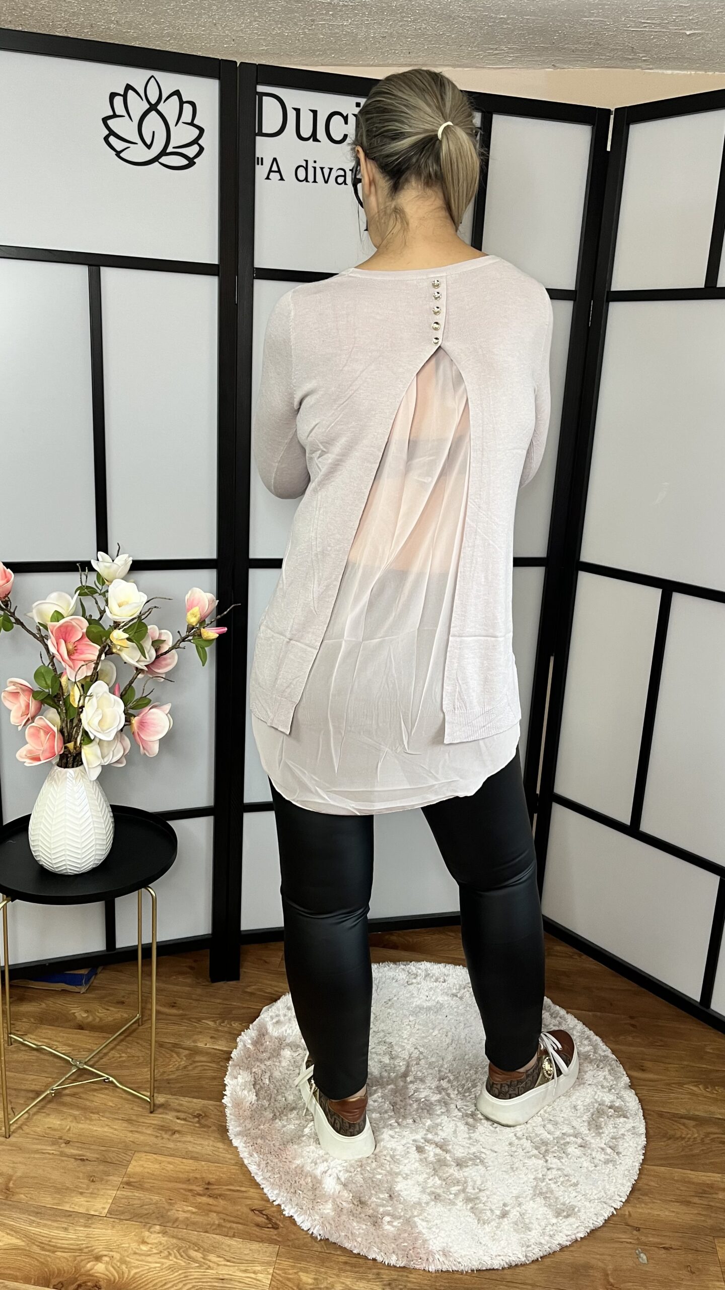 Hátul muszlin ing betéttel díszített gépi kötött felső világos bézs színben